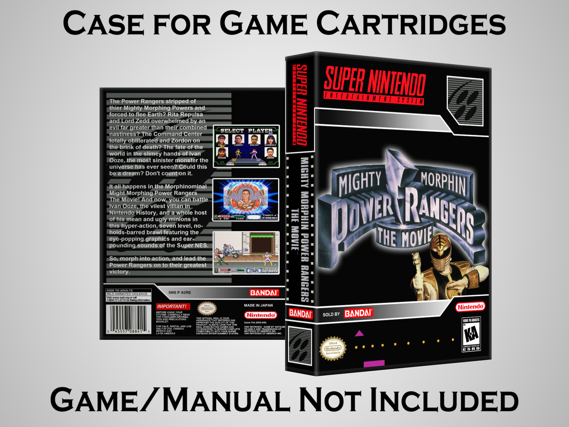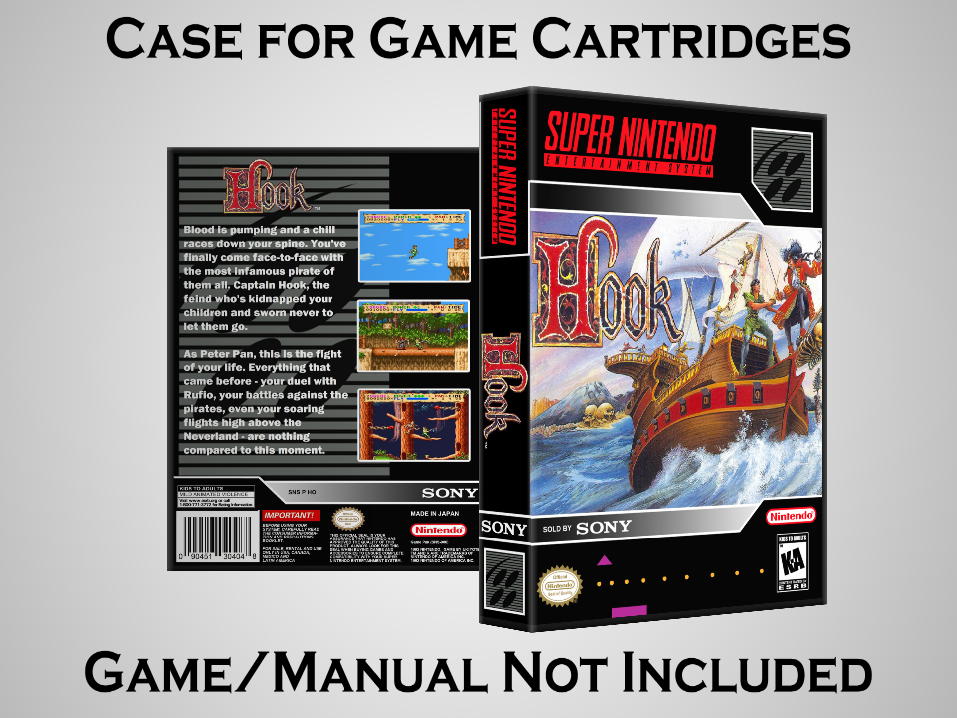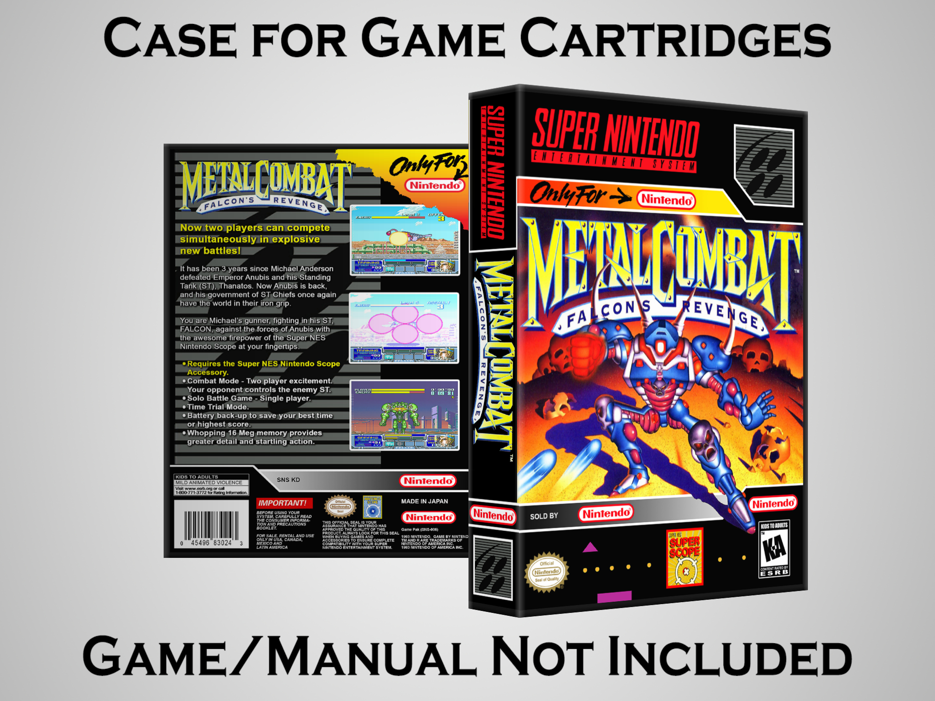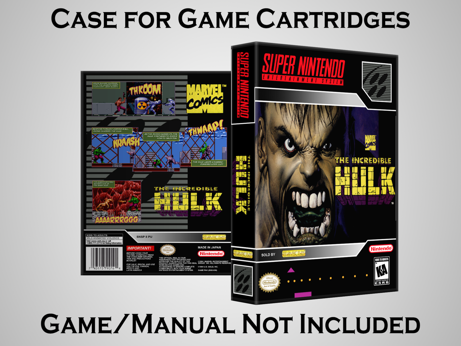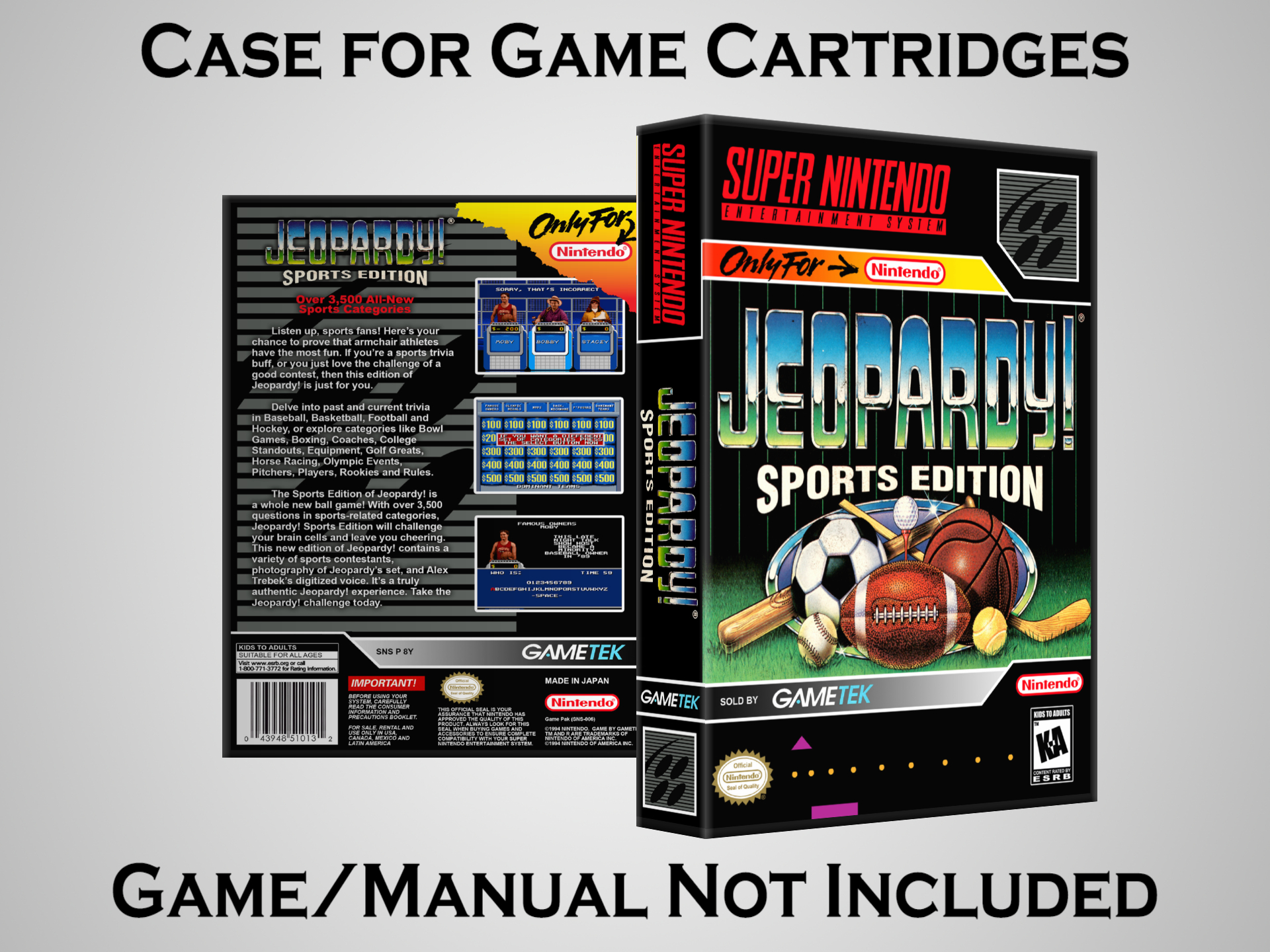 NO GAME OR MANUAL IS INCLUDED! This is NOT an original cardboard box. Case Dimensions : 7.25" x 5.25" x 1.125" Case Color : Dark Grey These cases are designed specifically to hold your Super Nintendo (SNES) cartridges. These are not the low quality Universal Game Cases that most other sellers offer. These firmly hold your cartridges in place, and include clips on the opposite side to hold the instruction manuals if you have them. Our Super Nintendo cases are split into multiple listings alphabetically due to the limit on options in one listing. You can find the rest of our cases in the following links: SNES Cases from # to F SNES Cases from G to N SNES Cases from O to S SNES Cases from T to Z Click here to find more cases in our eBay store!