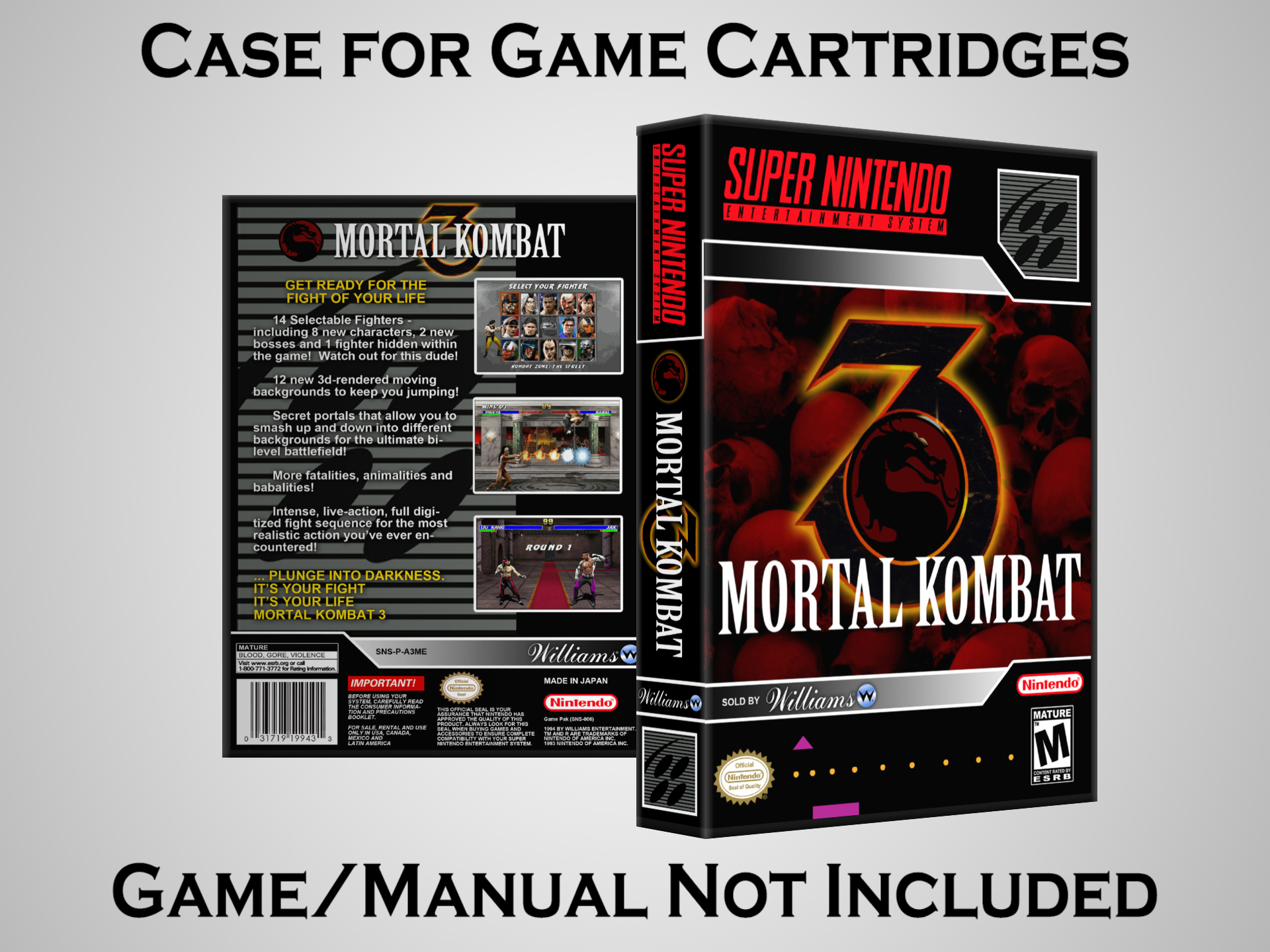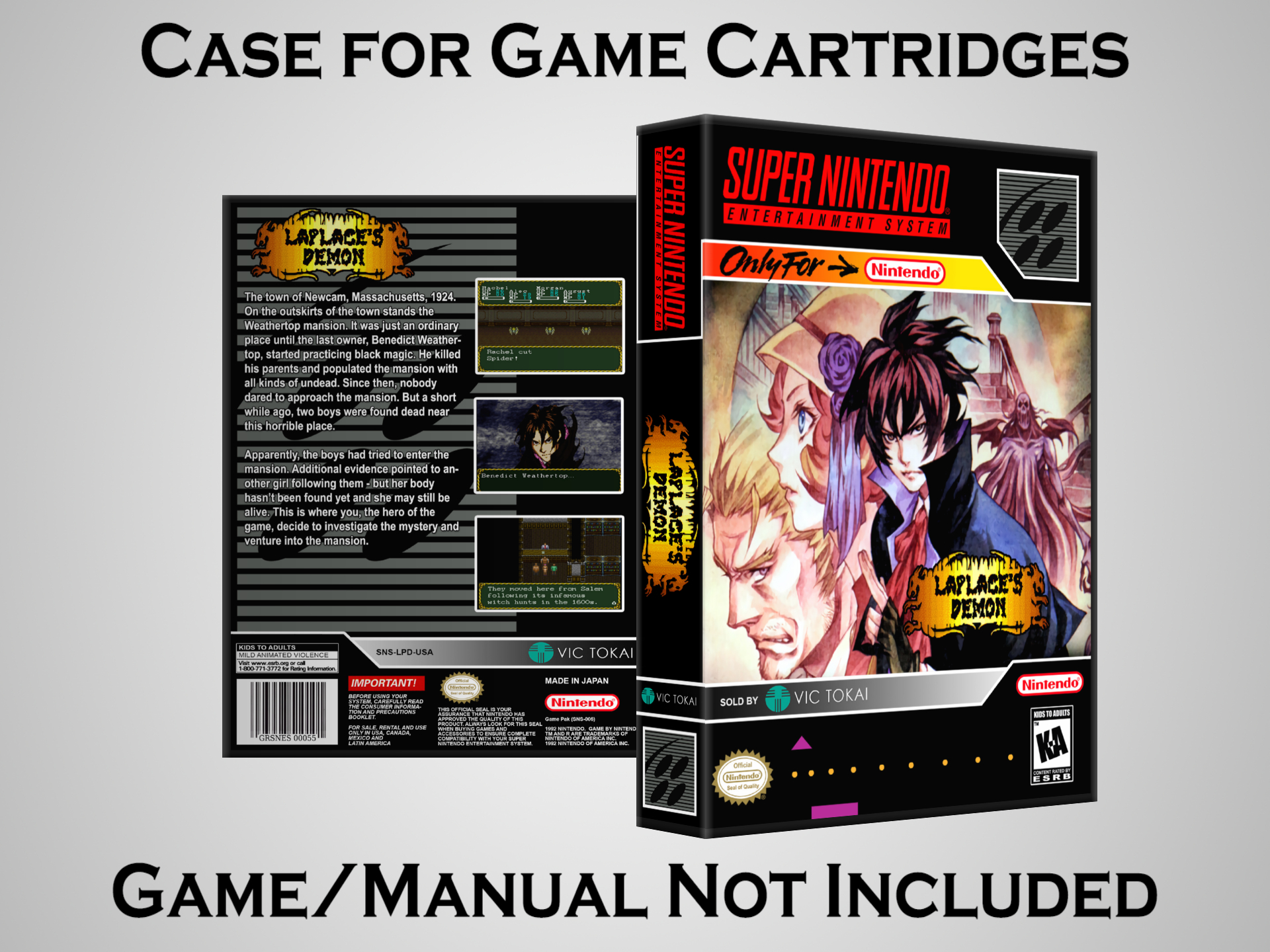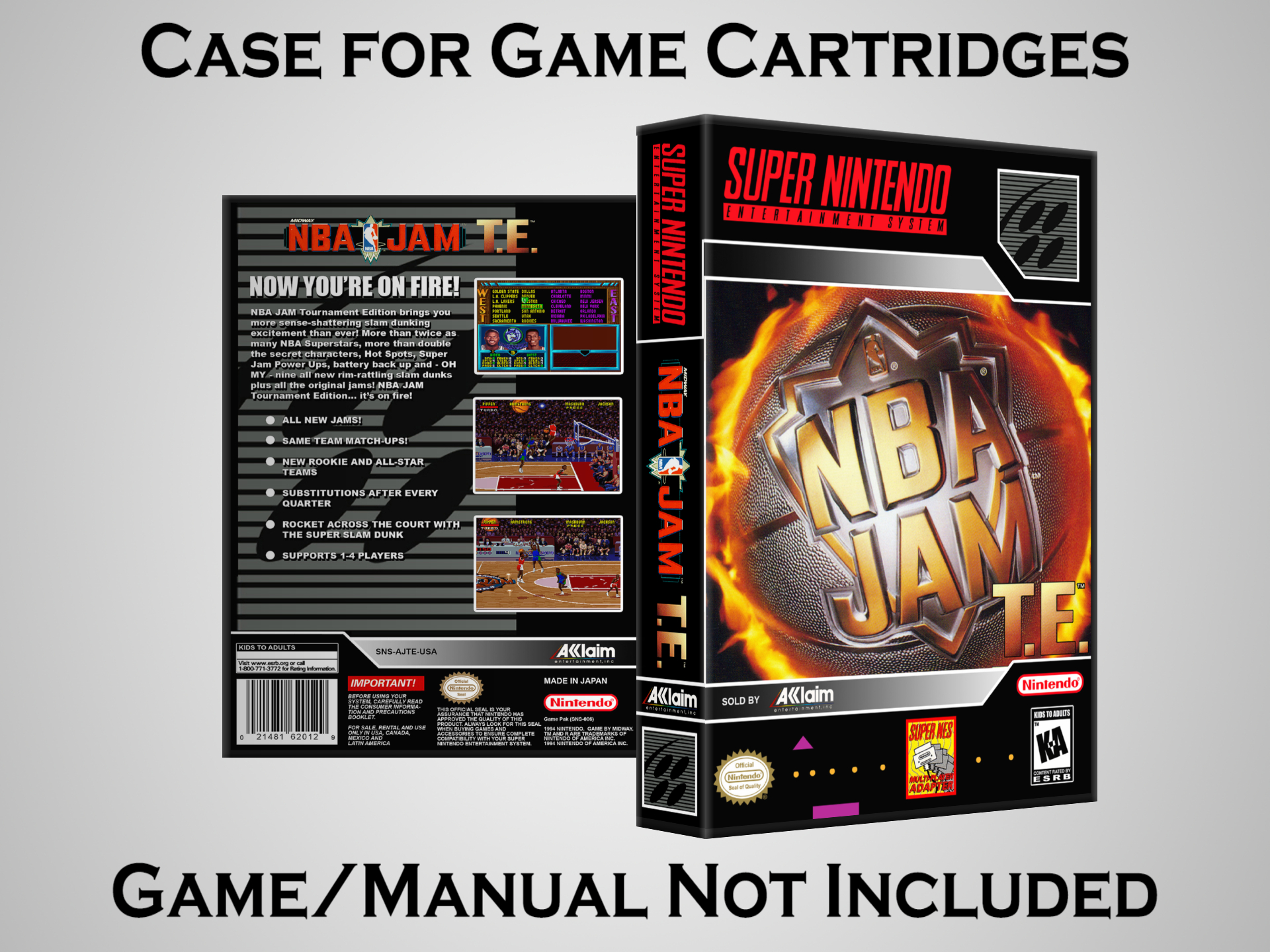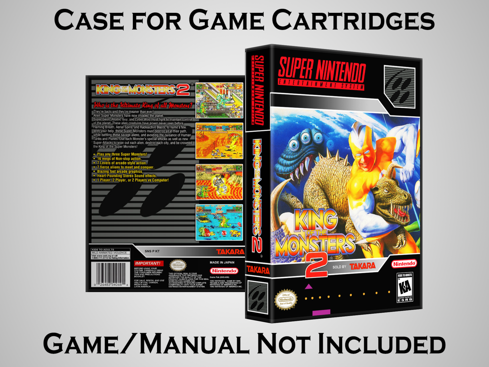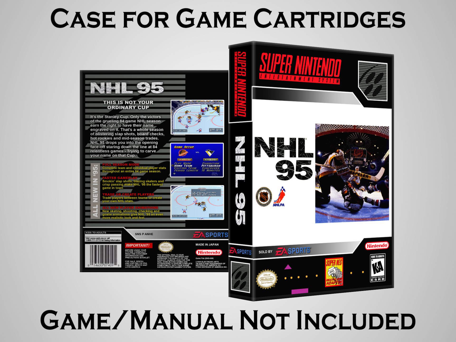NO GAME OR MANUAL IS INCLUDED! This is NOT an original cardboard box. Case Dimensions : 7.25" x 5.25" x 1.125" Case Color : Dark Grey These cases are designed specifically to hold your Super Nintendo (SNES) cartridges. These are not the low quality Universal Game Cases that most other sellers offer. These firmly hold your cartridges in place, and include clips on the opposite side to hold the instruction manuals if you have them. Our Super Nintendo cases are split into multiple listings alphabetically due to the limit on options in one listing. You can find the rest of our cases in the following links: SNES Cases from # to F SNES Cases from G to N SNES Cases from O to S SNES Cases from T to Z Click here to find more cases in our eBay store!