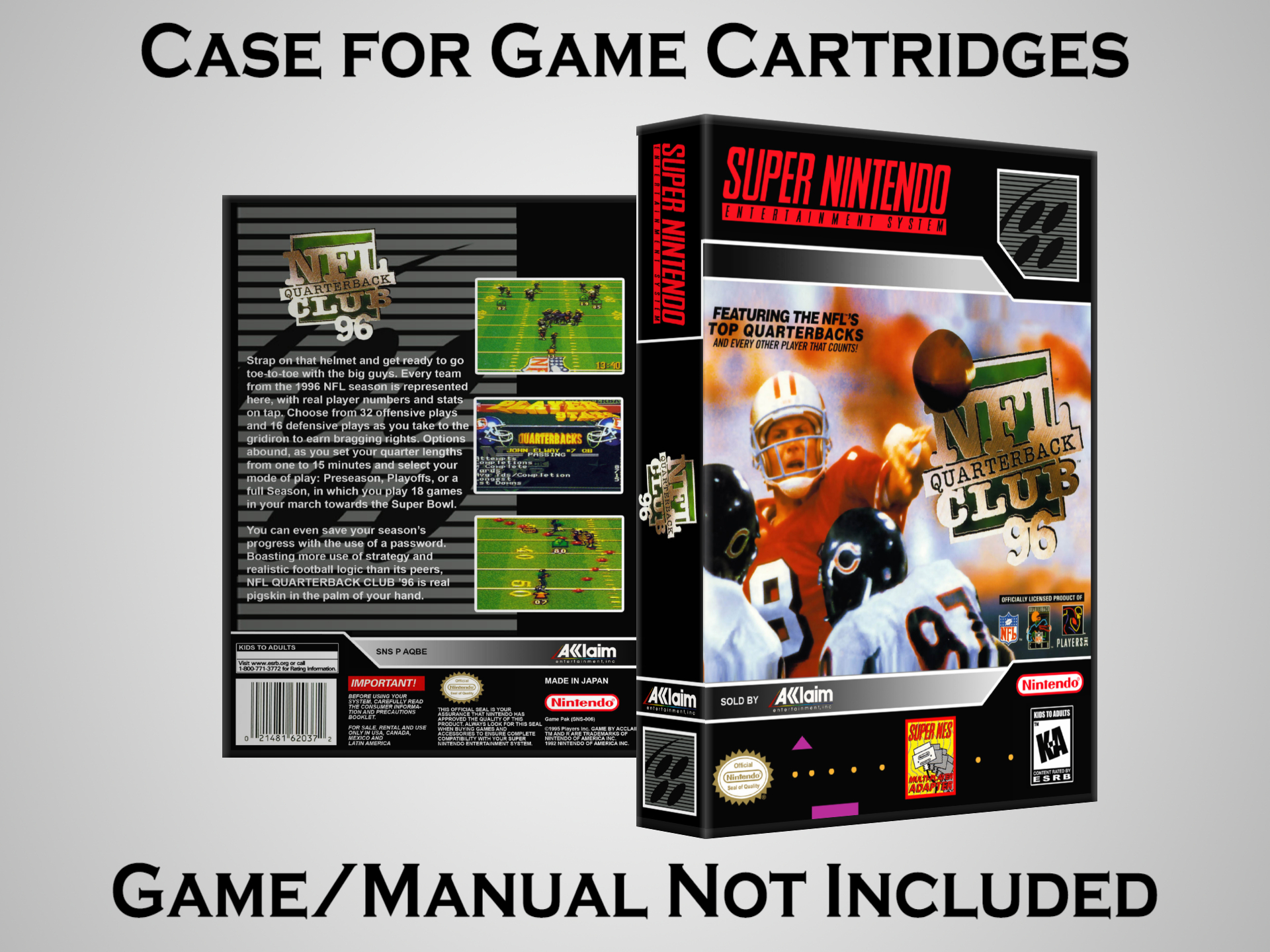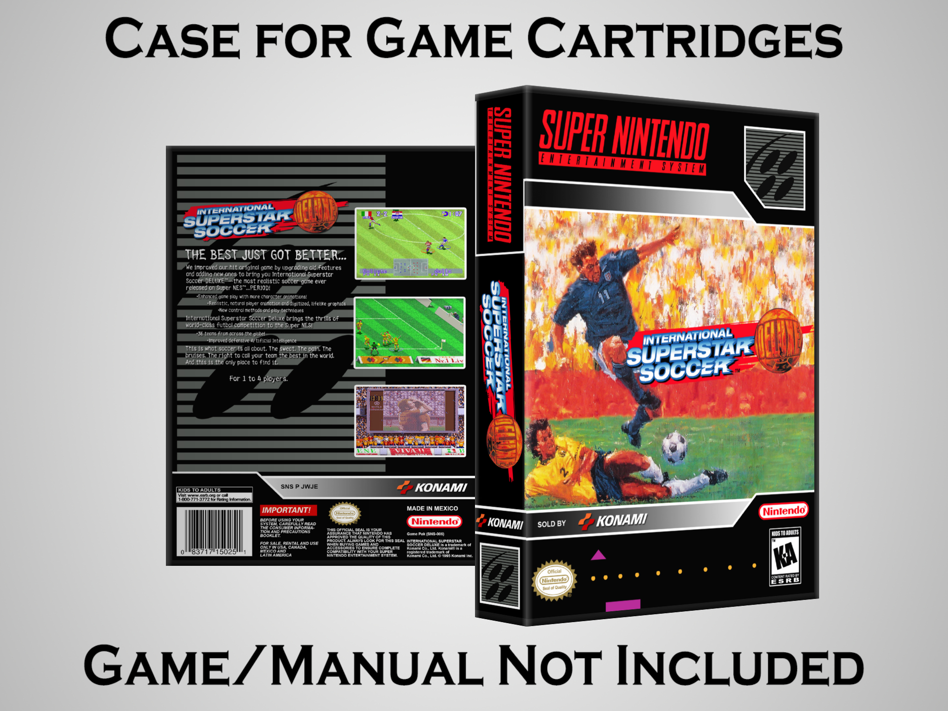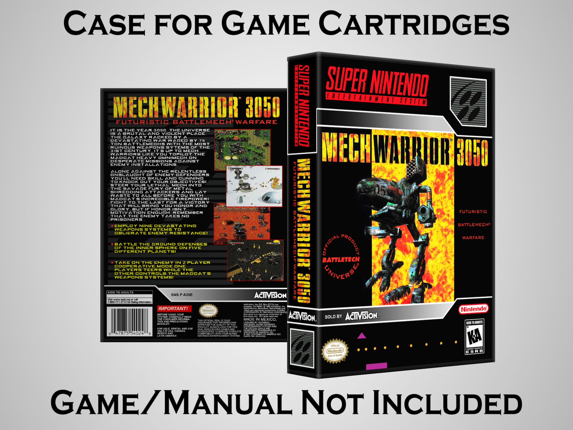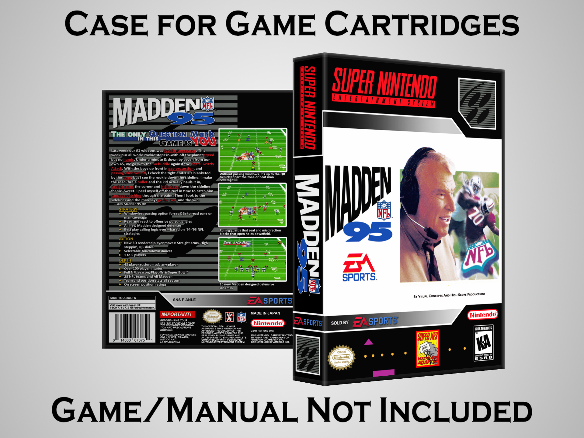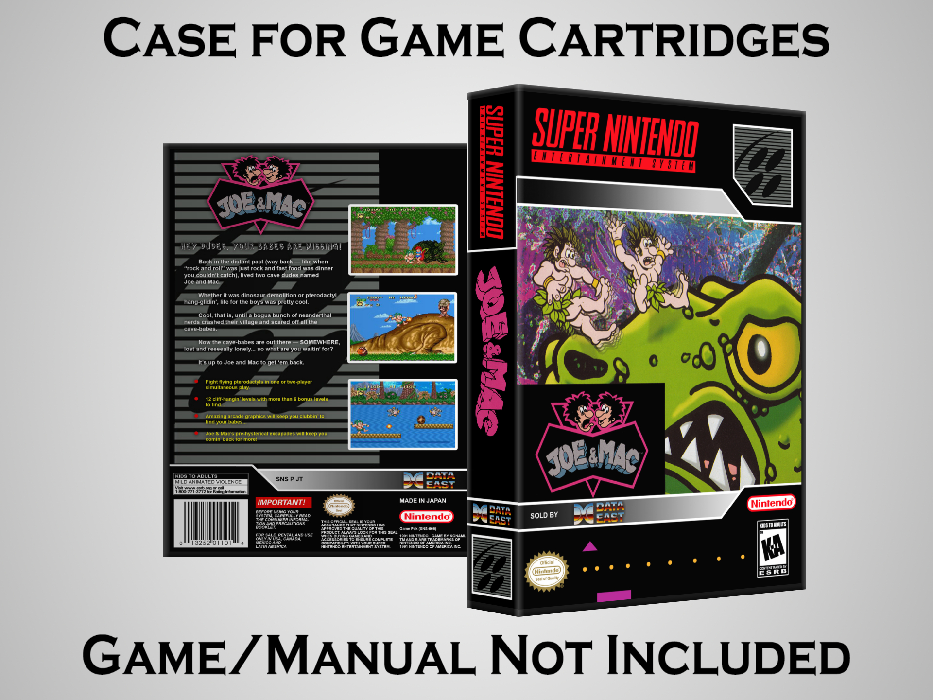 NO GAME OR MANUAL IS INCLUDED! This is NOT an original cardboard box. Case Dimensions : 7.25" x 5.25" x 1.125" Case Color : Dark Grey These cases are designed specifically to hold your Super Nintendo (SNES) cartridges. These are not the low quality Universal Game Cases that most other sellers offer. These firmly hold your cartridges in place, and include clips on the opposite side to hold the instruction manuals if you have them. Our Super Nintendo cases are split into multiple listings alphabetically due to the limit on options in one listing. You can find the rest of our cases in the following links: SNES Cases from # to F SNES Cases from G to N SNES Cases from O to S SNES Cases from T to Z Click here to find more cases in our eBay store!