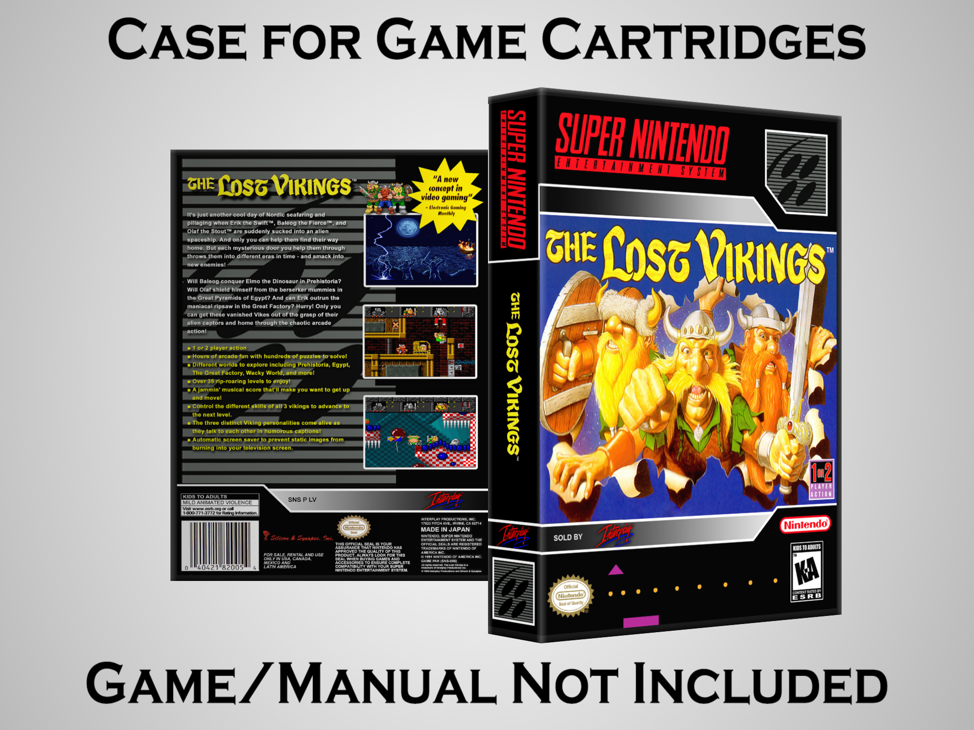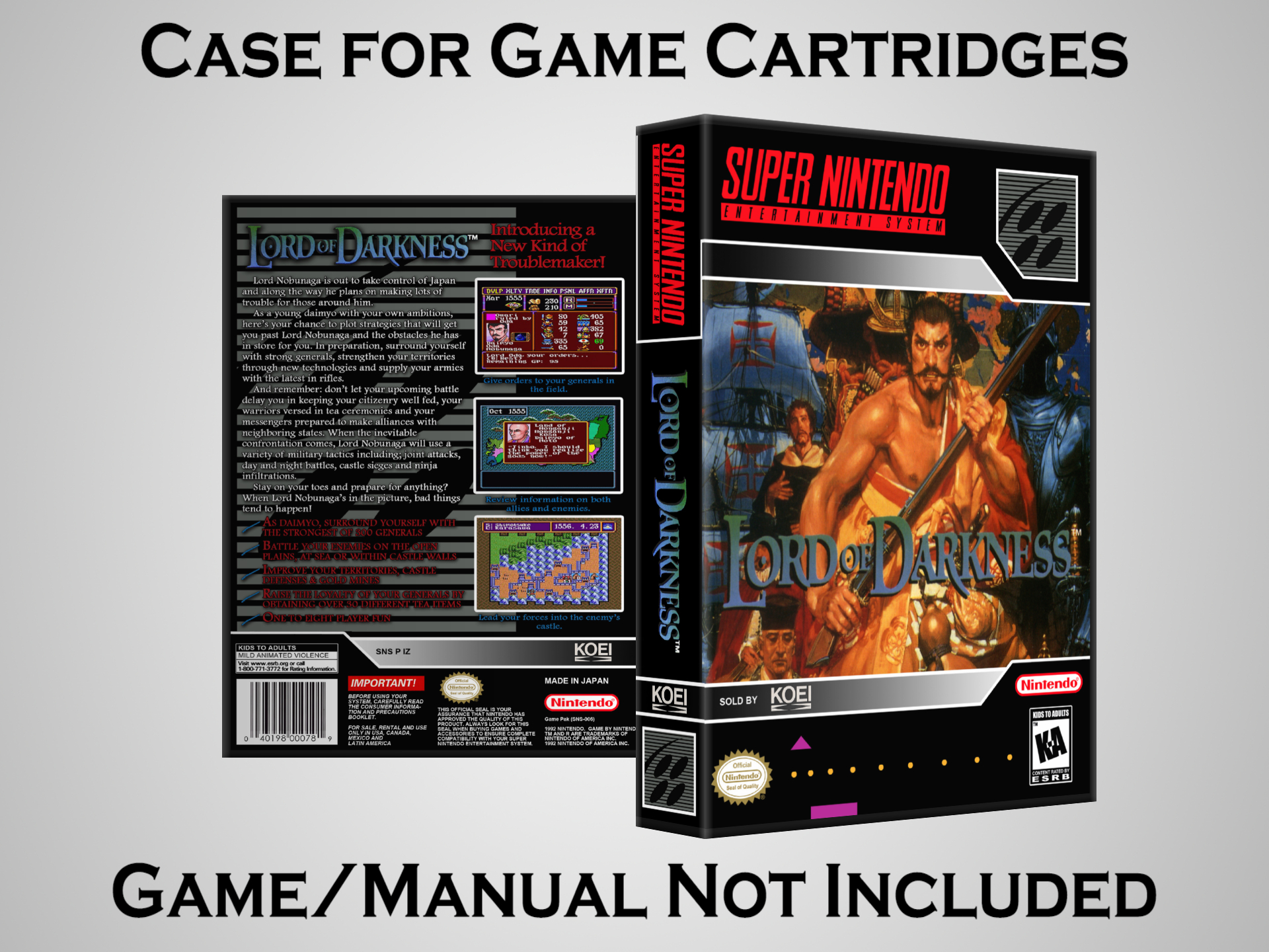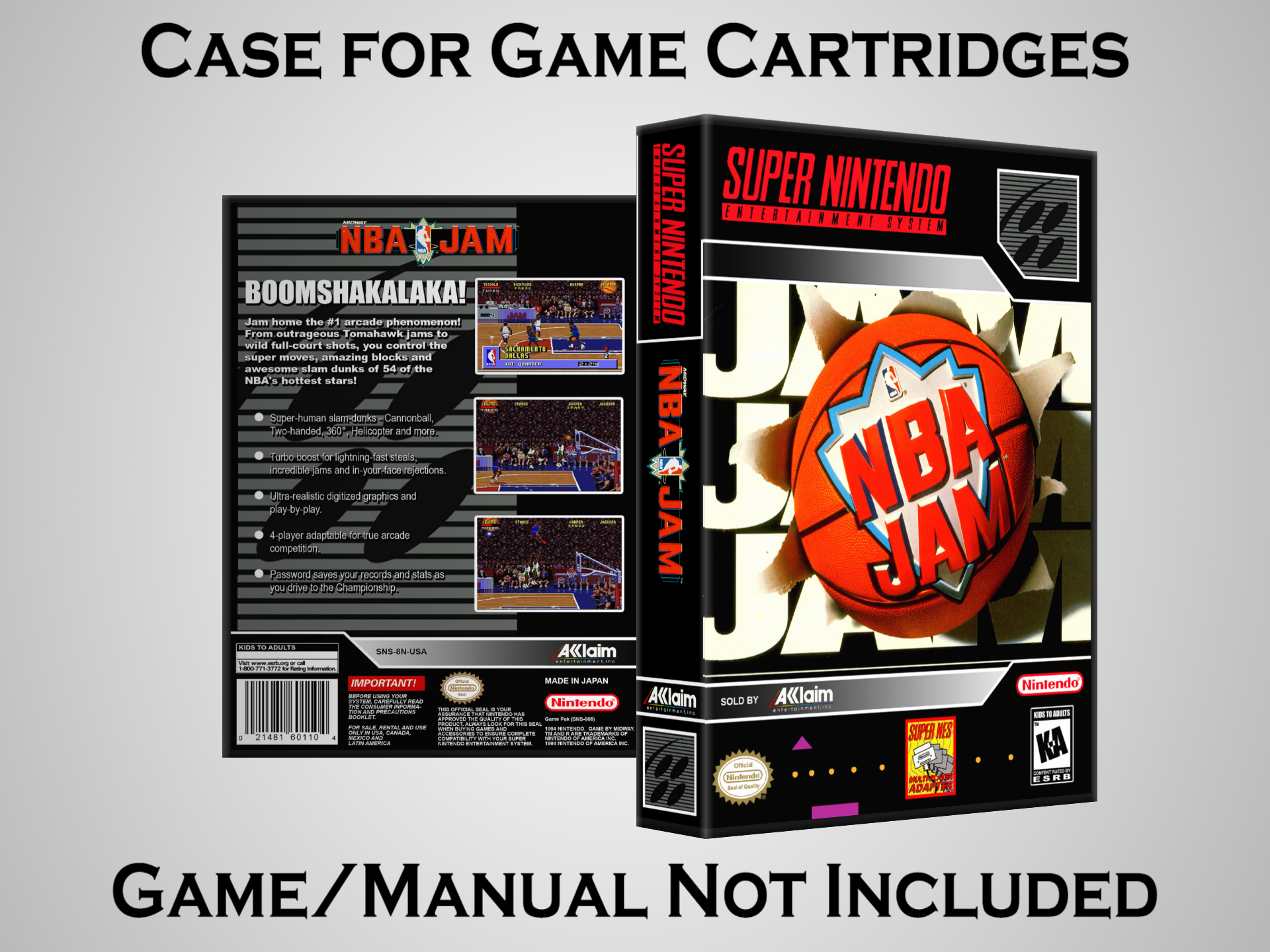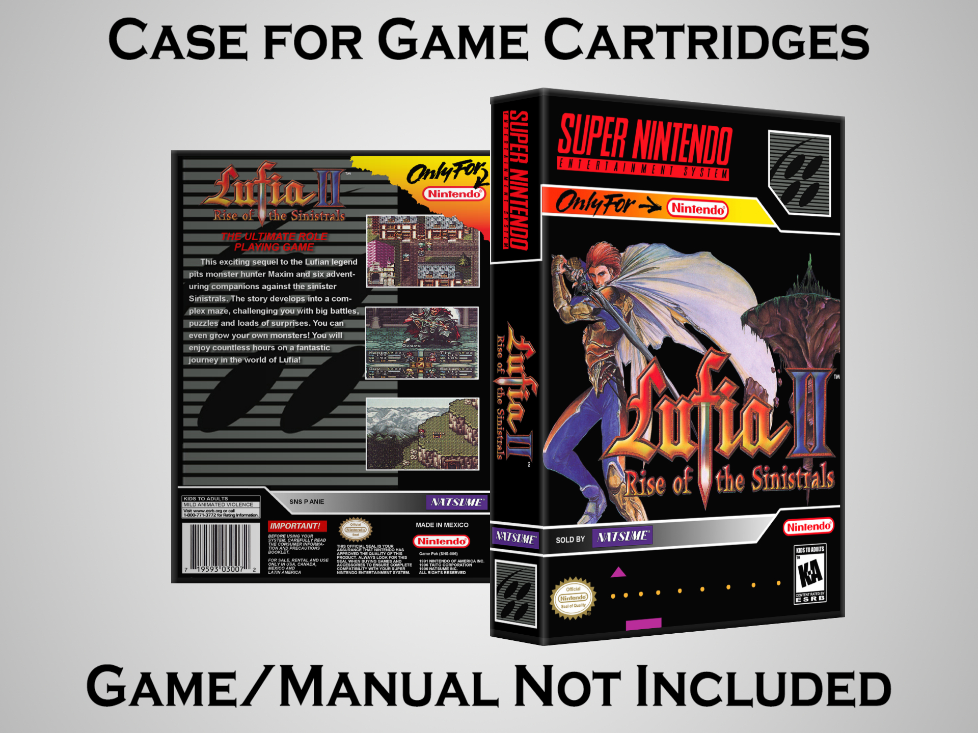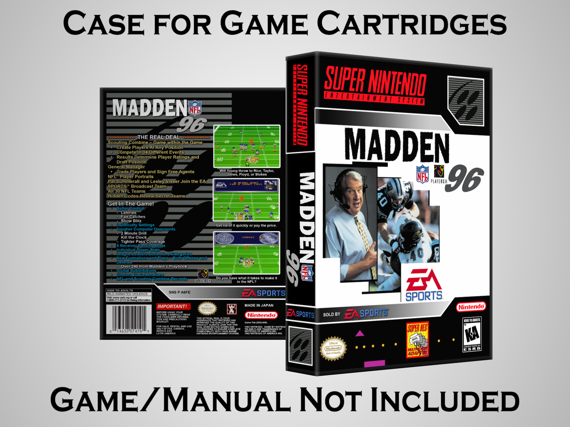 NO GAME OR MANUAL IS INCLUDED! This is NOT an original cardboard box. Case Dimensions : 7.25" x 5.25" x 1.125" Case Color : Dark Grey These cases are designed specifically to hold your Super Nintendo (SNES) cartridges. These are not the low quality Universal Game Cases that most other sellers offer. These firmly hold your cartridges in place, and include clips on the opposite side to hold the instruction manuals if you have them. Our Super Nintendo cases are split into multiple listings alphabetically due to the limit on options in one listing. You can find the rest of our cases in the following links: SNES Cases from # to F SNES Cases from G to N SNES Cases from O to S SNES Cases from T to Z Click here to find more cases in our eBay store!