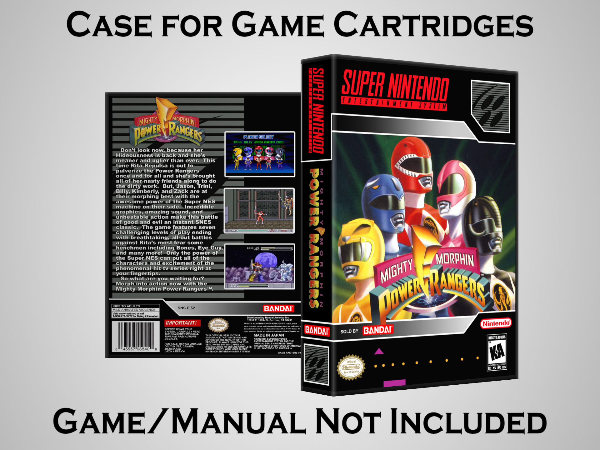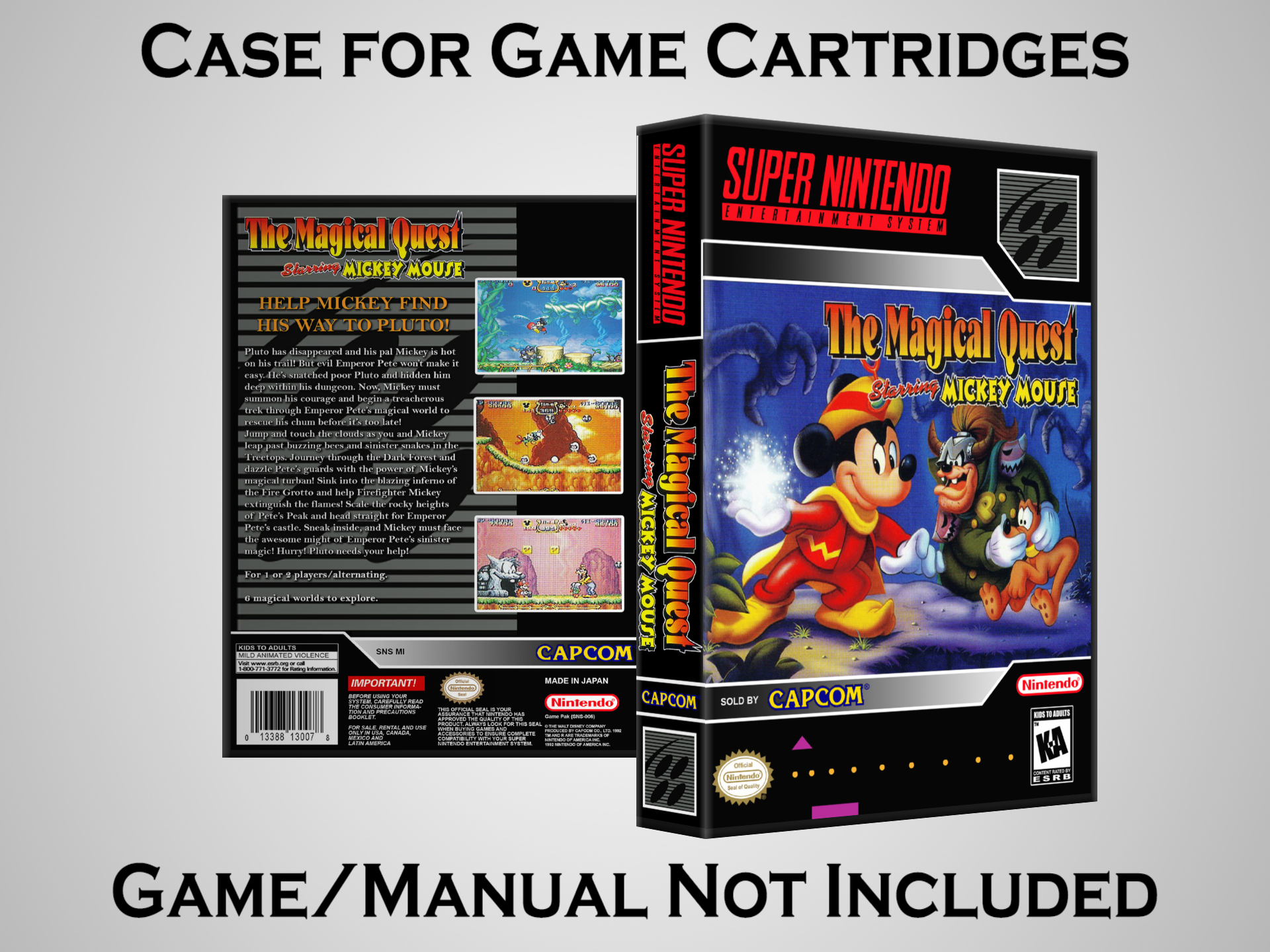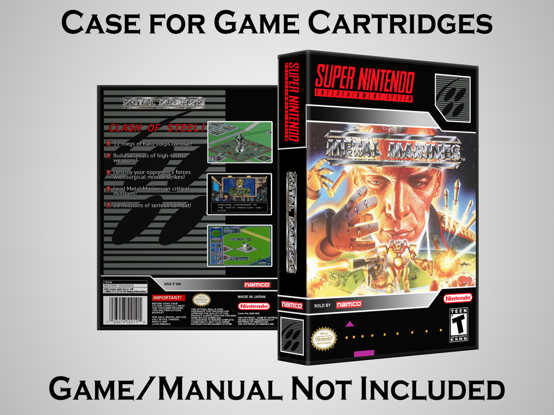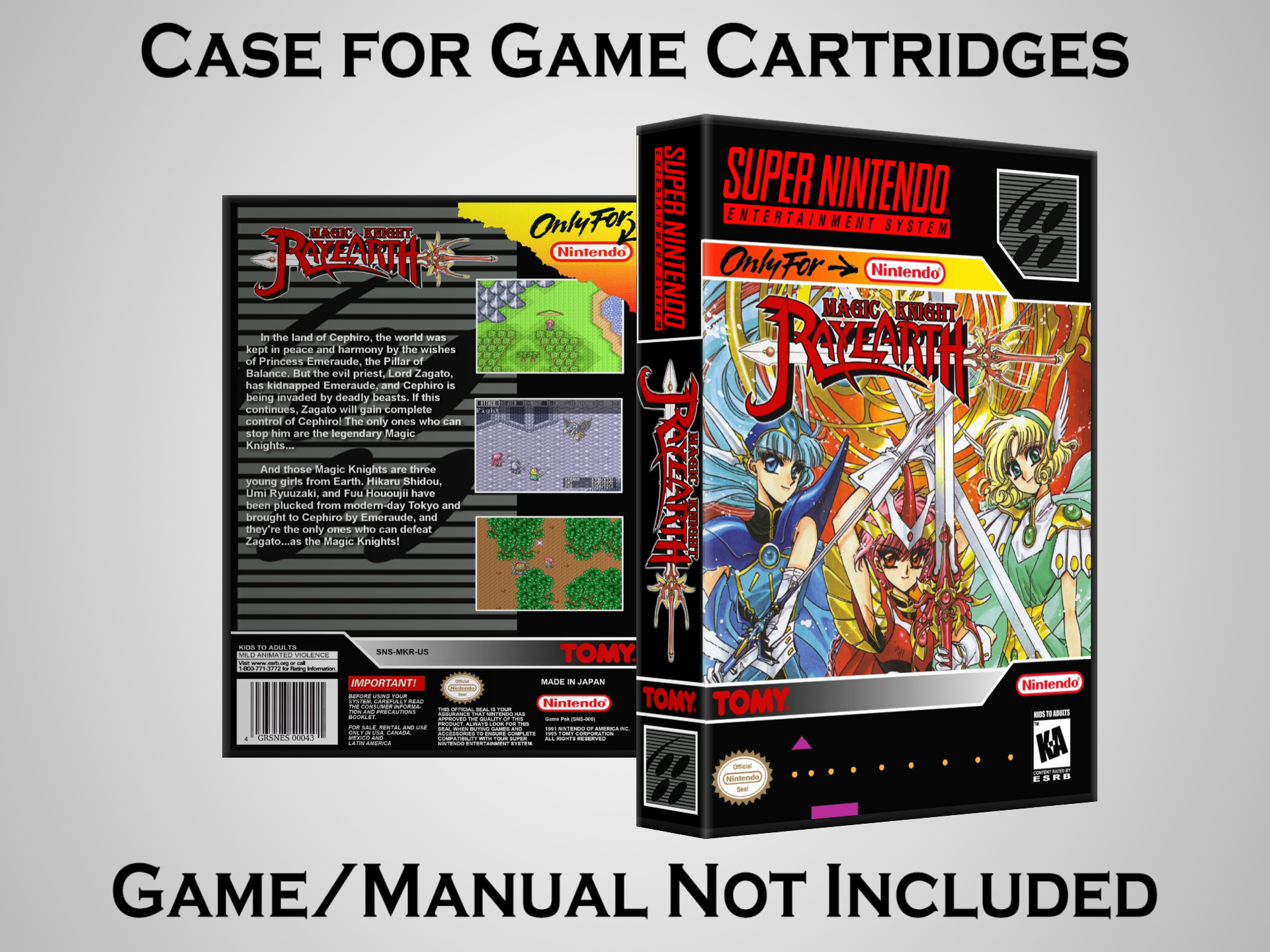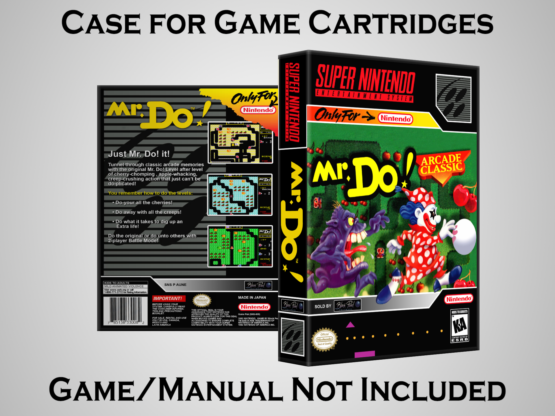 NO GAME OR MANUAL IS INCLUDED! This is NOT an original cardboard box. Case Dimensions : 7.25" x 5.25" x 1.125" Case Color : Dark Grey These cases are designed specifically to hold your Super Nintendo (SNES) cartridges. These are not the low quality Universal Game Cases that most other sellers offer. These firmly hold your cartridges in place, and include clips on the opposite side to hold the instruction manuals if you have them. Our Super Nintendo cases are split into multiple listings alphabetically due to the limit on options in one listing. You can find the rest of our cases in the following links: SNES Cases from # to F SNES Cases from G to N SNES Cases from O to S SNES Cases from T to Z Click here to find more cases in our eBay store!