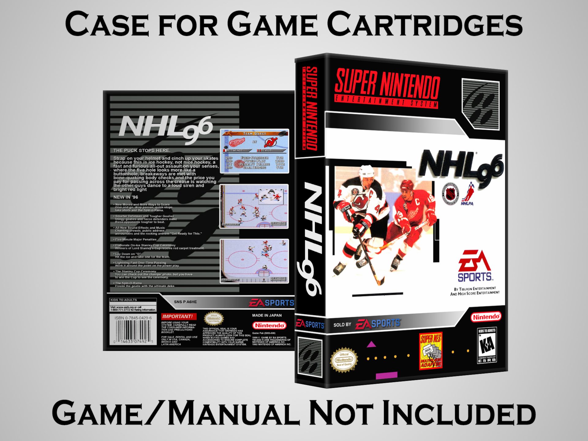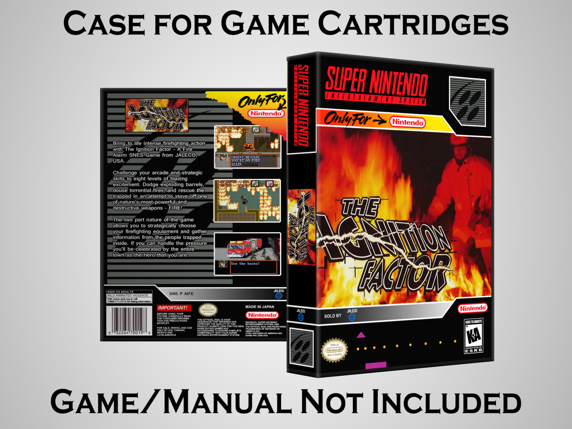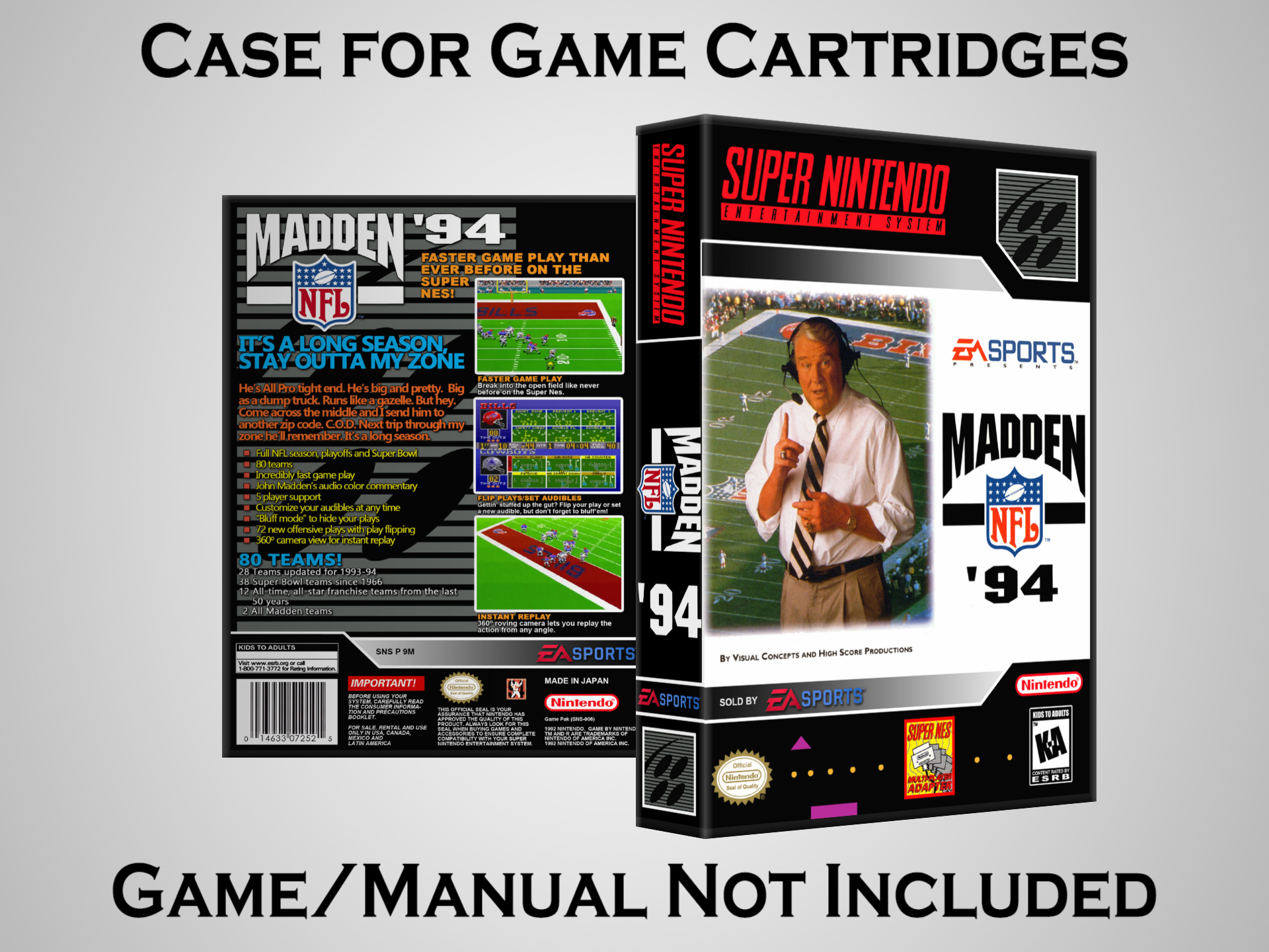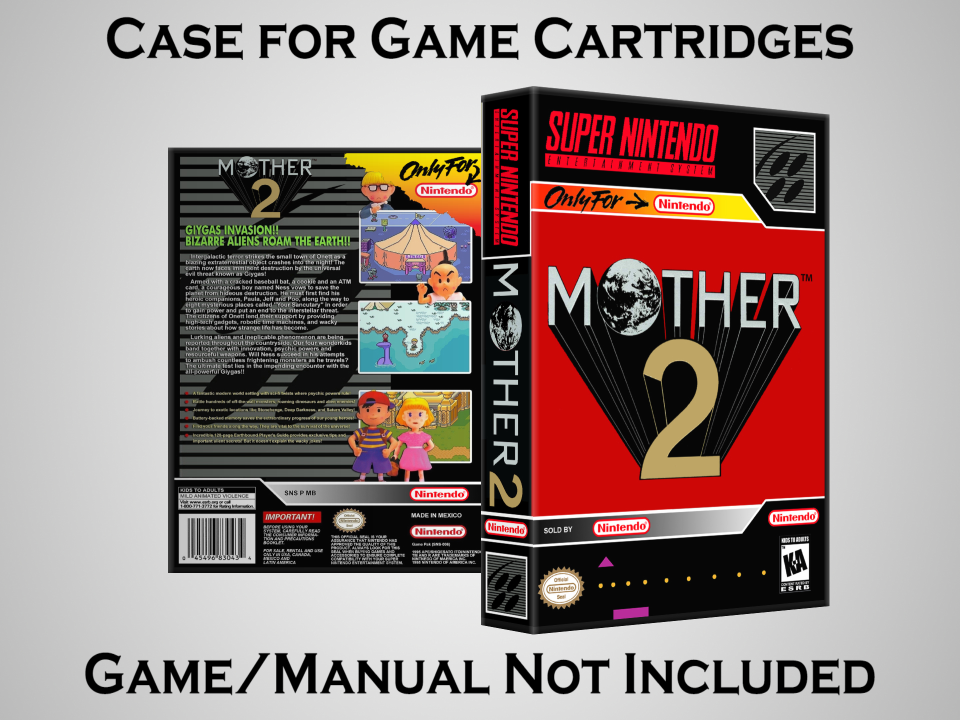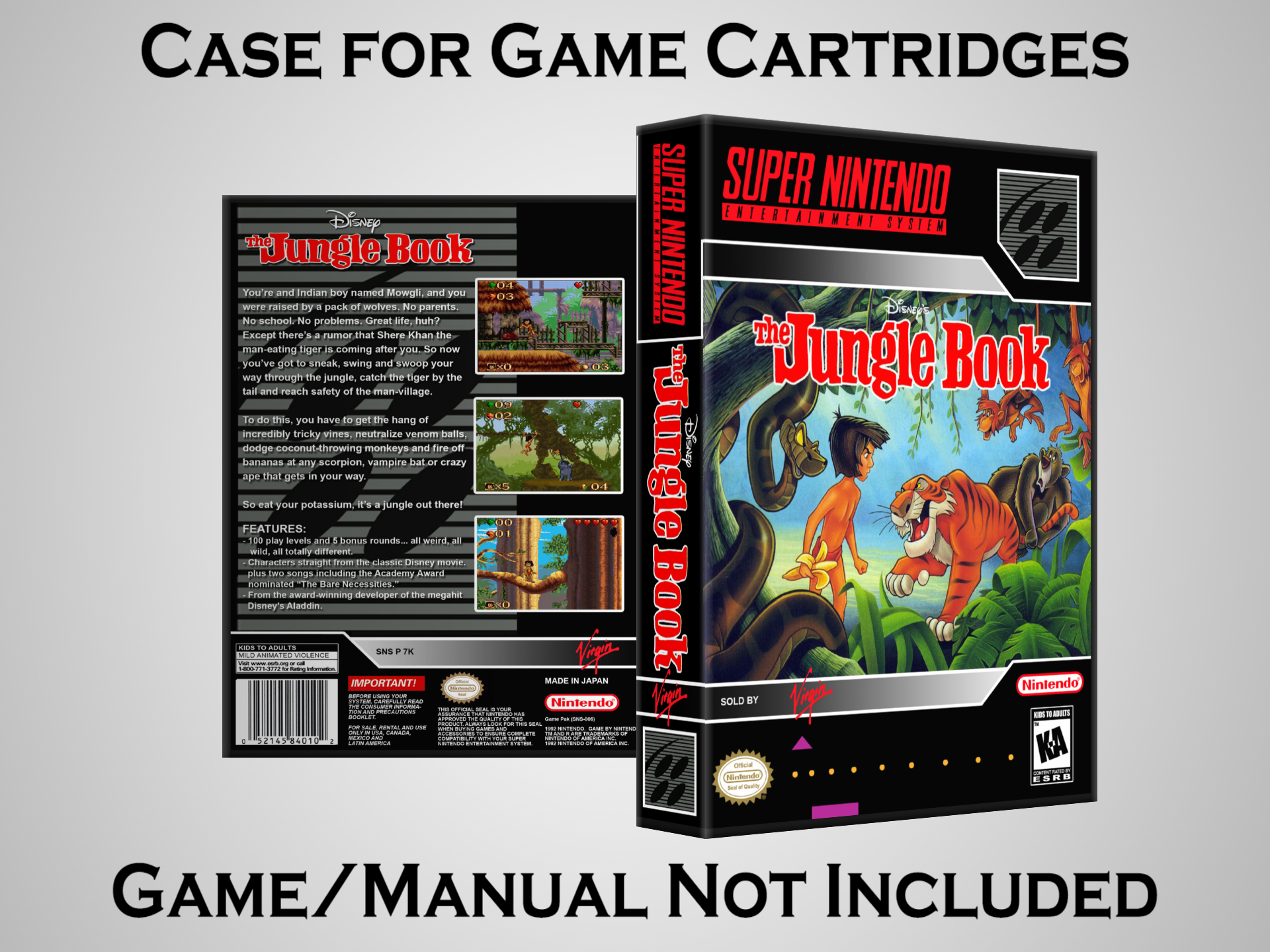 NO GAME OR MANUAL IS INCLUDED! This is NOT an original cardboard box. Case Dimensions : 7.25" x 5.25" x 1.125" Case Color : Dark Grey These cases are designed specifically to hold your Super Nintendo (SNES) cartridges. These are not the low quality Universal Game Cases that most other sellers offer. These firmly hold your cartridges in place, and include clips on the opposite side to hold the instruction manuals if you have them. Our Super Nintendo cases are split into multiple listings alphabetically due to the limit on options in one listing. You can find the rest of our cases in the following links: SNES Cases from # to F SNES Cases from G to N SNES Cases from O to S SNES Cases from T to Z Click here to find more cases in our eBay store!