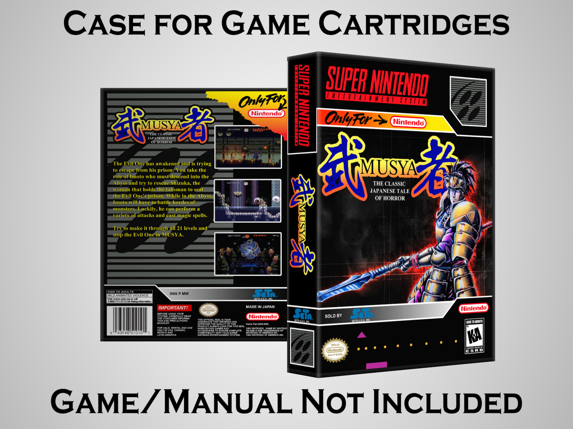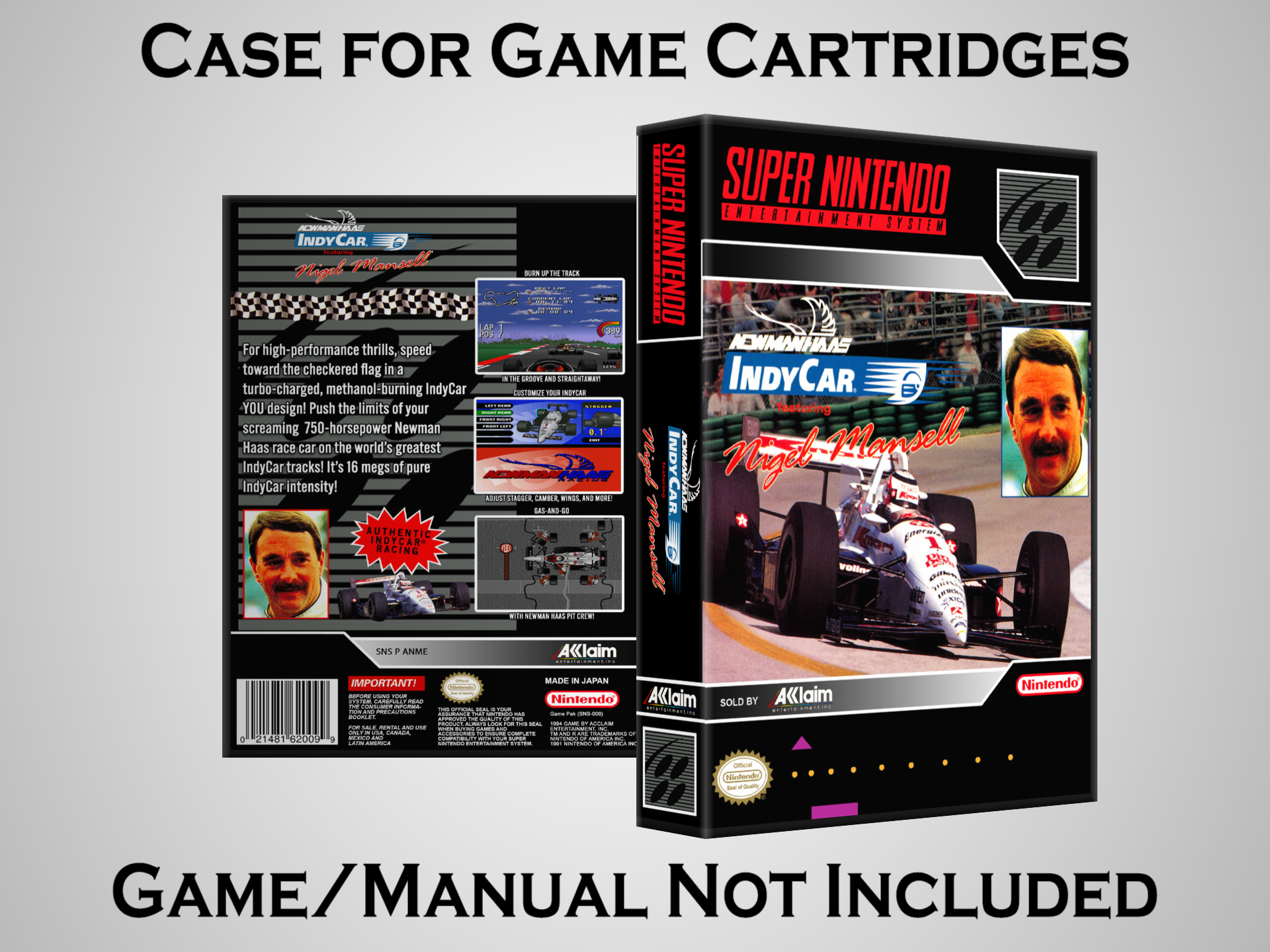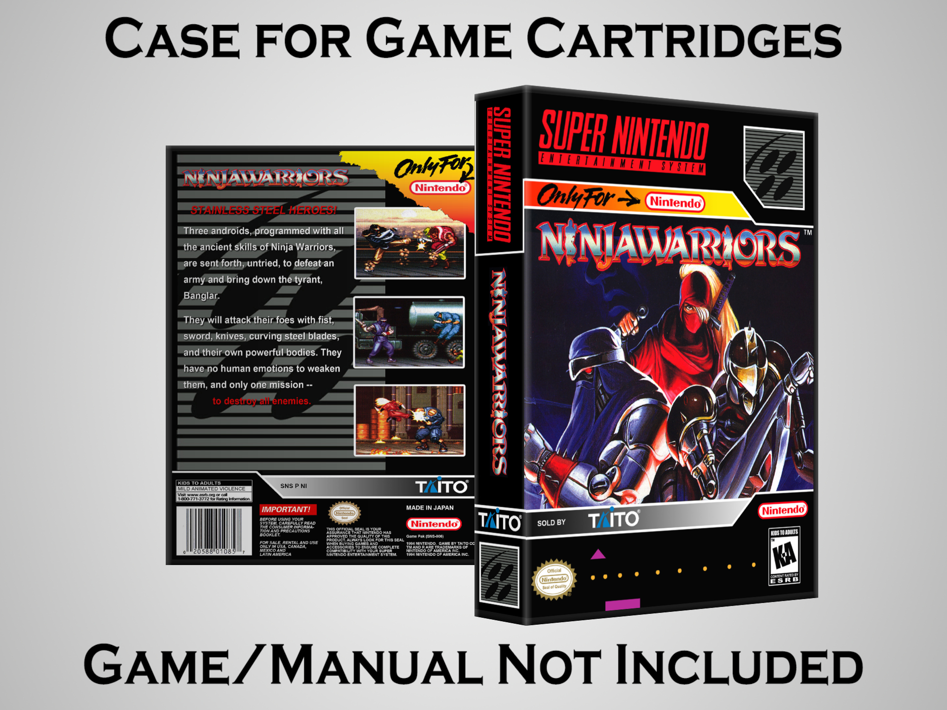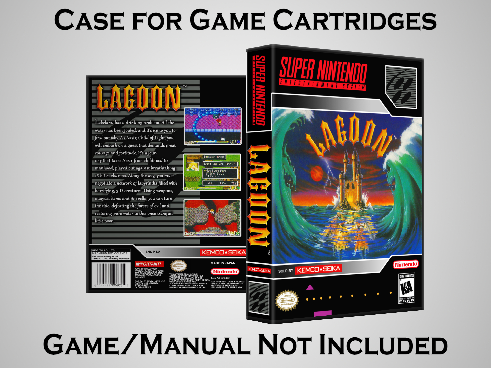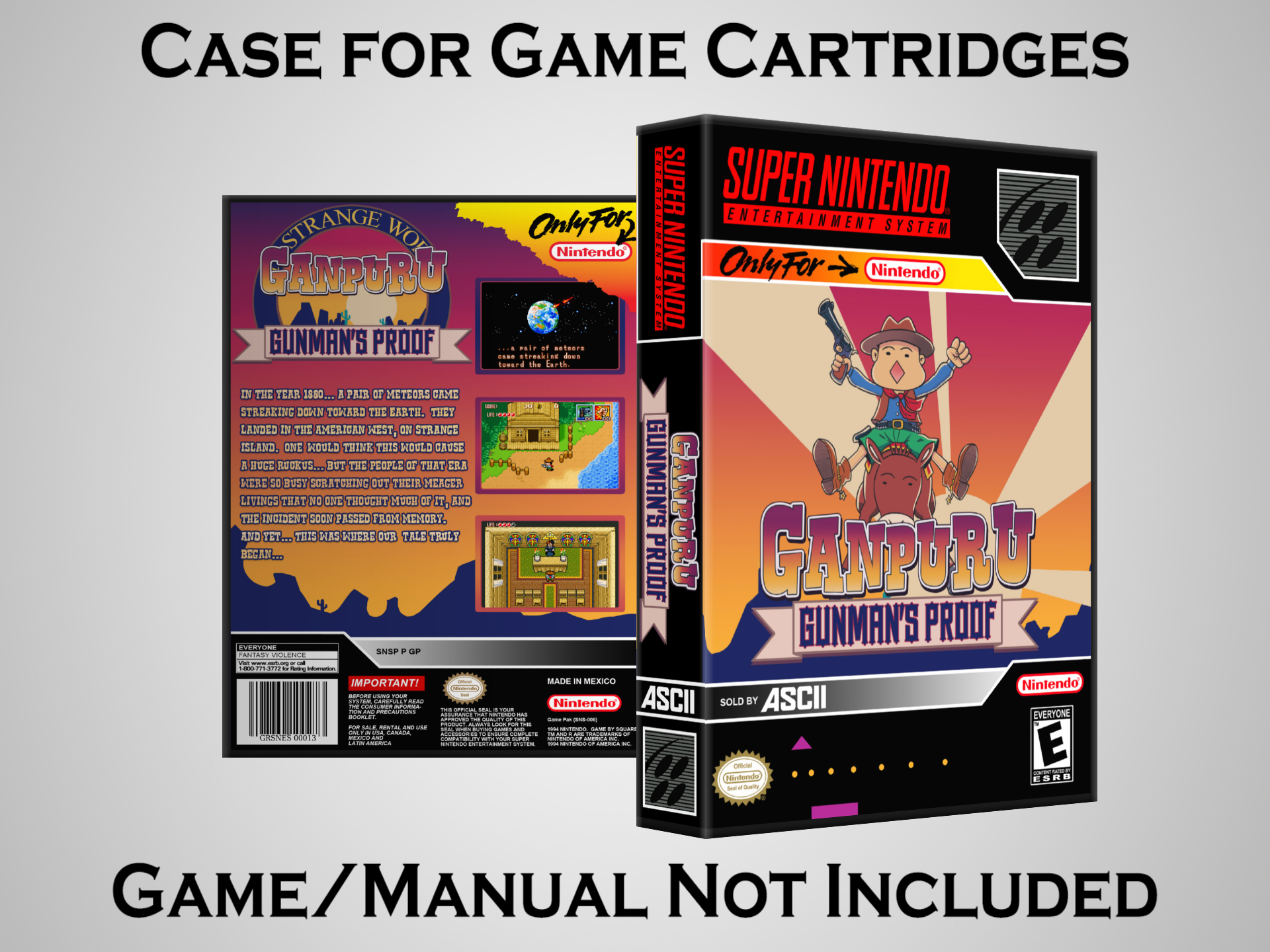 NO GAME OR MANUAL IS INCLUDED! This is NOT an original cardboard box. Case Dimensions : 7.25" x 5.25" x 1.125" Case Color : Dark Grey These cases are designed specifically to hold your Super Nintendo (SNES) cartridges. These are not the low quality Universal Game Cases that most other sellers offer. These firmly hold your cartridges in place, and include clips on the opposite side to hold the instruction manuals if you have them. Our Super Nintendo cases are split into multiple listings alphabetically due to the limit on options in one listing. You can find the rest of our cases in the following links: SNES Cases from # to F SNES Cases from G to N SNES Cases from O to S SNES Cases from T to Z Click here to find more cases in our eBay store!