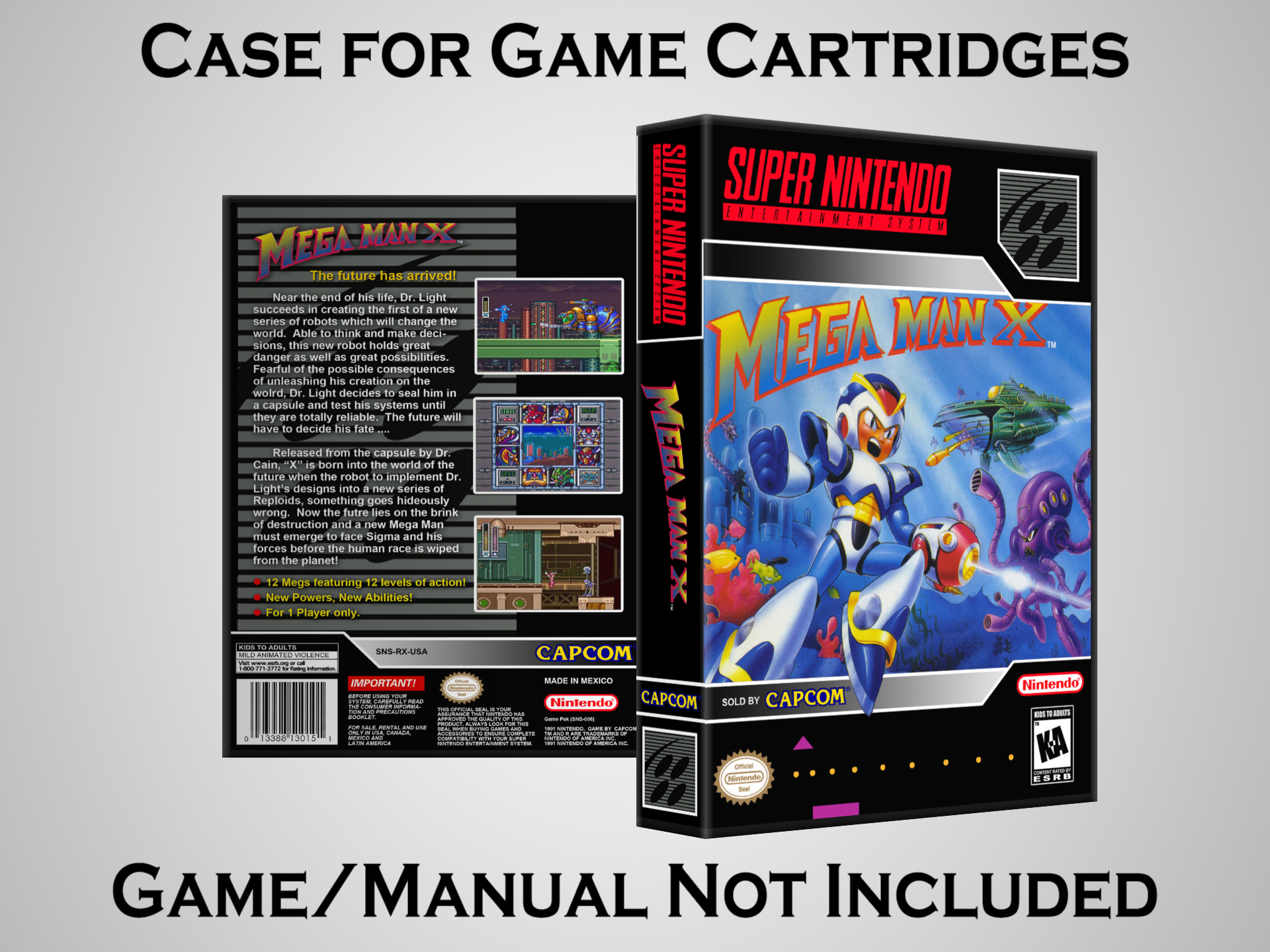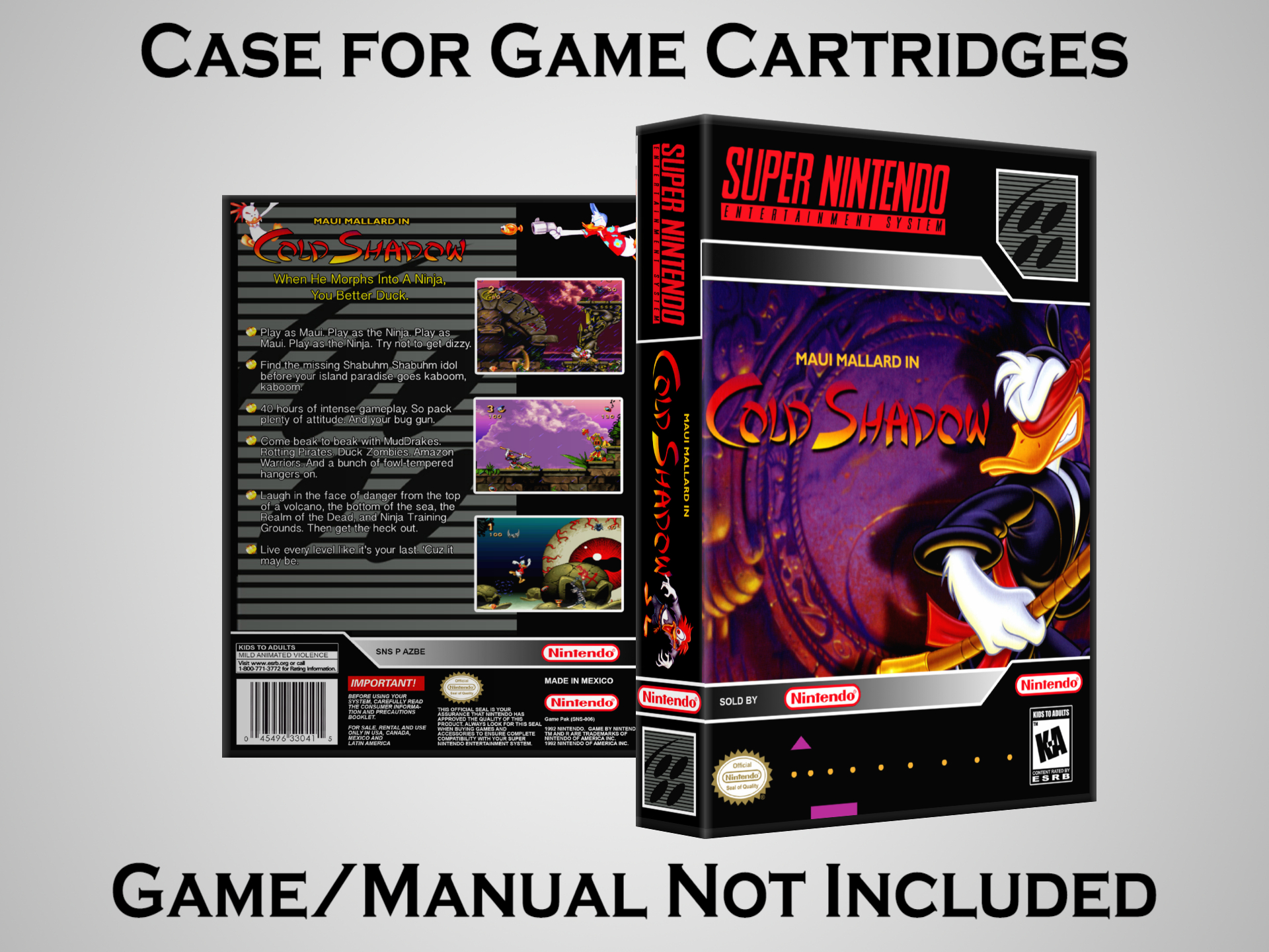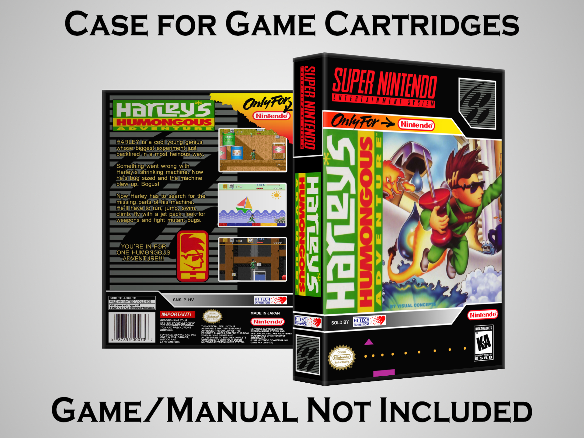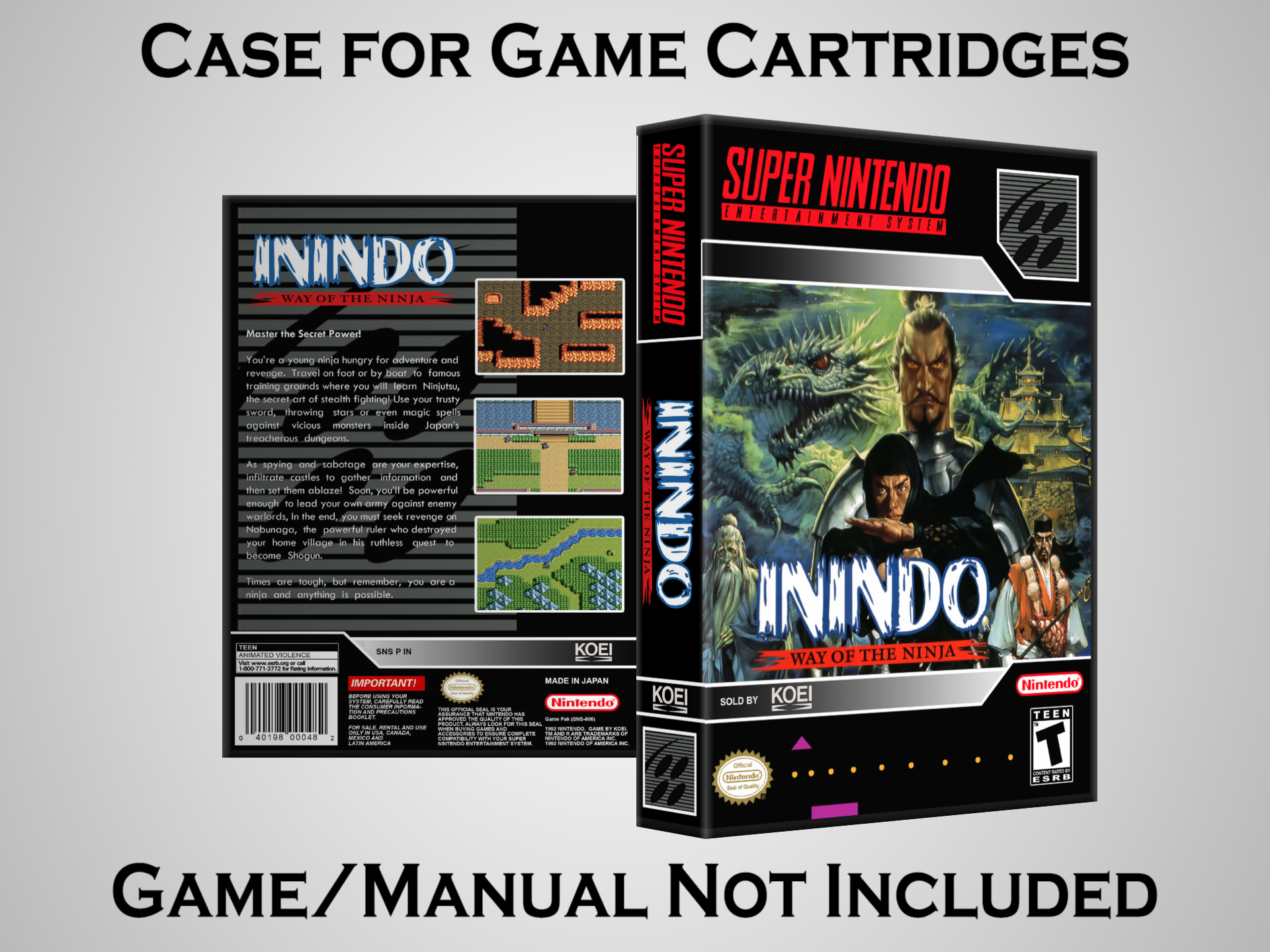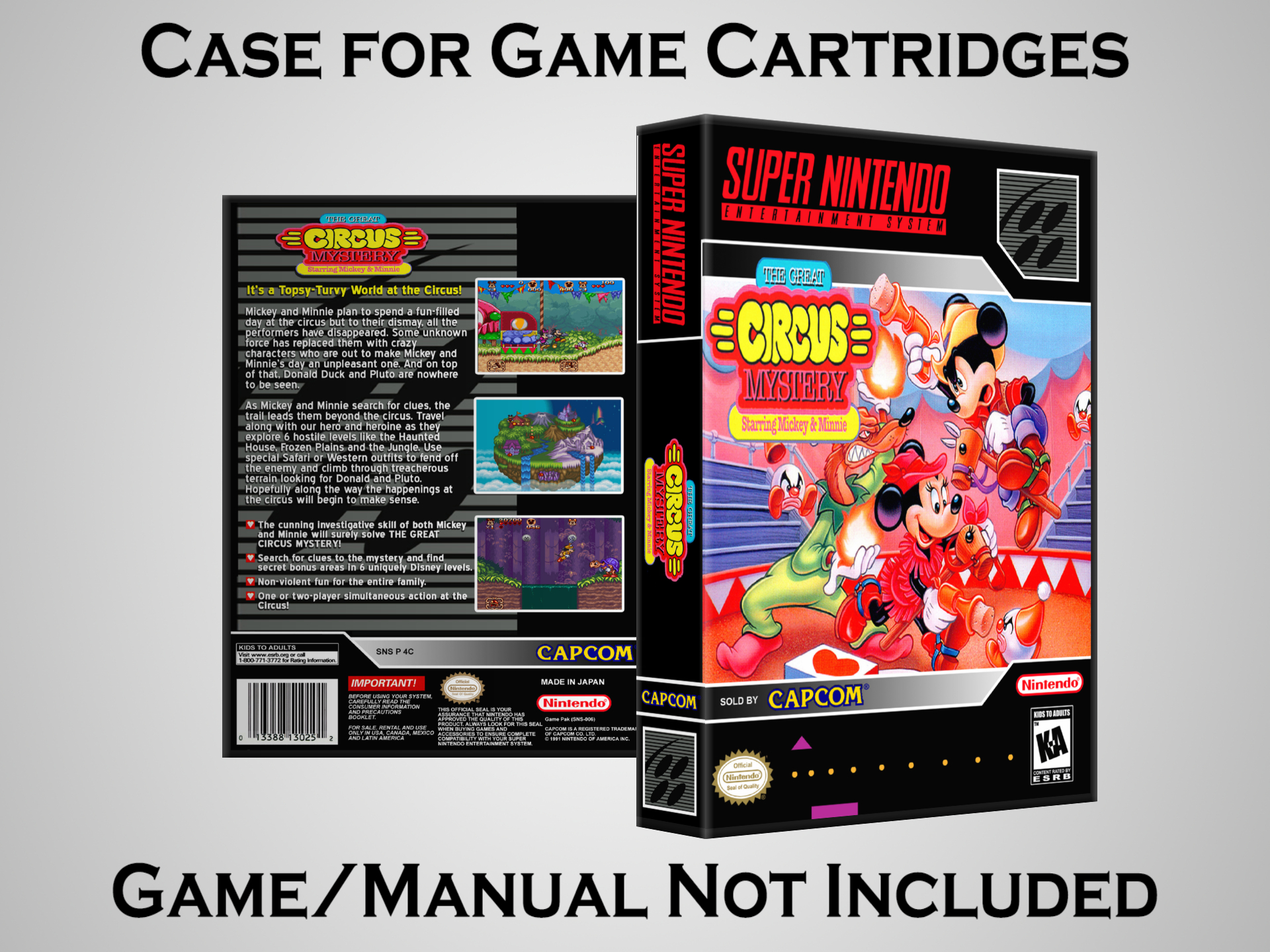 NO GAME OR MANUAL IS INCLUDED! This is NOT an original cardboard box. Case Dimensions : 7.25" x 5.25" x 1.125" Case Color : Dark Grey These cases are designed specifically to hold your Super Nintendo (SNES) cartridges. These are not the low quality Universal Game Cases that most other sellers offer. These firmly hold your cartridges in place, and include clips on the opposite side to hold the instruction manuals if you have them. Our Super Nintendo cases are split into multiple listings alphabetically due to the limit on options in one listing. You can find the rest of our cases in the following links: SNES Cases from # to F SNES Cases from G to N SNES Cases from O to S SNES Cases from T to Z Click here to find more cases in our eBay store!