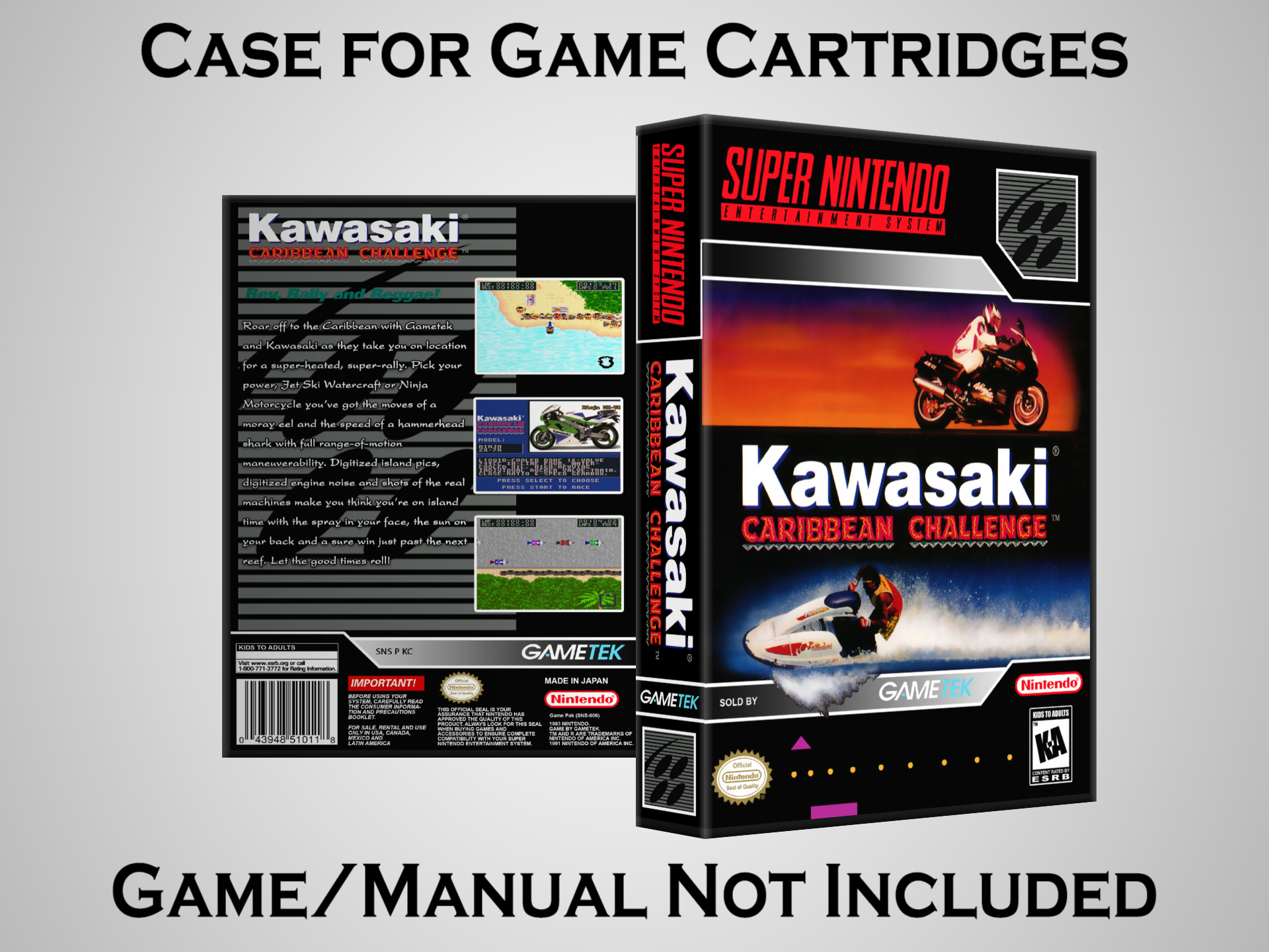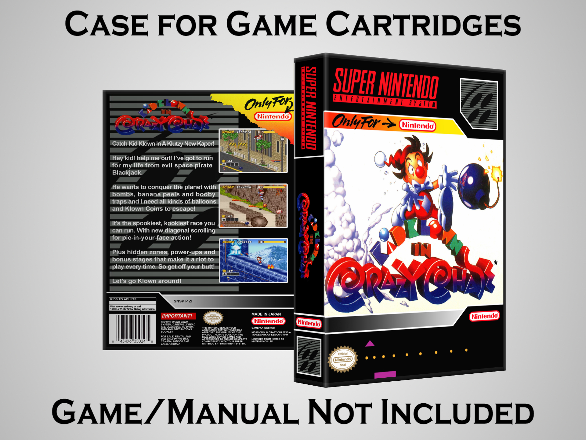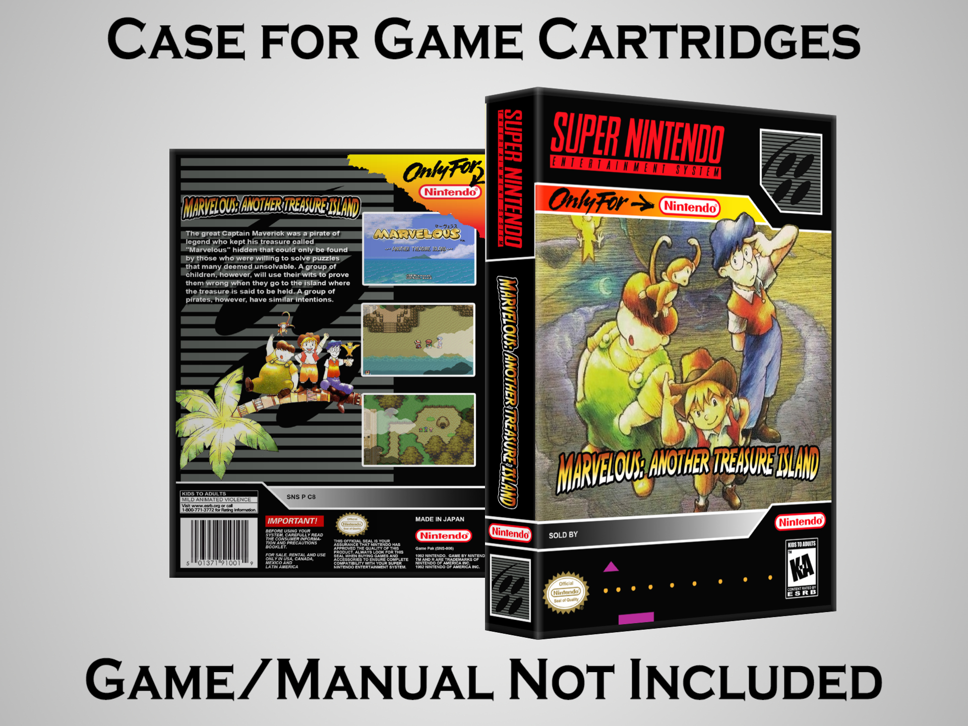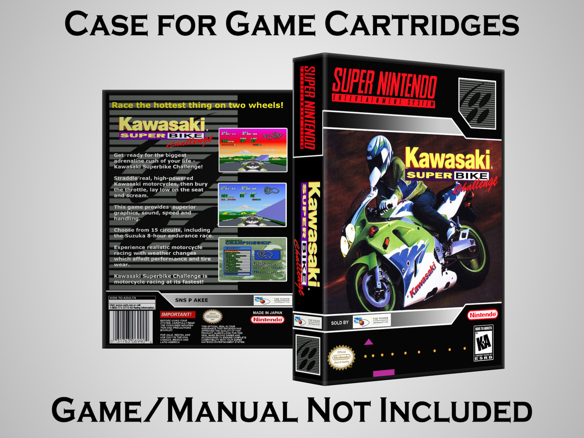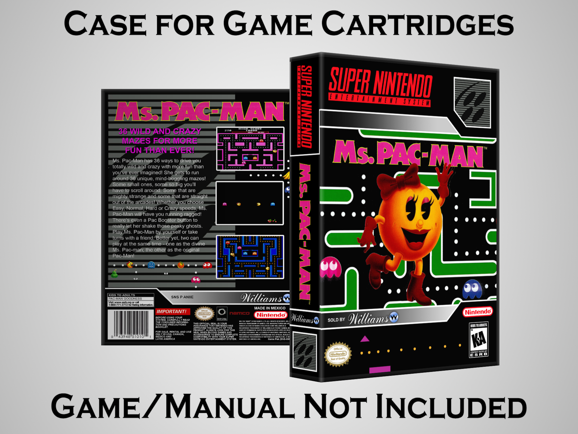 NO GAME OR MANUAL IS INCLUDED! This is NOT an original cardboard box. Case Dimensions : 7.25" x 5.25" x 1.125" Case Color : Dark Grey These cases are designed specifically to hold your Super Nintendo (SNES) cartridges. These are not the low quality Universal Game Cases that most other sellers offer. These firmly hold your cartridges in place, and include clips on the opposite side to hold the instruction manuals if you have them. Our Super Nintendo cases are split into multiple listings alphabetically due to the limit on options in one listing. You can find the rest of our cases in the following links: SNES Cases from # to F SNES Cases from G to N SNES Cases from O to S SNES Cases from T to Z Click here to find more cases in our eBay store!