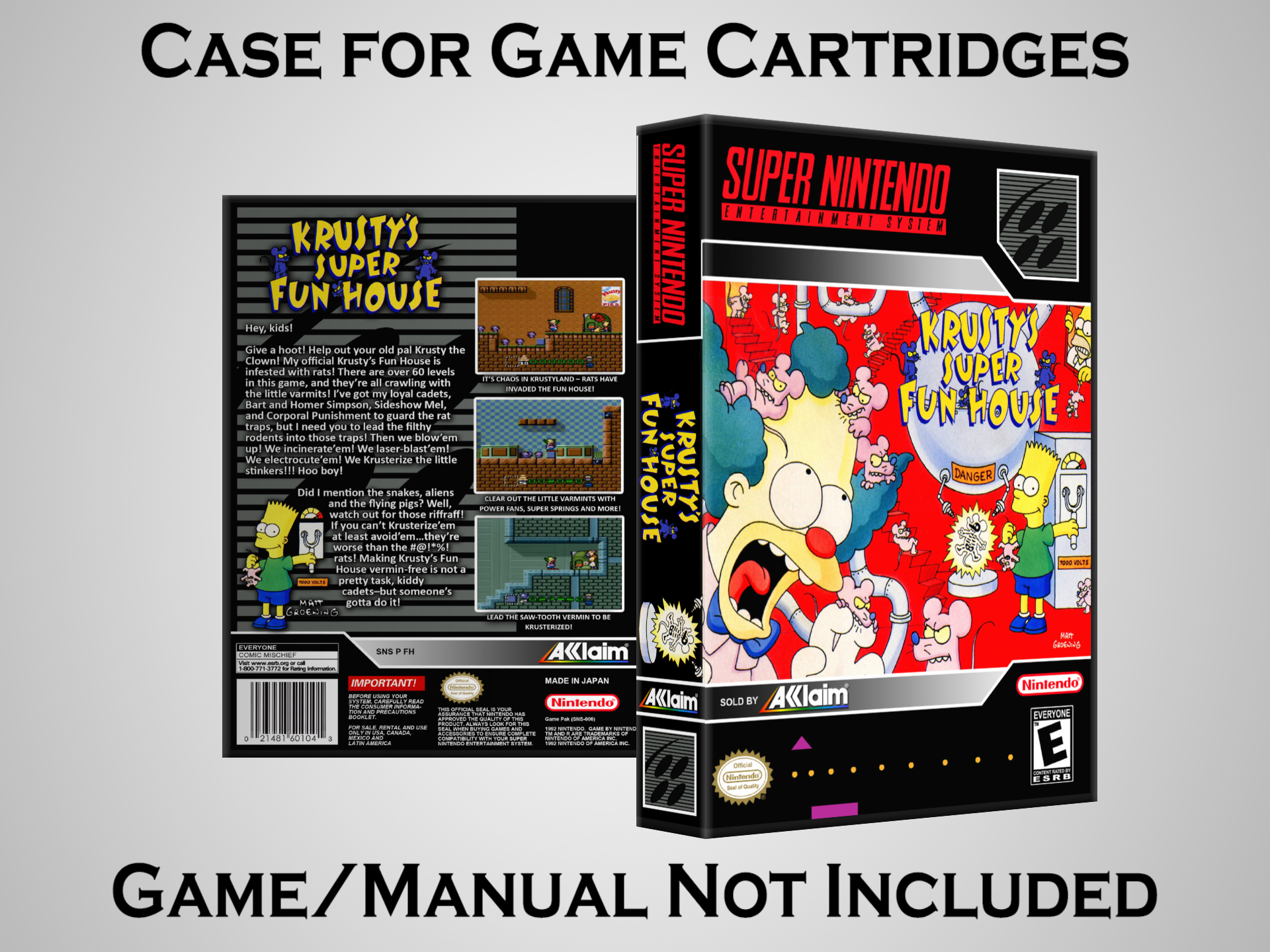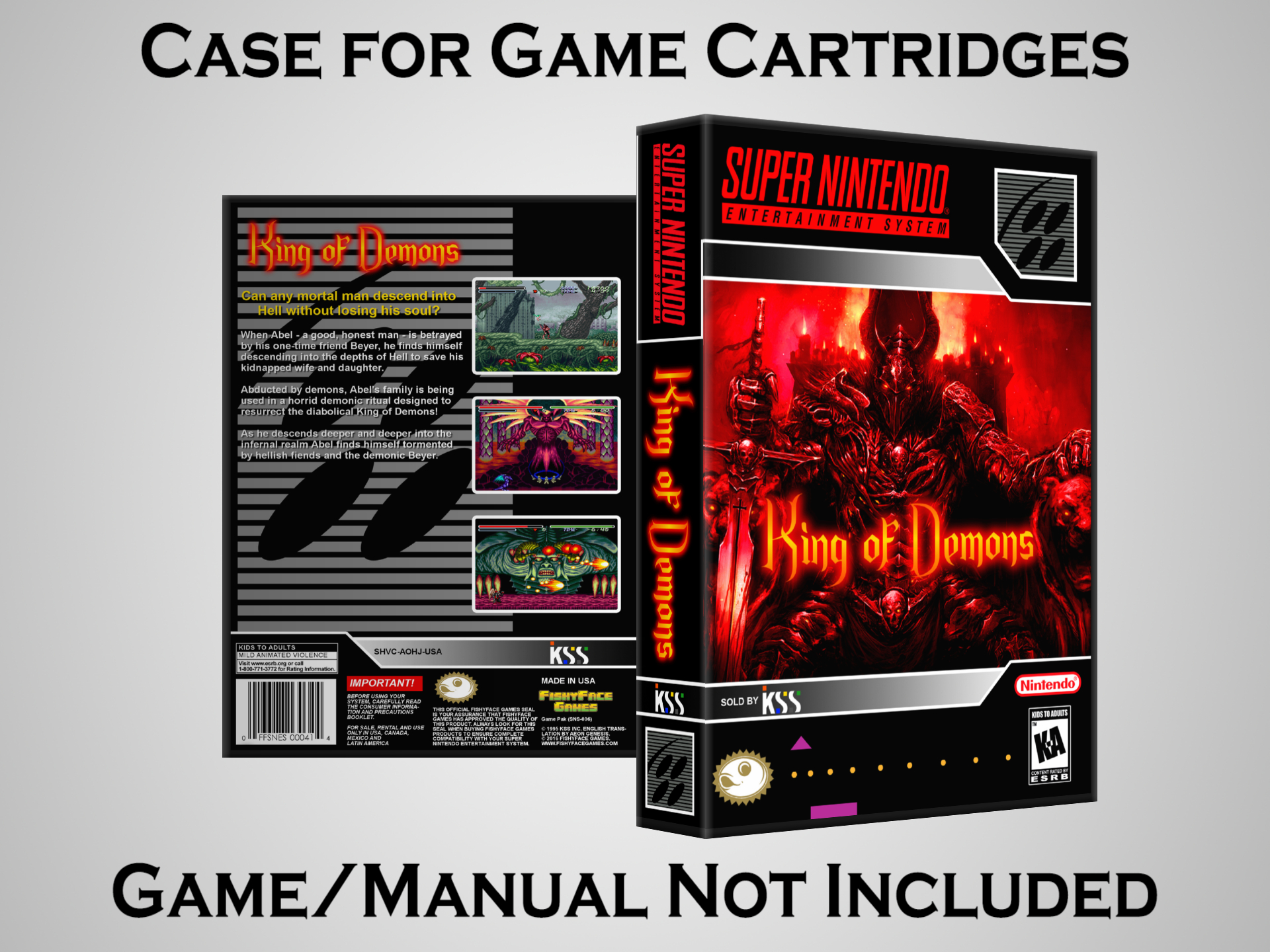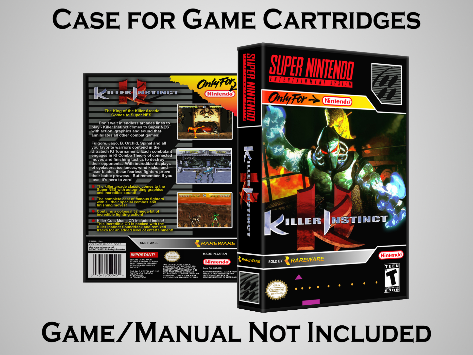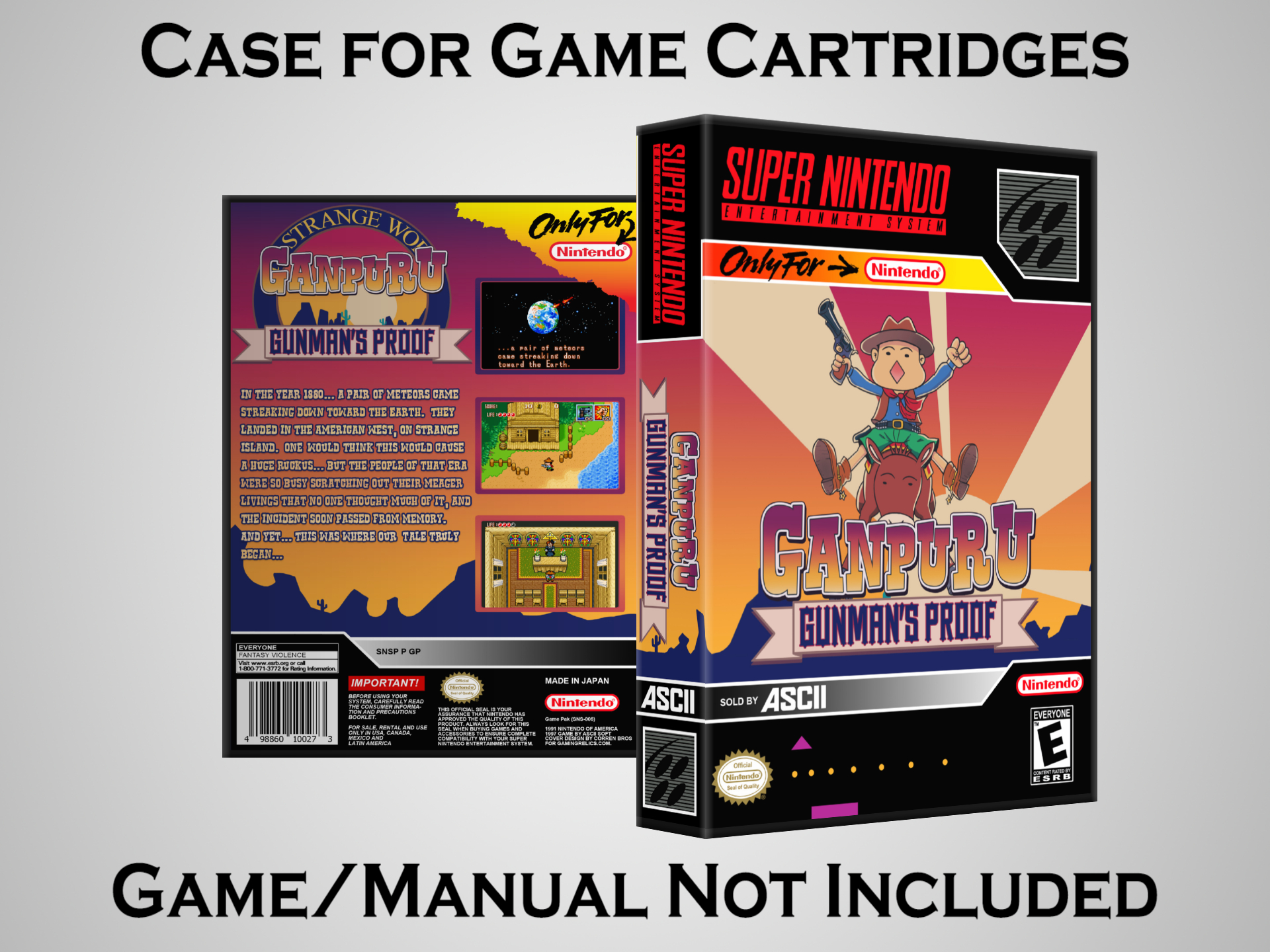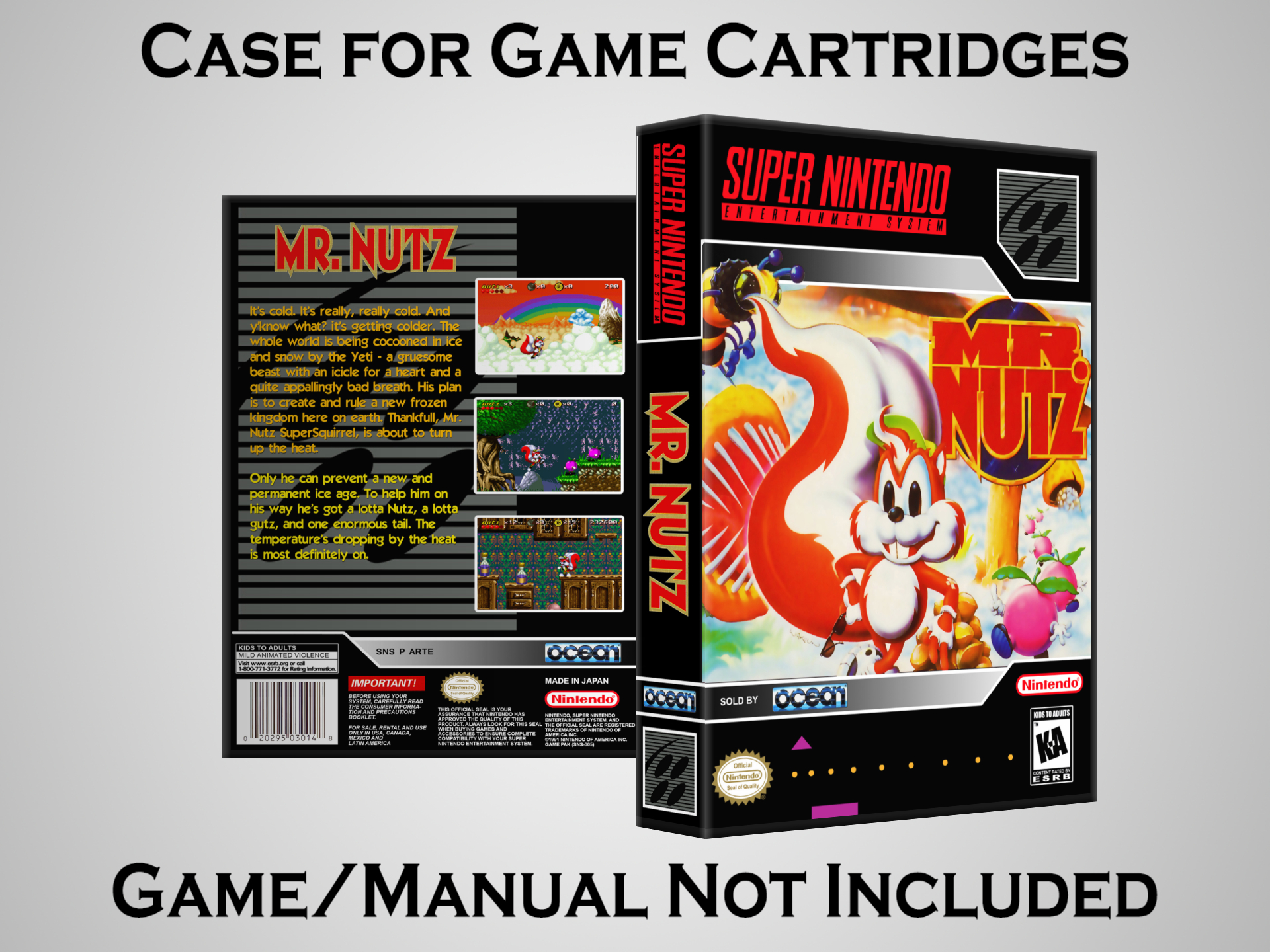 NO GAME OR MANUAL IS INCLUDED! This is NOT an original cardboard box. Case Dimensions : 7.25" x 5.25" x 1.125" Case Color : Dark Grey These cases are designed specifically to hold your Super Nintendo (SNES) cartridges. These are not the low quality Universal Game Cases that most other sellers offer. These firmly hold your cartridges in place, and include clips on the opposite side to hold the instruction manuals if you have them. Our Super Nintendo cases are split into multiple listings alphabetically due to the limit on options in one listing. You can find the rest of our cases in the following links: SNES Cases from # to F SNES Cases from G to N SNES Cases from O to S SNES Cases from T to Z Click here to find more cases in our eBay store!