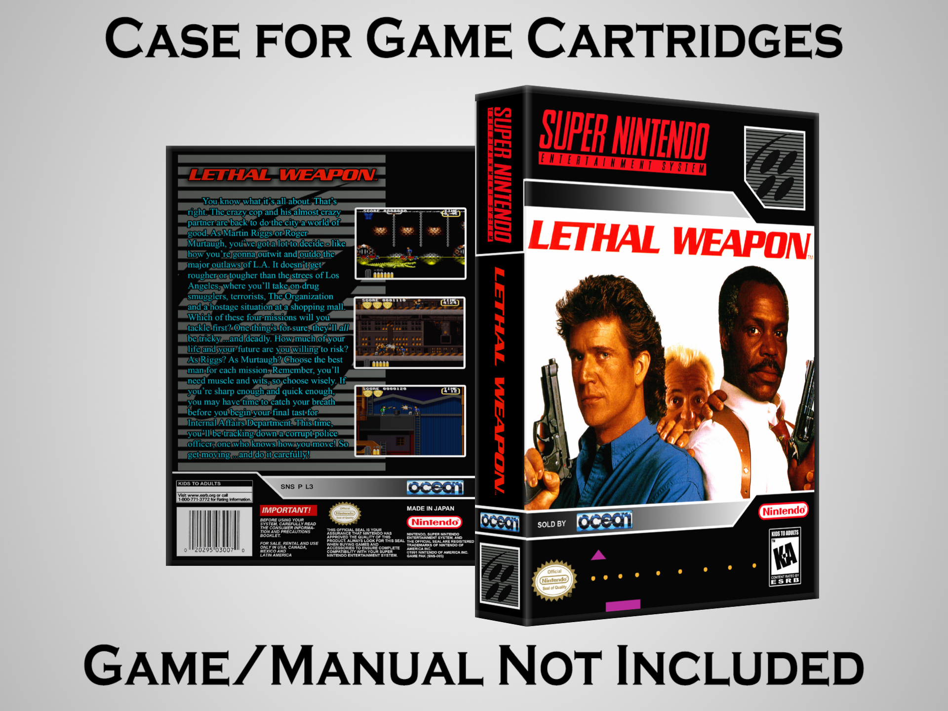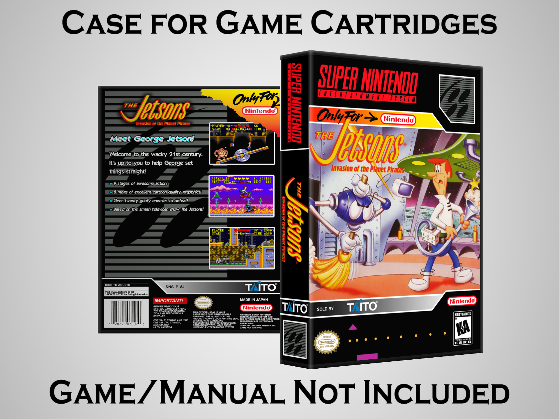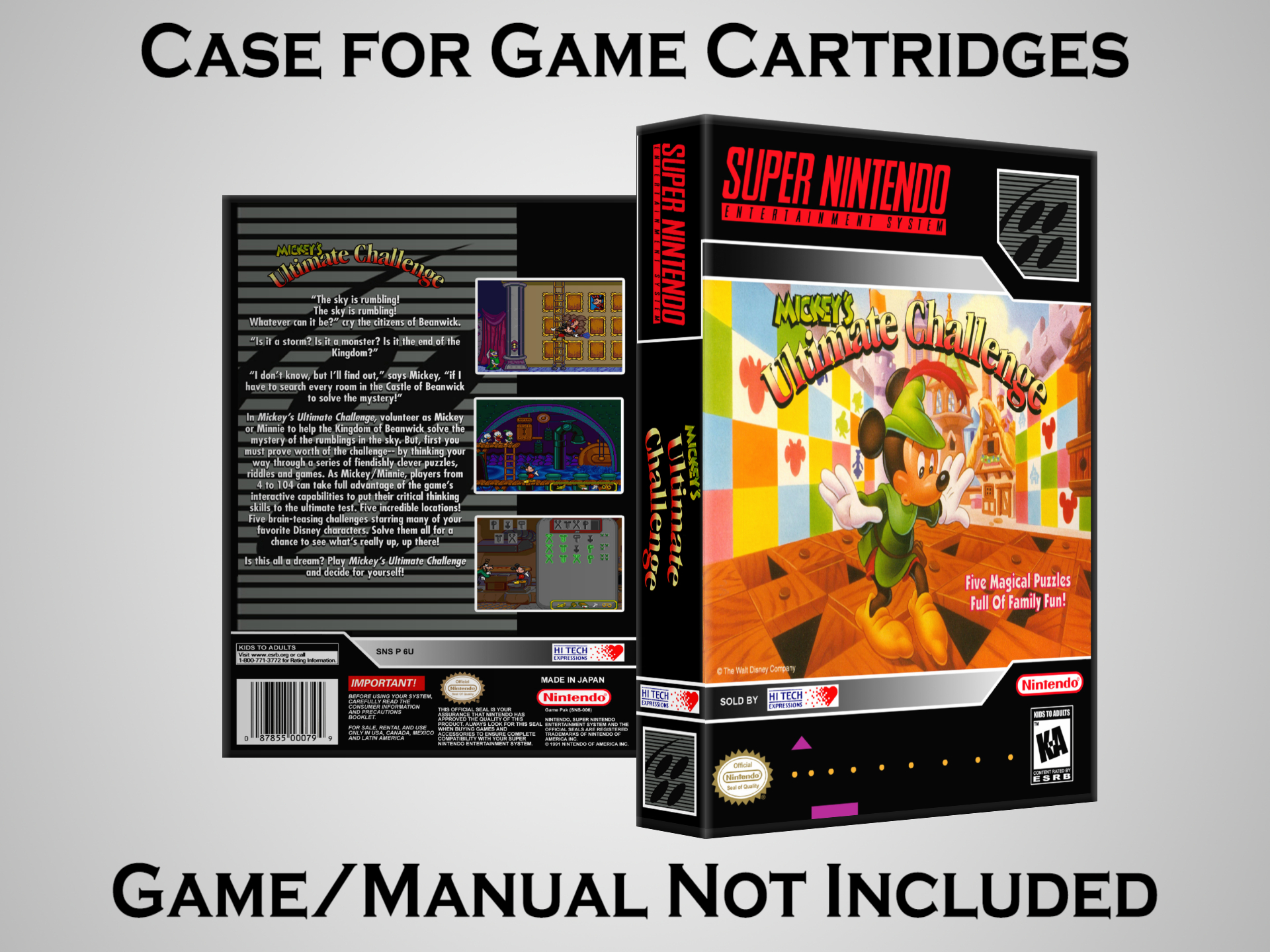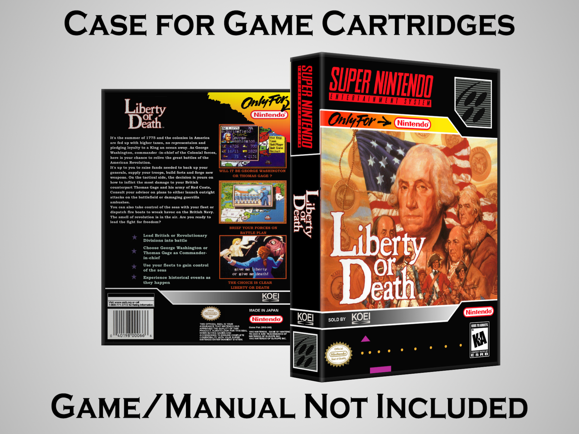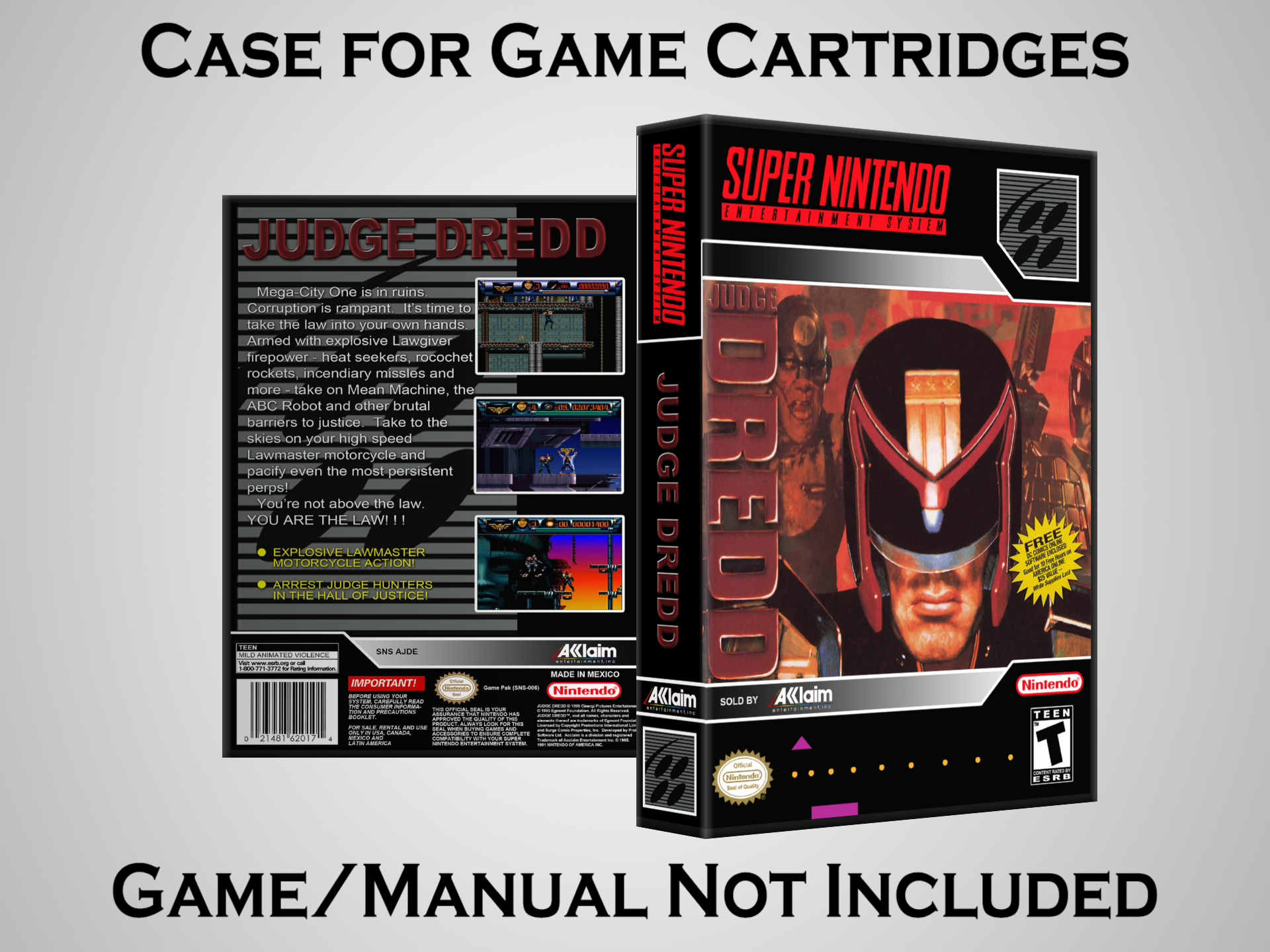 NO GAME OR MANUAL IS INCLUDED! This is NOT an original cardboard box. Case Dimensions : 7.25" x 5.25" x 1.125" Case Color : Dark Grey These cases are designed specifically to hold your Super Nintendo (SNES) cartridges. These are not the low quality Universal Game Cases that most other sellers offer. These firmly hold your cartridges in place, and include clips on the opposite side to hold the instruction manuals if you have them. Our Super Nintendo cases are split into multiple listings alphabetically due to the limit on options in one listing. You can find the rest of our cases in the following links: SNES Cases from # to F SNES Cases from G to N SNES Cases from O to S SNES Cases from T to Z Click here to find more cases in our eBay store!