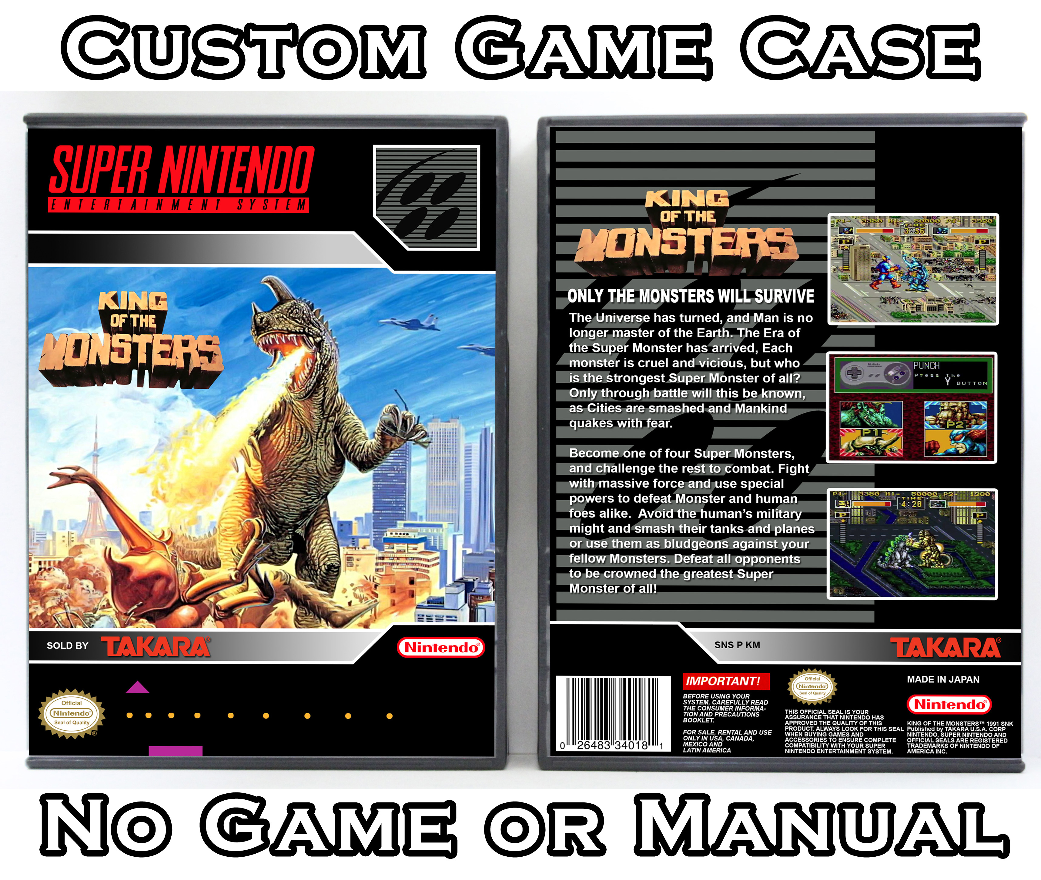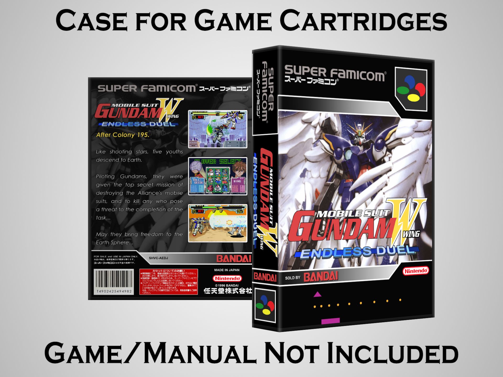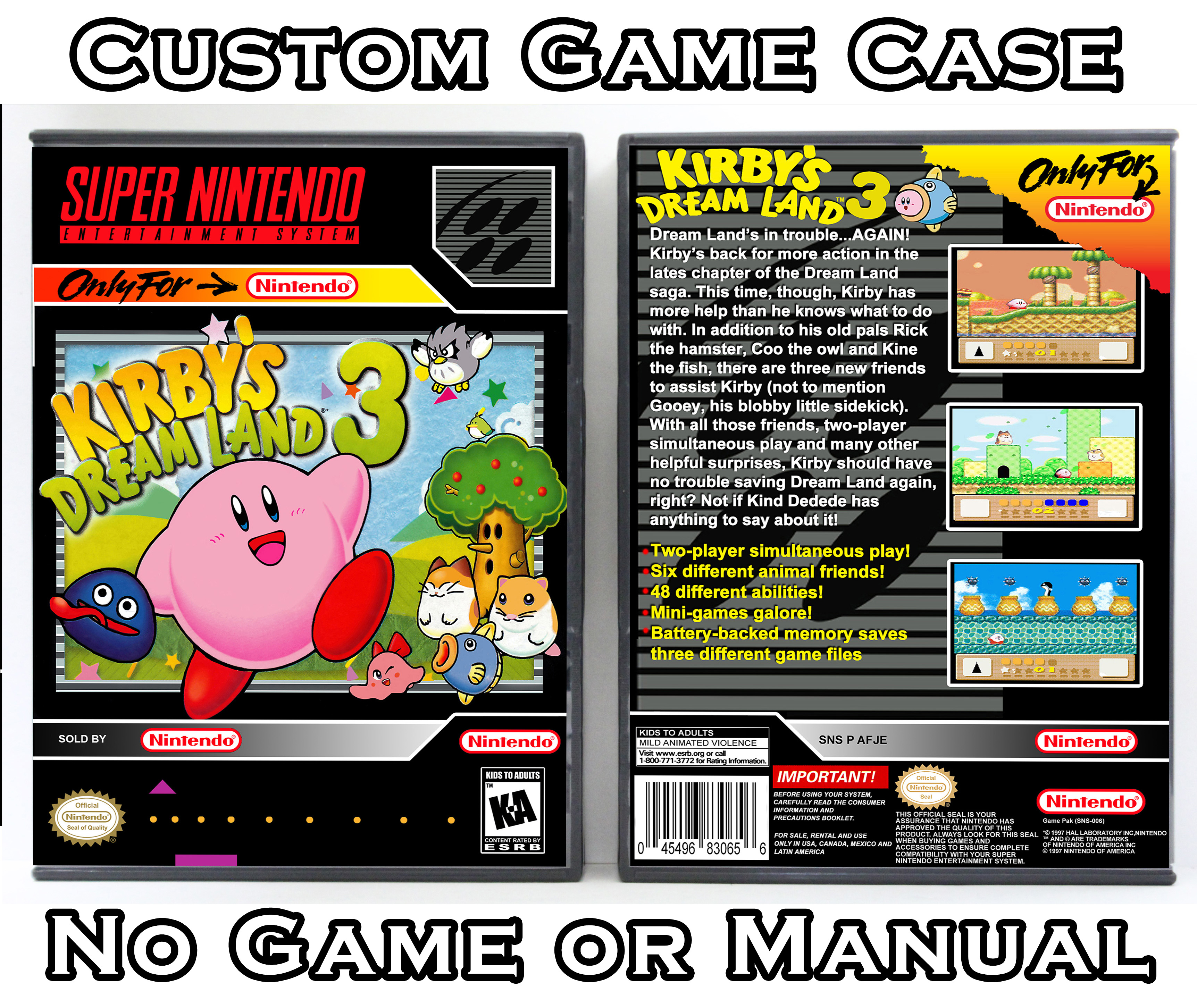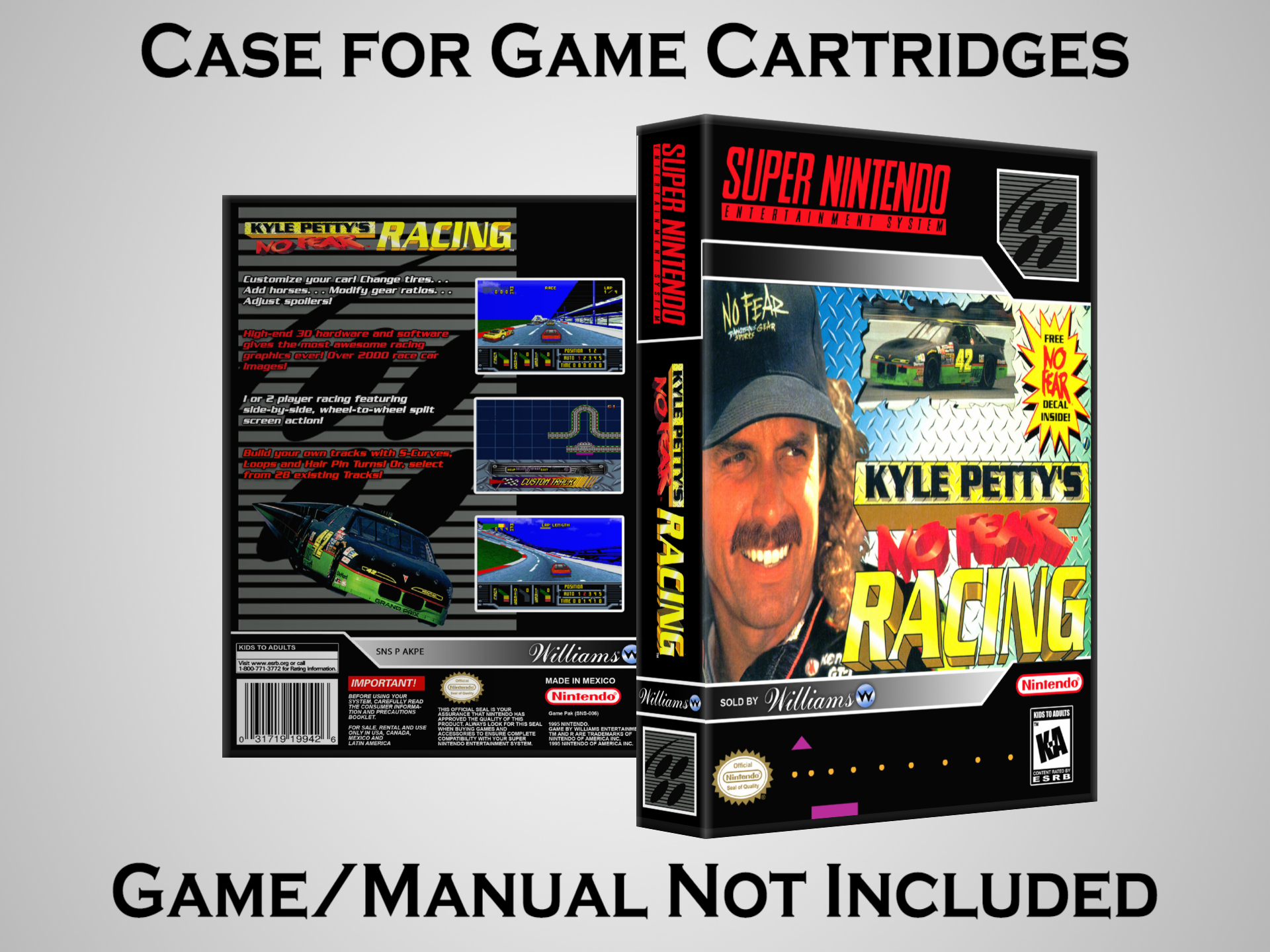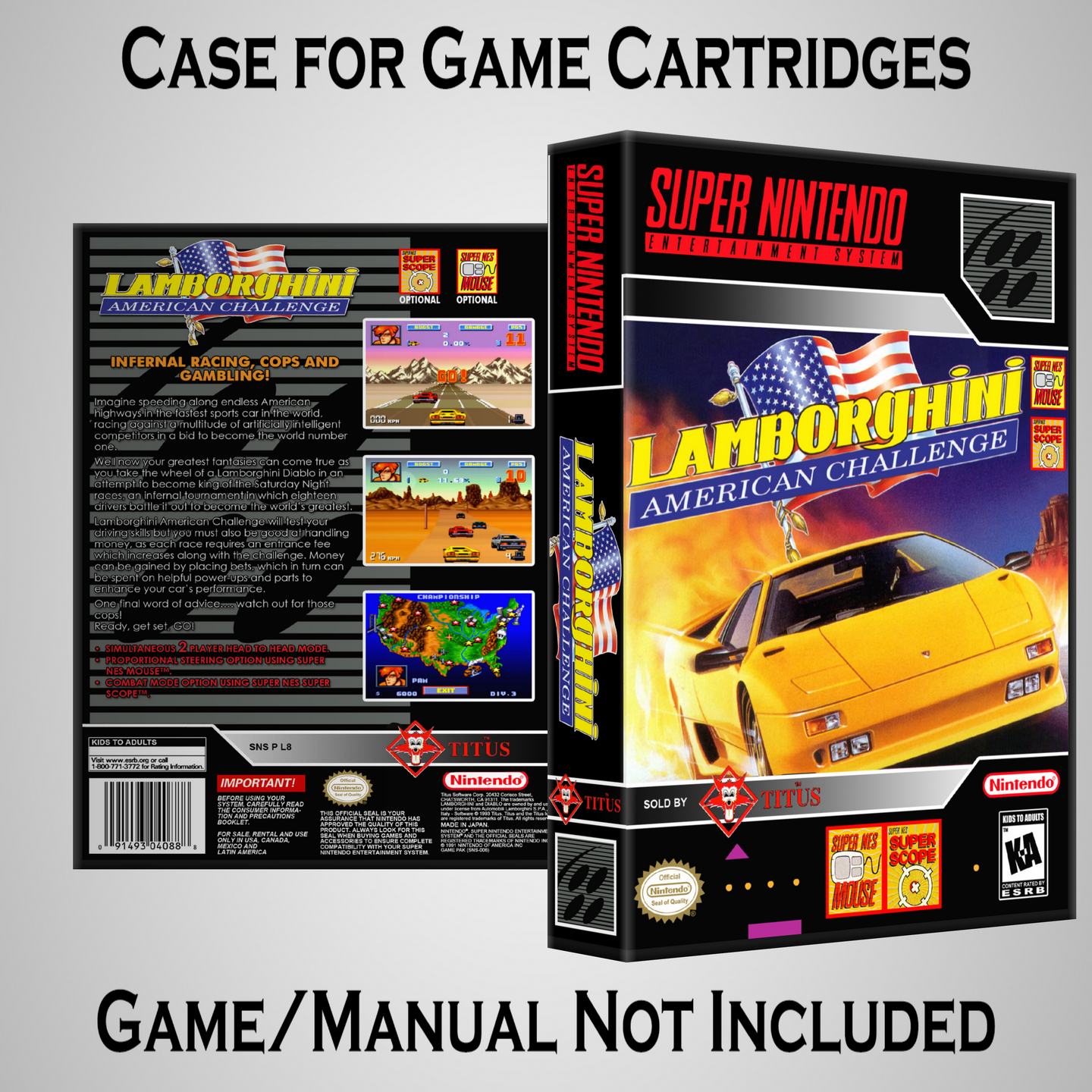 NO GAME OR MANUAL IS INCLUDED! This is NOT an original cardboard box. Case Dimensions : 7.25" x 5.25" x 1.125" Case Color : Dark Grey These cases are designed specifically to hold your Super Nintendo (SNES) cartridges. These are not the low quality Universal Game Cases that most other sellers offer. These firmly hold your cartridges in place, and include clips on the opposite side to hold the instruction manuals if you have them. Our Super Nintendo cases are split into multiple listings alphabetically due to the limit on options in one listing. You can find the rest of our cases in the following links: SNES Cases from # to F SNES Cases from G to N SNES Cases from O to S SNES Cases from T to Z Click here to find more cases in our eBay store!