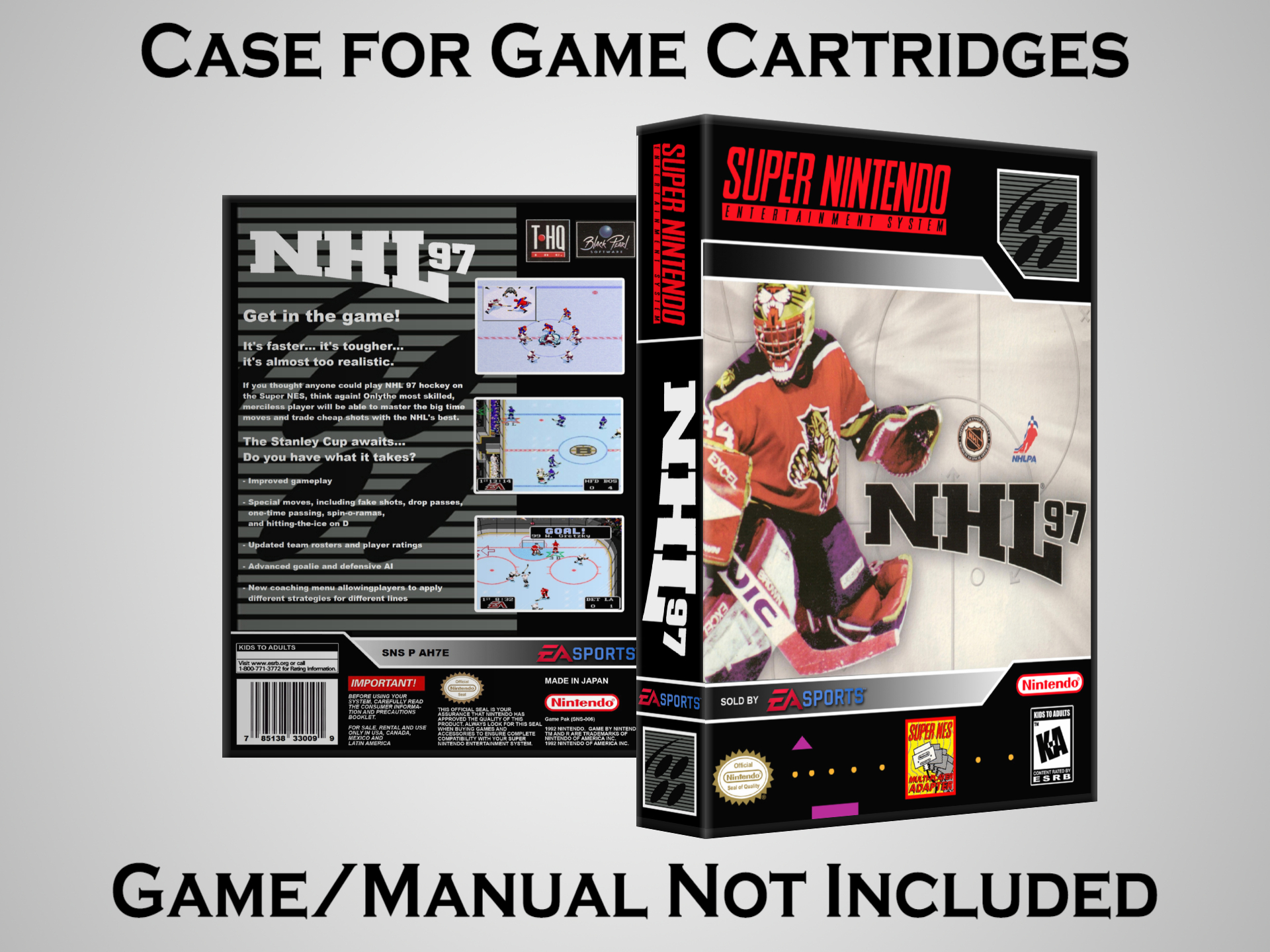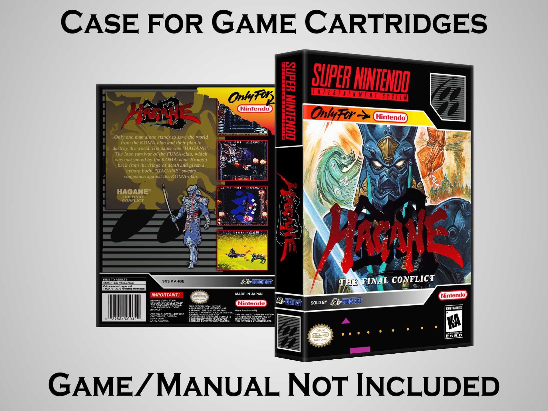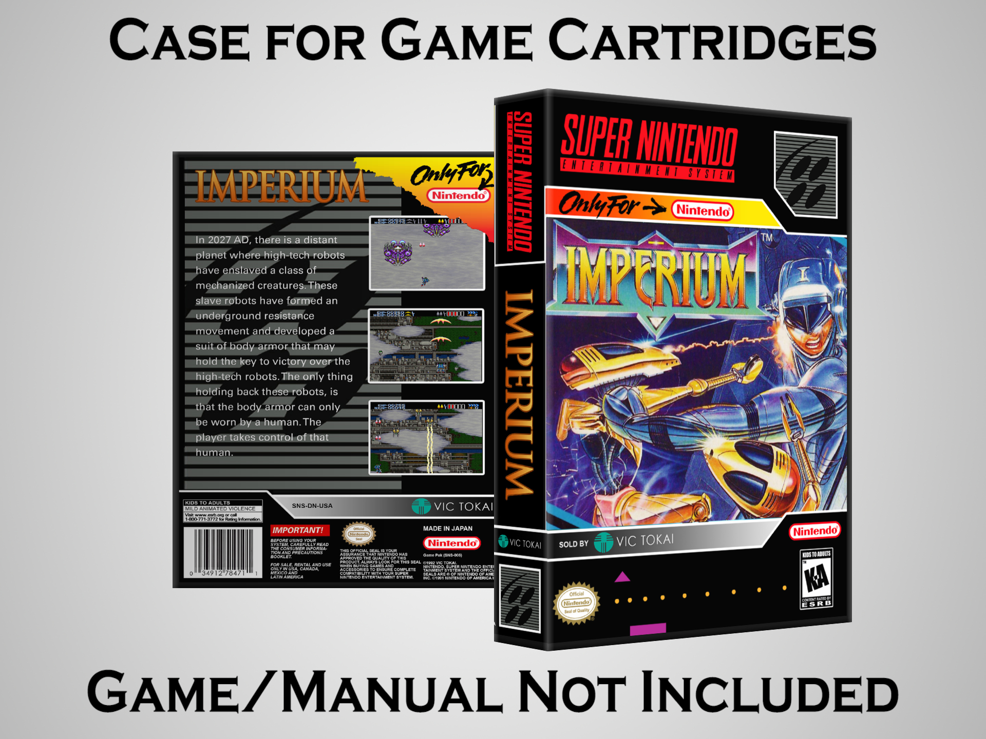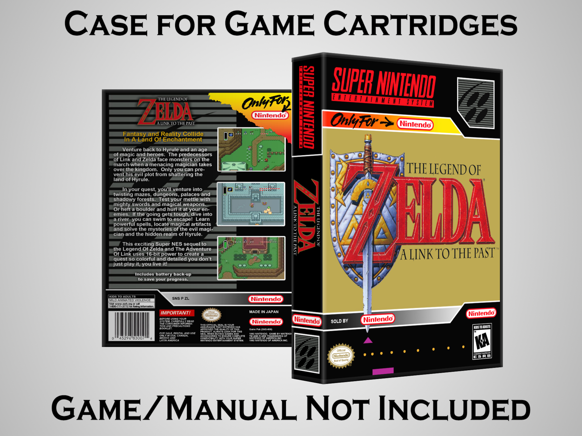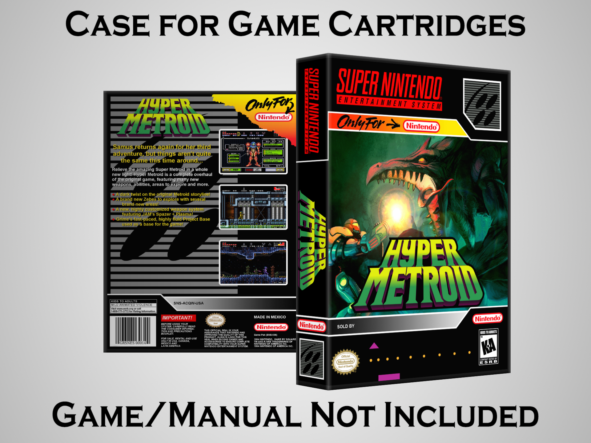 Perfect for collectors! This sturdy dark grey case fits SNES cartridges securely, with extra clips to hold manuals. Much better than flimsy universal cases—snaps shut tight and looks sleek on a shelf. Great for preserving your favorite games without the original box. Highly recommend!