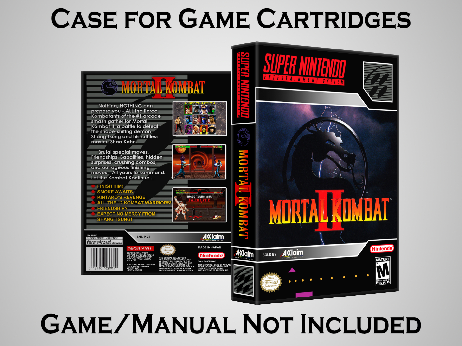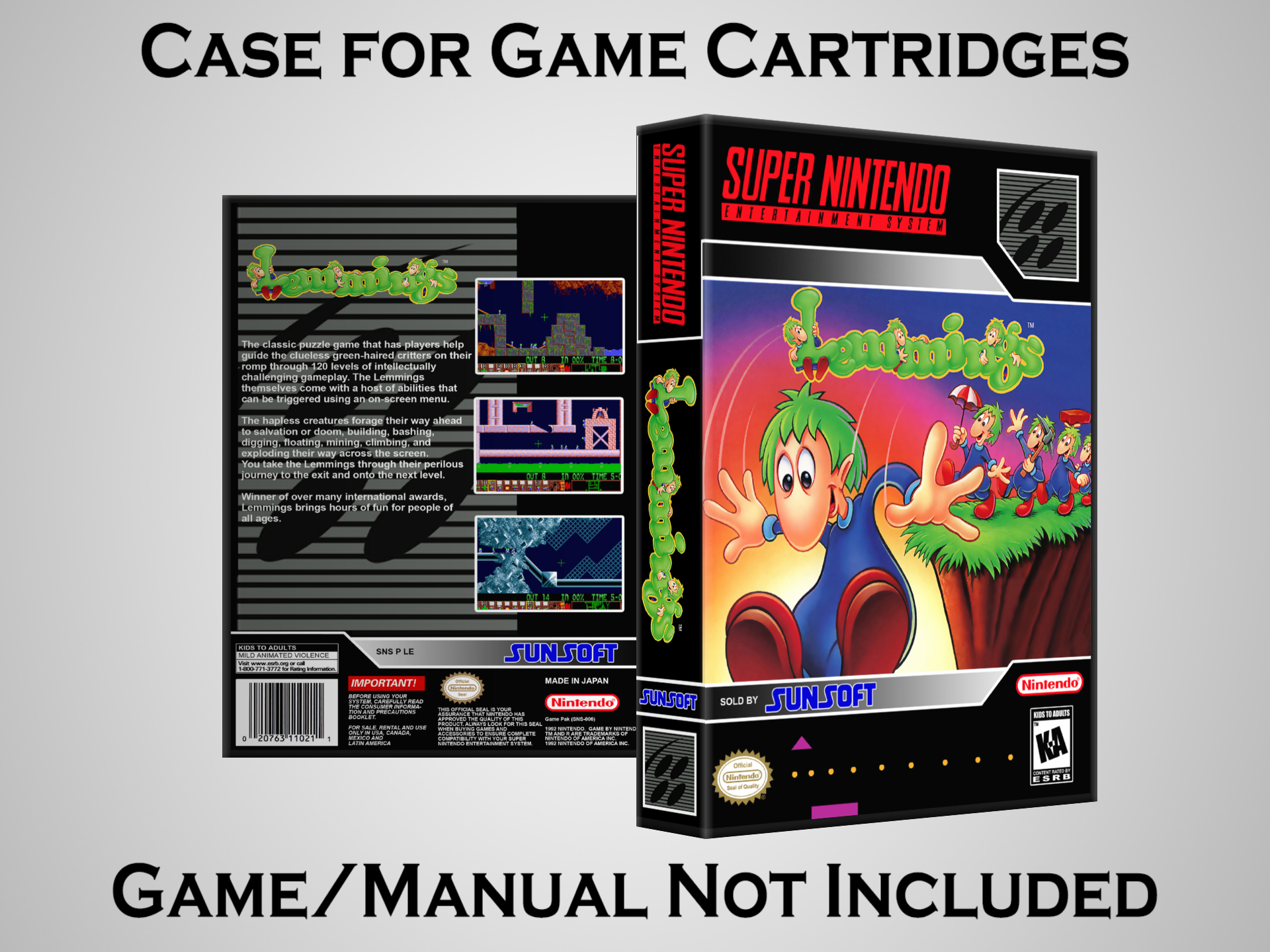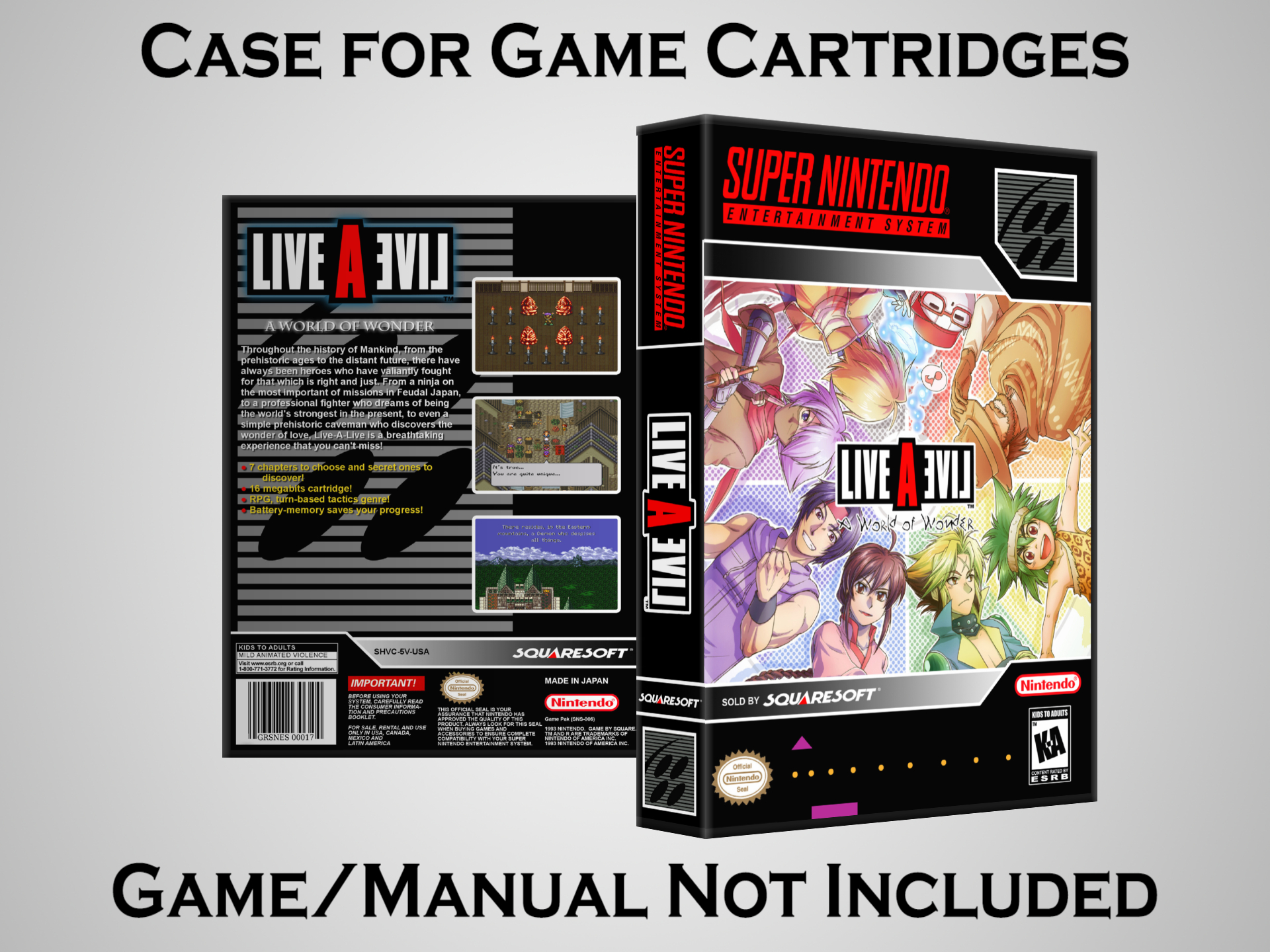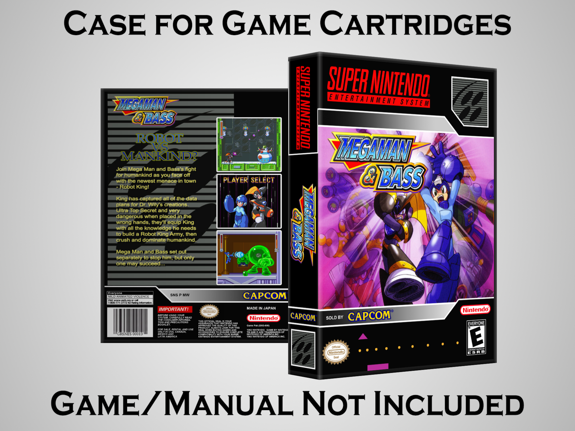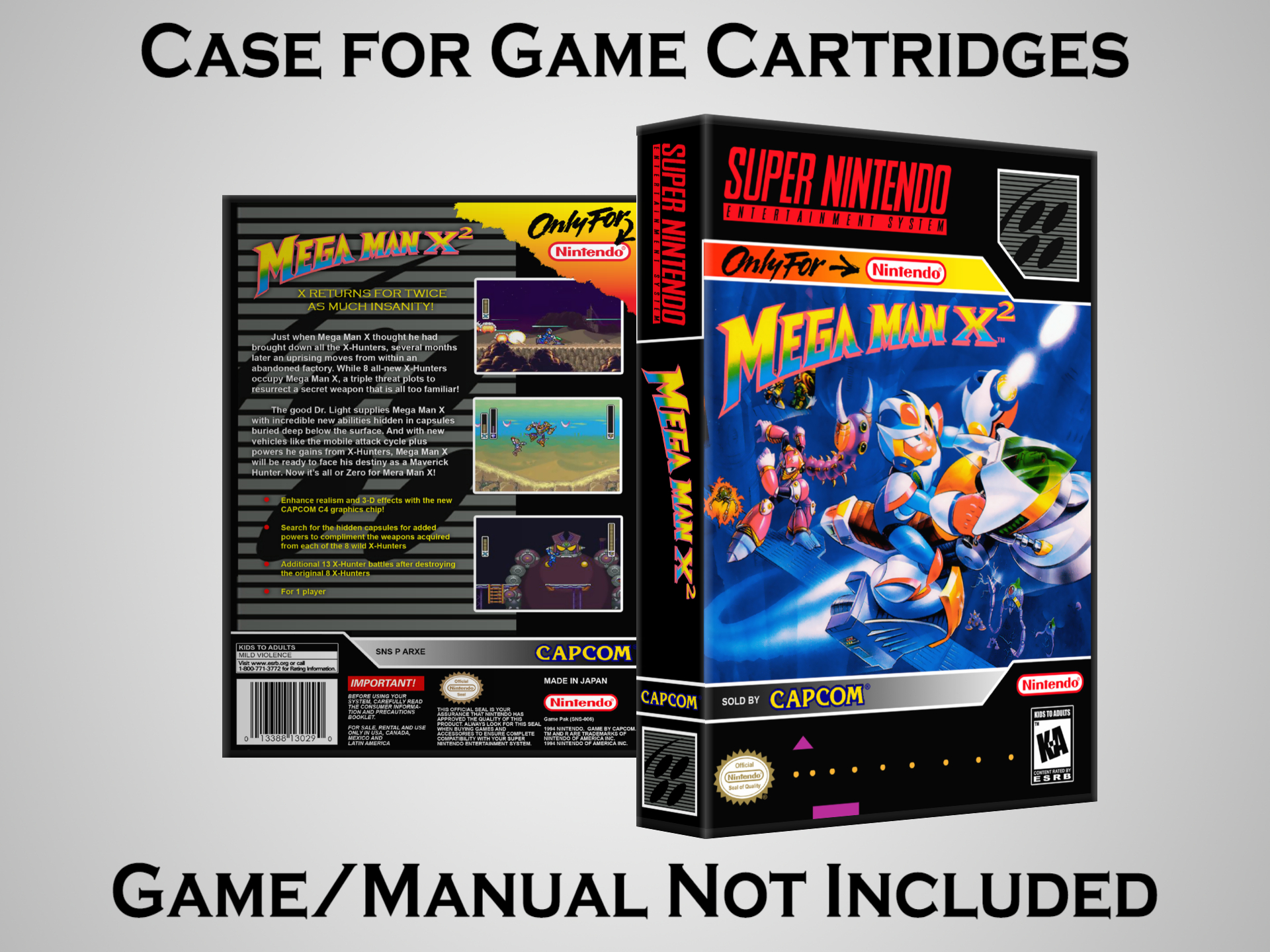 Perfect for collectors! This sturdy dark grey case fits SNES cartridges securely, with extra clips to hold manuals. Much better than flimsy universal cases—snaps shut tight and looks sleek on a shelf. Great for preserving your favorite games without the original box. Highly recommend!