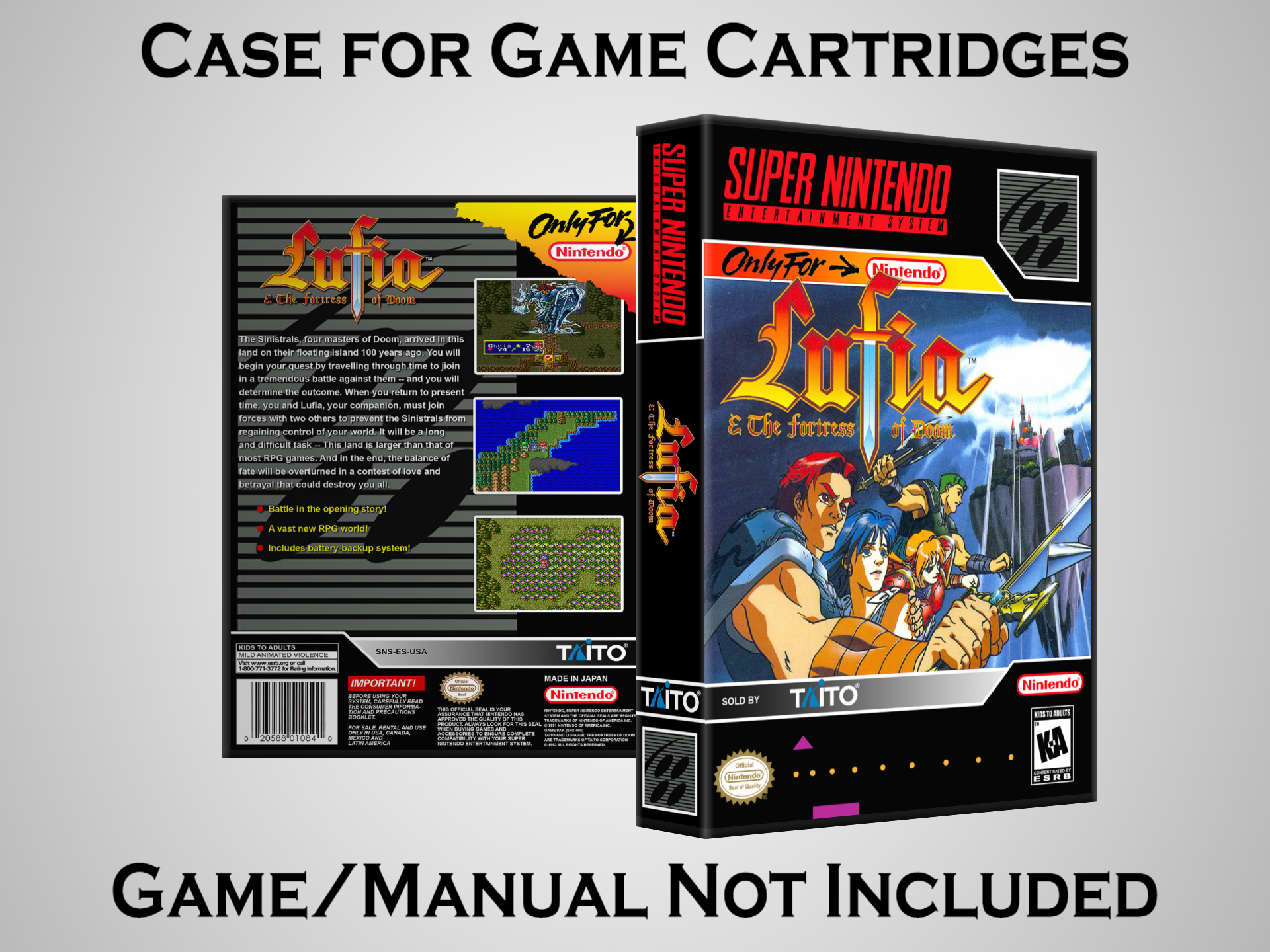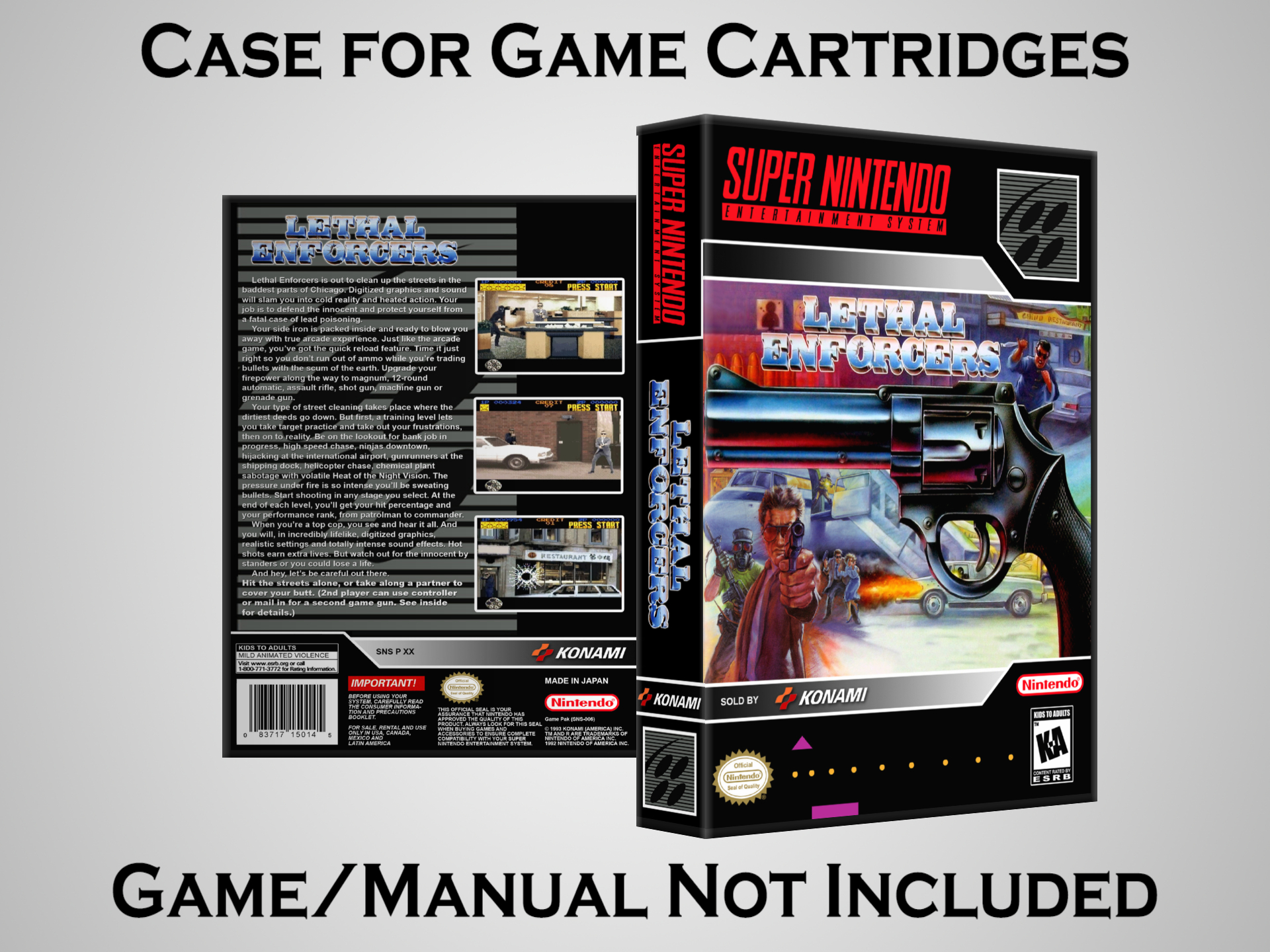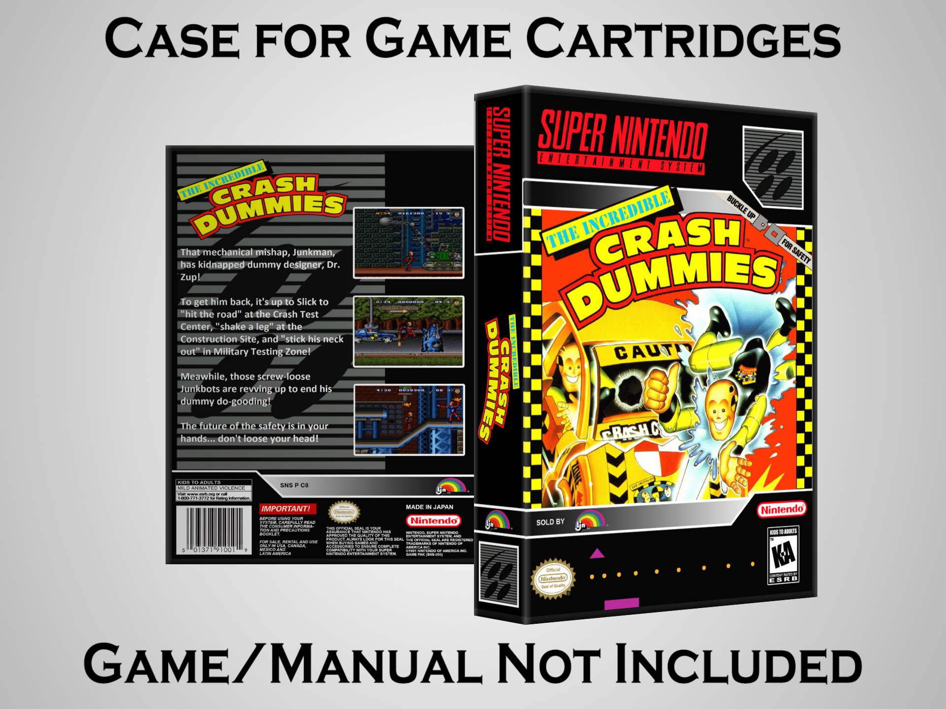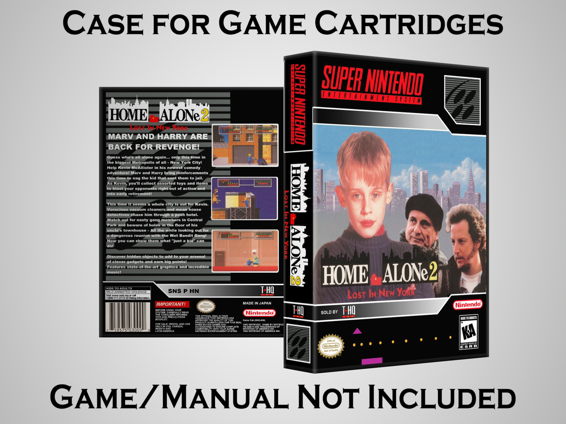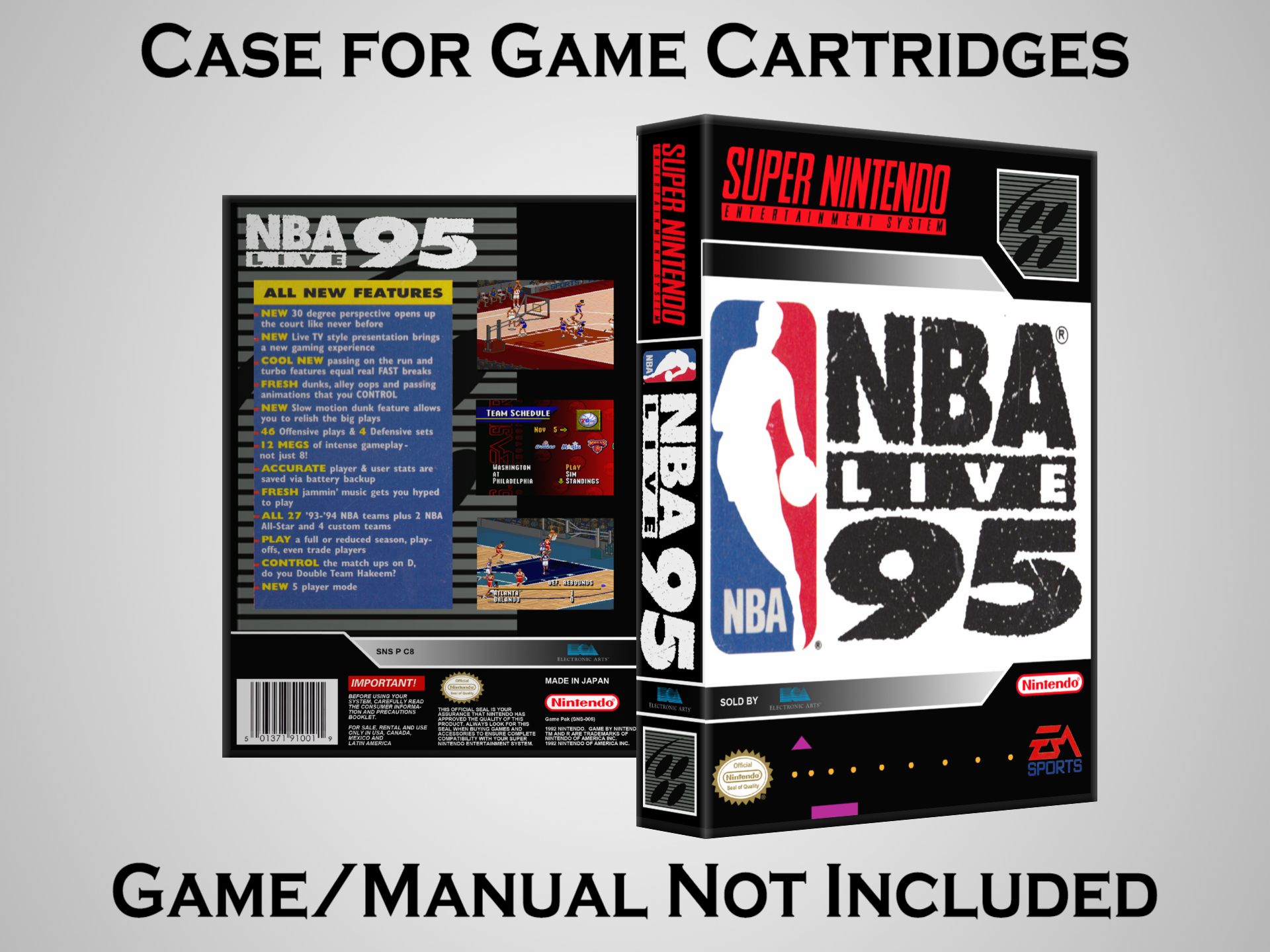 Perfect for collectors! This sturdy dark grey case fits SNES cartridges securely, with extra clips to hold manuals. Much better than flimsy universal cases—snaps shut tight and looks sleek on a shelf. Great for preserving your favorite games without the original box. Highly recommend!