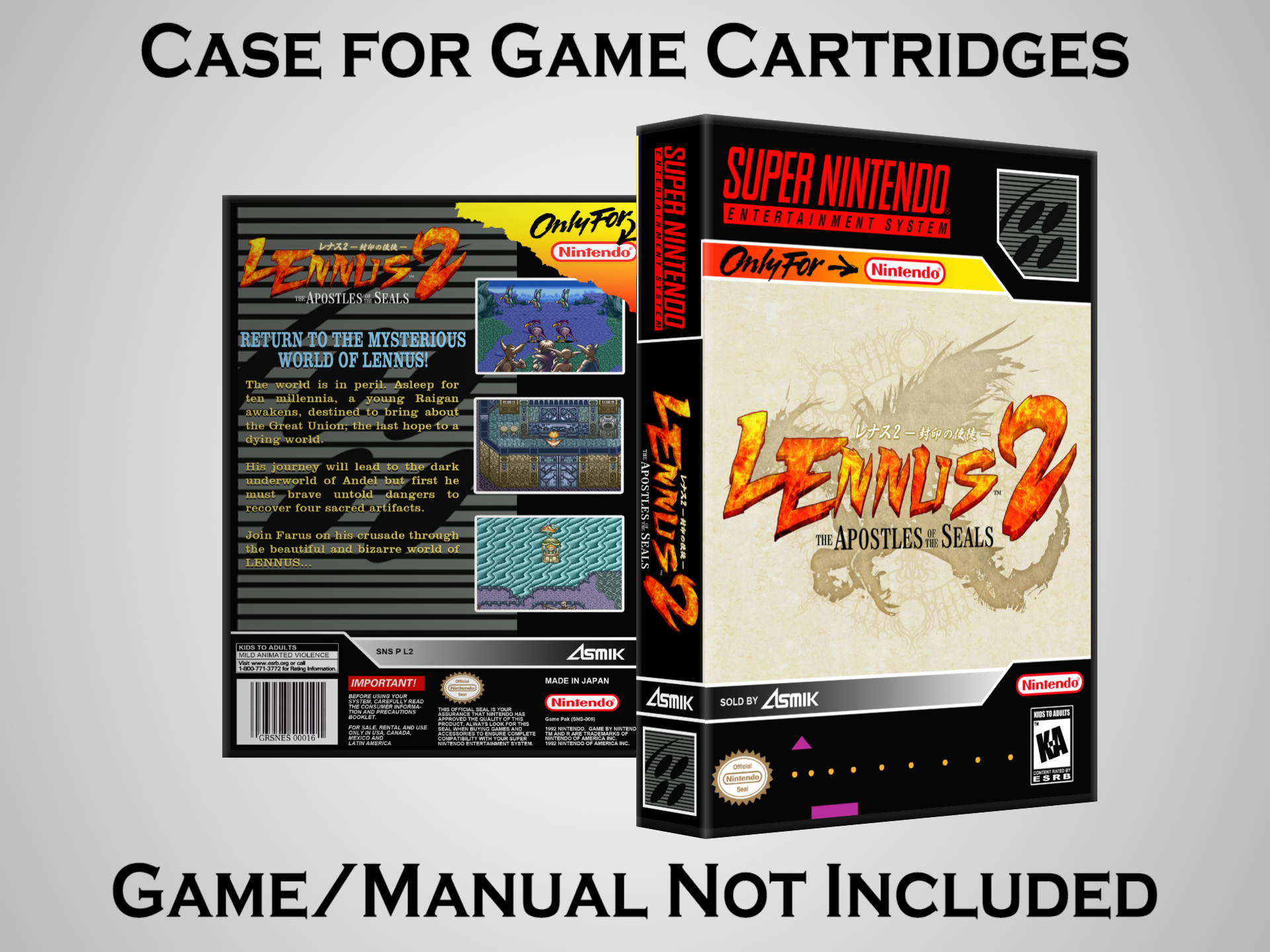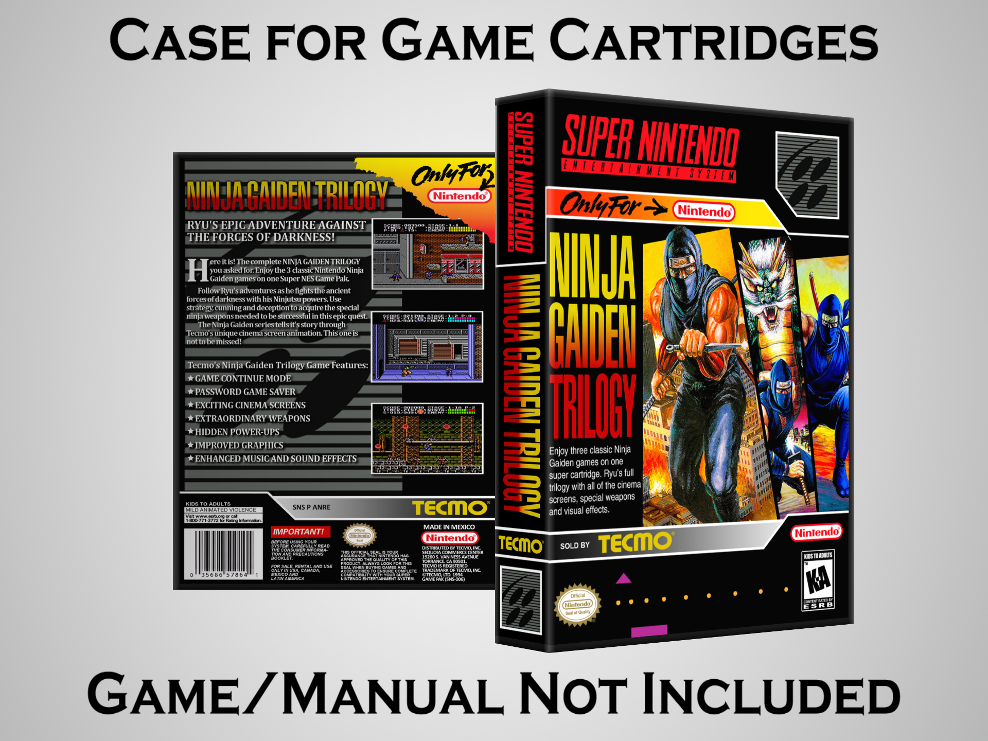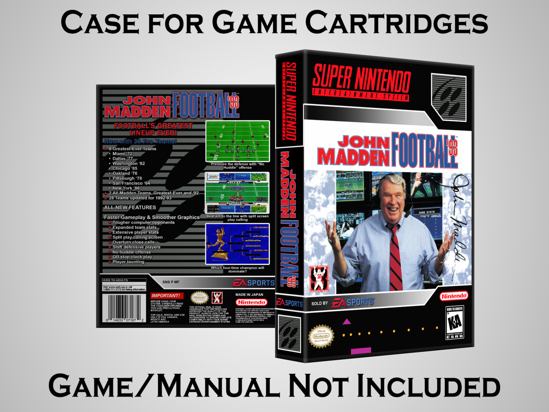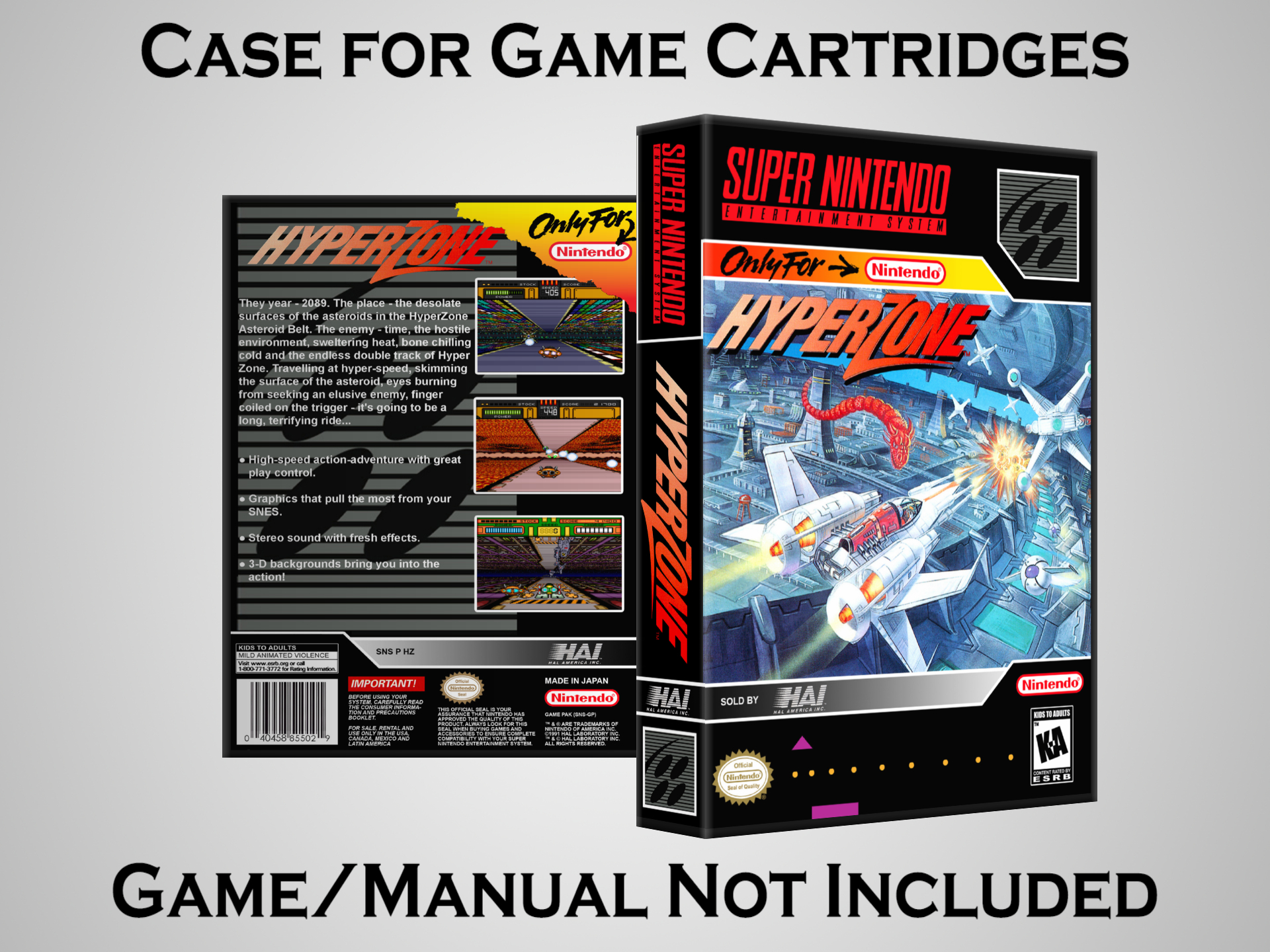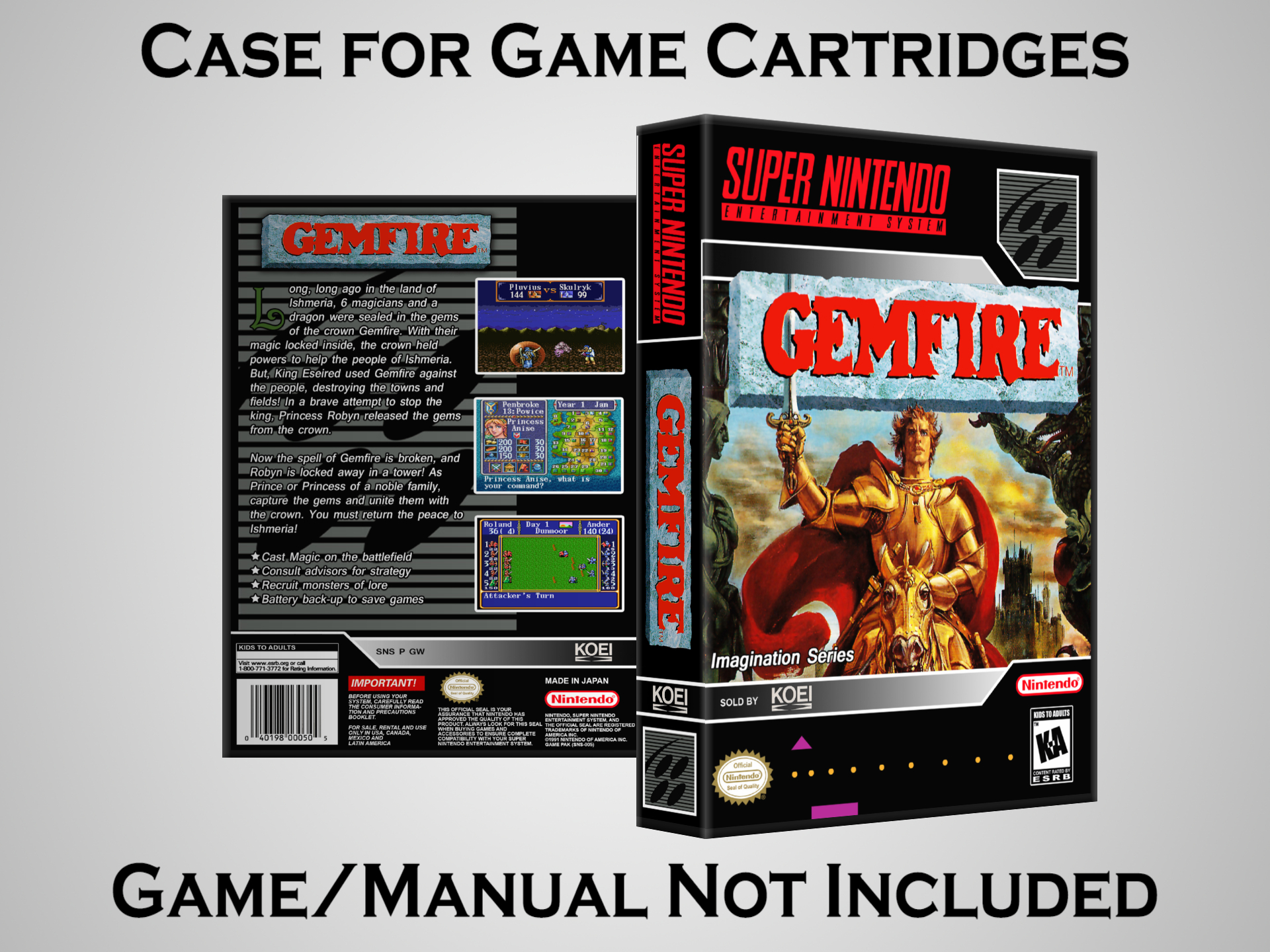 Perfect for collectors! This sturdy dark grey case fits SNES cartridges securely, with extra clips to hold manuals. Much better than flimsy universal cases—snaps shut tight and looks sleek on a shelf. Great for preserving your favorite games without the original box. Highly recommend!