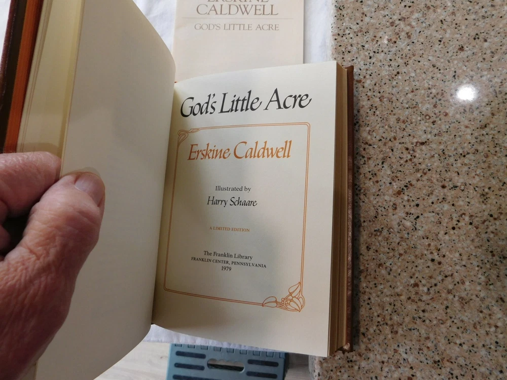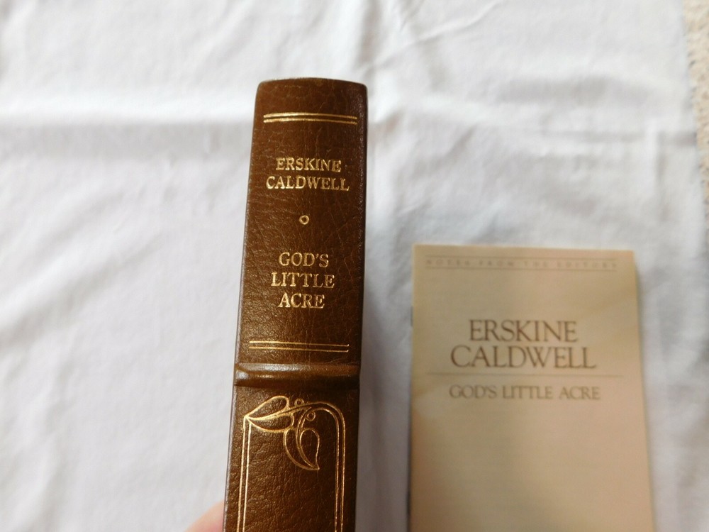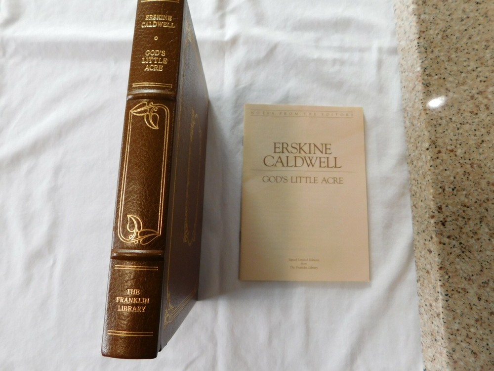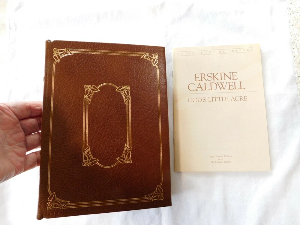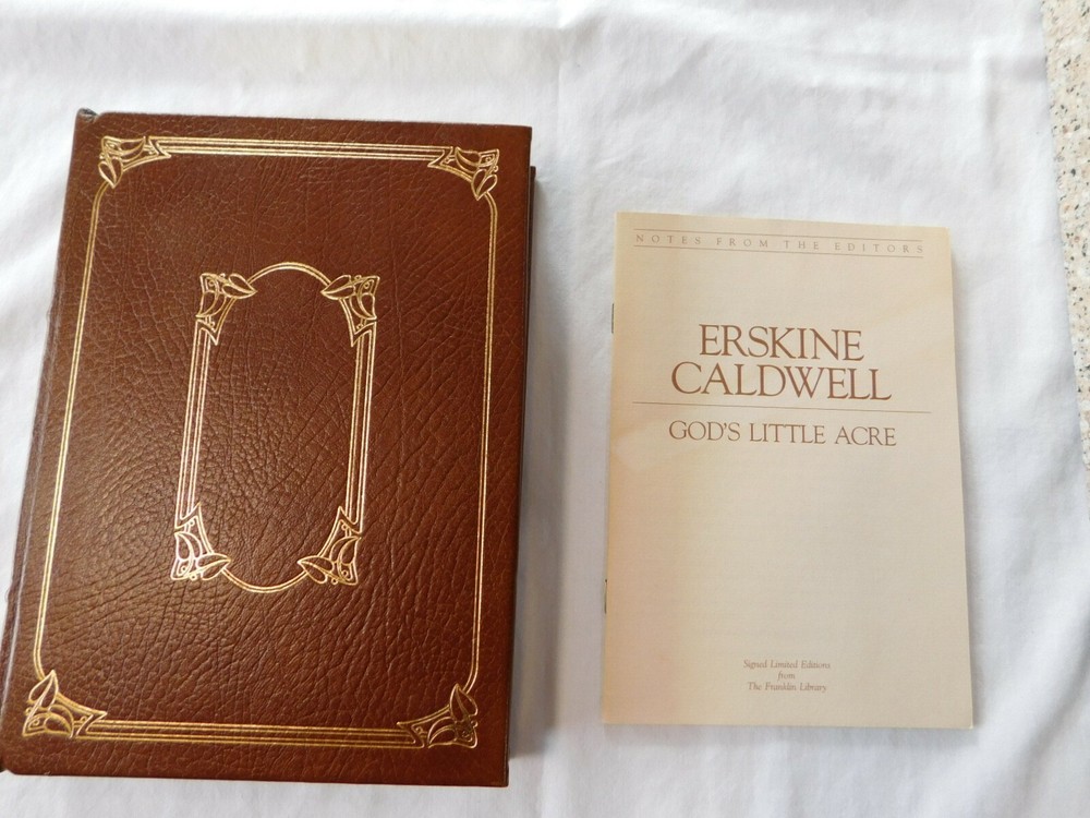 GOD'S LITTLE ACRE- Signed by Erskine Caldwell- Franklin Library-1979- Leather Bound- Absolutely Nice book. FRANKLIN LIBRARY 100 Series ... Leather Hardback with Gold Edging and Attached Ribbon Book Mark THIS BOOK IS SIGNED BY THE AUTHOR !! Protective Tissue Guard for Author’s Signature Page INCLUDES: “Notes From The Editors” booklet CONDITION: Very Good- Appears Unread. Note: I only partially opened the book to take pictures very carefully- This book was purchased, put on a bookshelf for display with others and never read. Shipping is via USPS Media Mail in a Book Box, Wrapped, Sealed and Taped A RARE BEAUTIFUL BOOK WITH EXQUISITE ILLUSTRATIONS - PERFECT FOR THAT GIFT THAT WILL LAST FOR GENERATIONS TO ENJOY!