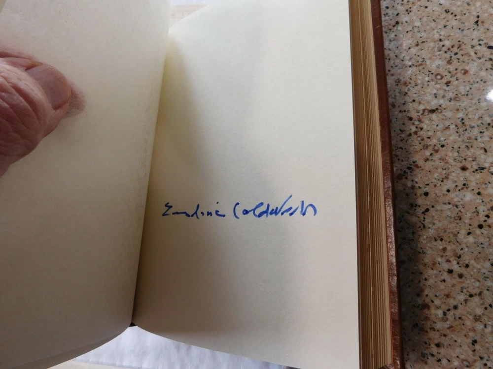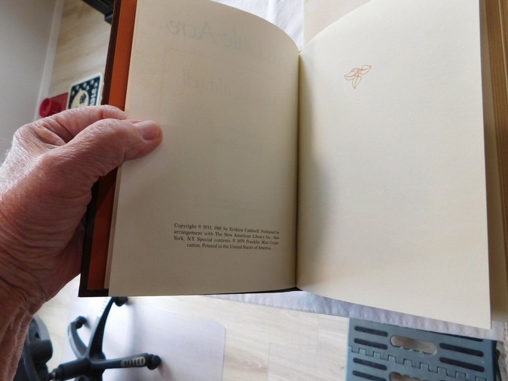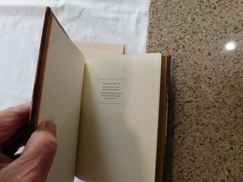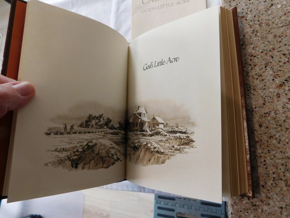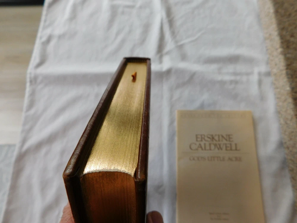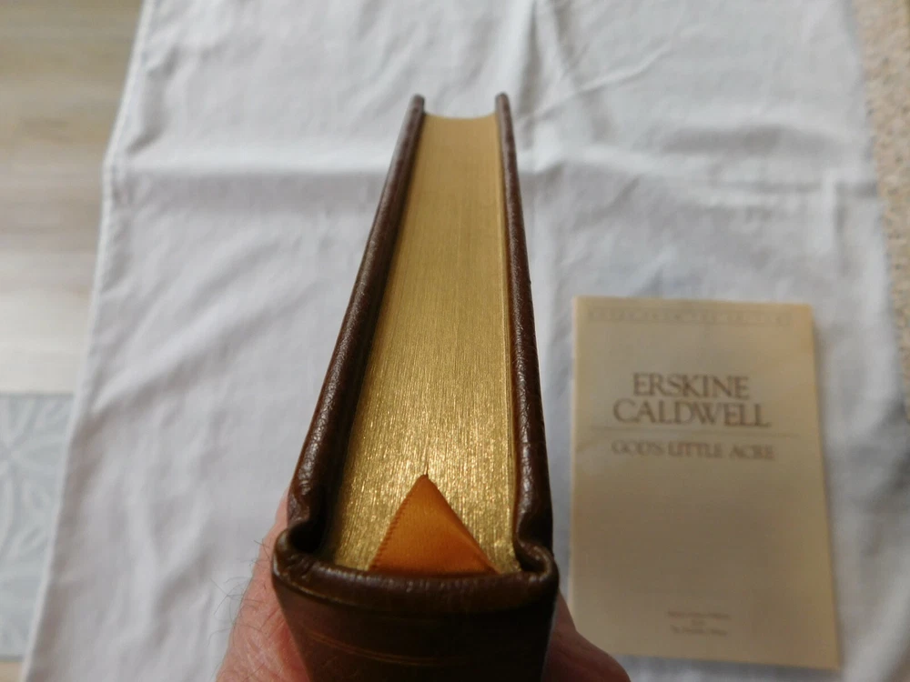 GOD'S LITTLE ACRE- Signed by Erskine Caldwell- Franklin Library-1979- Leather Bound- Absolutely Nice book. FRANKLIN LIBRARY 100 Series ... Leather Hardback with Gold Edging and Attached Ribbon Book Mark THIS BOOK IS SIGNED BY THE AUTHOR !! Protective Tissue Guard for Author’s Signature Page INCLUDES: “Notes From The Editors” booklet CONDITION: Very Good- Appears Unread. Note: I only partially opened the book to take pictures very carefully- This book was purchased, put on a bookshelf for display with others and never read. Shipping is via USPS Media Mail in a Book Box, Wrapped, Sealed and Taped A RARE BEAUTIFUL BOOK WITH EXQUISITE ILLUSTRATIONS - PERFECT FOR THAT GIFT THAT WILL LAST FOR GENERATIONS TO ENJOY!
