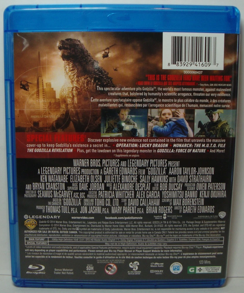 This listing is for: GODZILLA 2014 BLU-RAY This Blu-ray is in good condition. It has been tested and is working. It comes with what is pictured. Please see pictures to judge the condition for yourself. Take a look at my other listings. I am more than happy to combine shipping if you buy multiple items. Feel free to send a message if you have any questions! By law, I am required to charge sales tax to Canadians: 5% in Alberta, British Columbia, Manitoba, Northwest Territories, Nunavut, Quebec, Saskatchewan, and Yukon 13% in Ontario 15% in New Brunswick, Newfoundland and Labrador, Nova Scotia, and Prince Edward Island