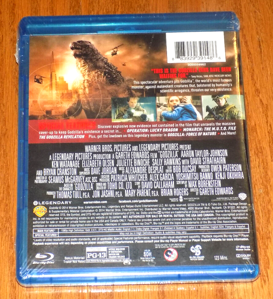 This is a Blu-ray edition of the movie "Godzilla" released in 2014, directed by Gareth Edwards. The film features actors such as Aaron Taylor Johnson, Ken Watanabe, and Elizabeth Olsen in a PG-13 rated action and sci-fi genre. The Blu-ray disc includes special features like commentary, additional scenes, and behind-the-scenes featurettes, making it an exciting addition for fans of the Godzilla franchise. The movie is in English with English subtitles, and the aspect ratio is 16:9, providing an immersive viewing experience for audiences in regions with Blu-ray Region Code A.