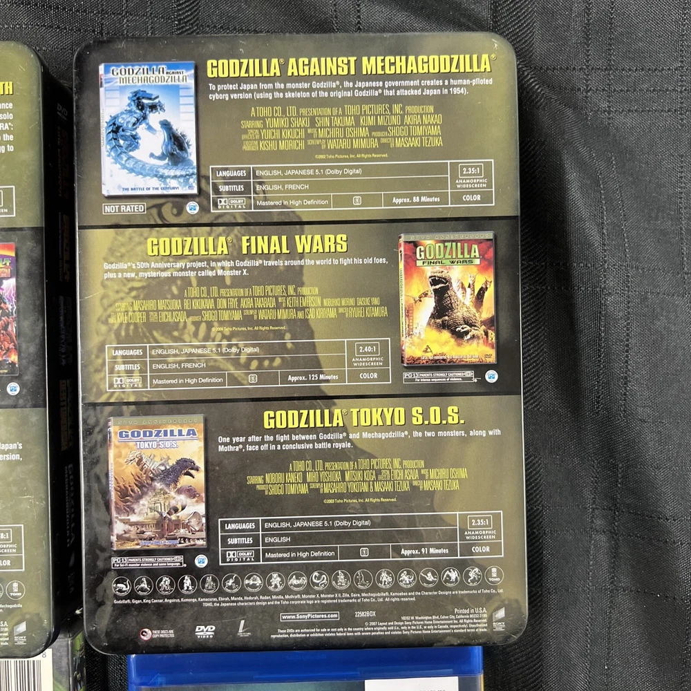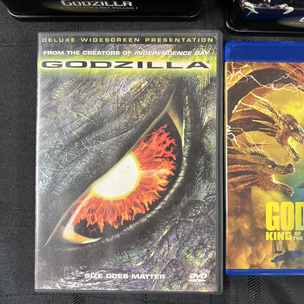 You are purchasing a really nice GODZILLA DVD Collection. You get 9 DVD Discs (9 Total Movies) with over 1100 total run time minutes! The boxes that house the collection are in ok condition (some yellowing & surface wear) with the steel boxes in better shape! All the Discs themselves are in excellent condition. You get the following movies: Disc I - 1998 GODZILLA 139 MINUTES Disc II & III - 2019 GODZILLA KING OF MONSTERS - BLUE RAY & DVD - 278 MINUTES Disc IV -VIII - GODZILLA COLLECTORS BOX SET V. 1 ( 5 MOVIES) -GODZILLA VS. KING GHIDORA -GODZILLA VS MOTHRA -GODZILLA VS SPACE GODZILLA -GODZILLA VS DESTOROYAH -GODZILLA VS MECHAGODZILLA II Disc IX - XI - GODZILLA COLLECTORS BOX SET V.2. (3 MOVIES) - GODZILLA TOKYO SOS - GODZILLA VS MECHAGODZILLA - GODZILLA 2000 “GET READY TO CRUMBLE” (THIS MOVIE REPLACES A DAMAGED GODZILLA FINAL WARS) This listing Ships USPS Ground Advantage! FREE SHIPPING!!