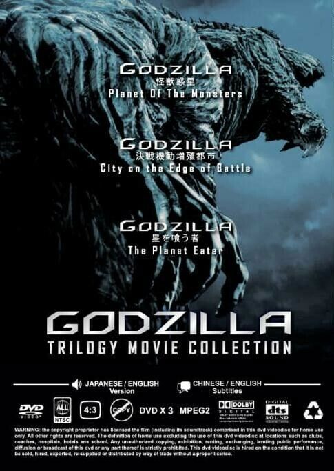 Synopsis MOVIE 1 : GODZILLA : PLANET OF THE MONSTERS (1h 29m) MOVIE 2 : CITY ON THE EDGE OF BATTLE (1h 41m) MOVIE 3 : THE PLANET EATER (1h 30m) DVD Details Disc Quantity : 3 Discs Episodes : 3 Movies Version@Language : Japanese / English Subtitles : English / Chinese Format & Region : DVD9 / NTSC & All region code ( 16: 9 ) Duration : Approx. 280 Minutes Genres : Action, Adventure, Sci-Fi Shipping & Handling Details Shipment open to Worldwide. Free shipment to all COUNTRY!! Product is well packed using bubble padded envelope/boxes to protect from damages Product shipped using Express Mail with Traceable Postage . Tracking code will be provided to customers. Shipment Notification will give to the customer once the product is shipped. For Worldwide Shipment , please allow 7 - 14 days for your item to arrive. Replacement Policy We are 100% committed to ensuring our customers are satisfied with their purchase. Any product found to be faulty, We will issue new replacement discs. Products are FULLY INSURED (Any shipment lost in shipment will be replace with a new set or fully refund) Contact us for more information. Customers Notes Please contact us before leaving any bad FEEDBACKS or DISPUTES. We provide after sales service