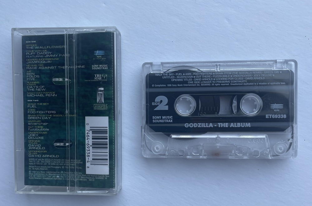 Various – Godzilla (The Album) Label: Epic – 074646933848 Format: Cassette , Album Country: US Released: 1998 Genre: Hip Hop , Rock , Stage & Screen Style: Alternative Rock , Heavy Metal , Punk , Soundtrack Tracklist 1 The Wallflowers – Heroes 3:56 2 Puff Daddy featuring Jimmy Page – Come With Me 6:06 3 Jamiroquai – Deeper Underground 4:42 4 Rage Against The Machine – No Shelter 4:03 5 Ben Folds Five – Air 3:20 6 Days Of The New – Running Knees 3:41 7 Michael Penn – Macy Day Parade 4:18 8 Fuel (3) – Walk The Sky 3:17 9 Foo Fighters – A320 5:45 10 Green Day – Brain Stew (The Godzilla Remix) 3:57 11 Silverchair – Untitled 3:30 12 Fuzzbubble – Out There 2:48 13 Joey Deluxe – Undercover 5:11 14 David Arnold – Opening Titles 2:43 15 David Arnold – Looking For Clues 1:48 Barcode and Other Identifiers Barcode: 074646933848