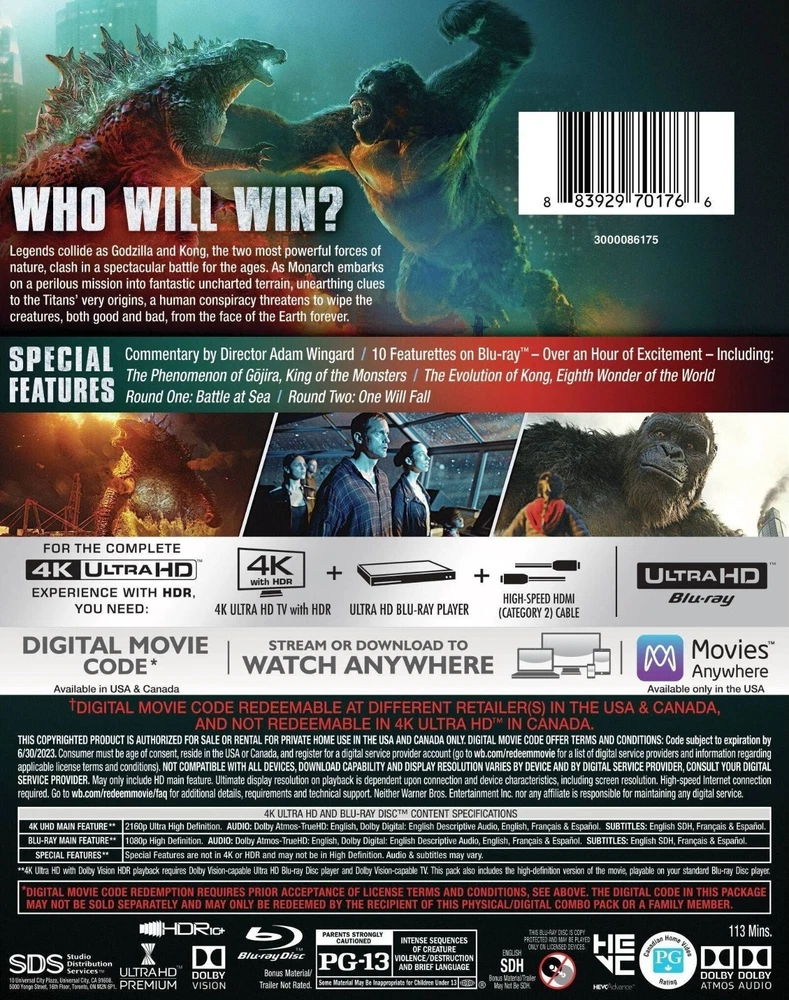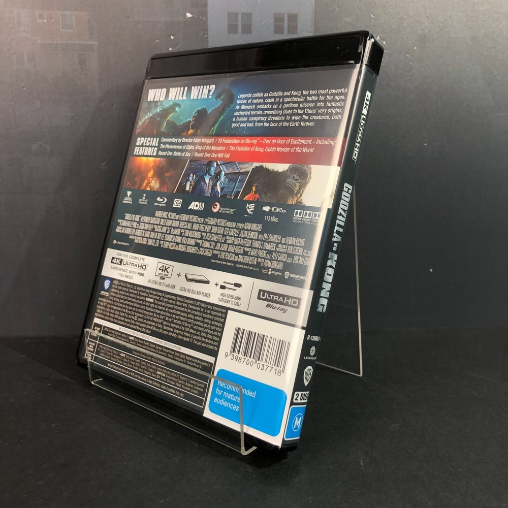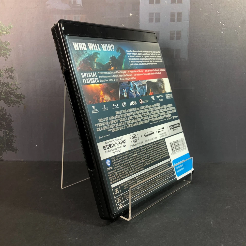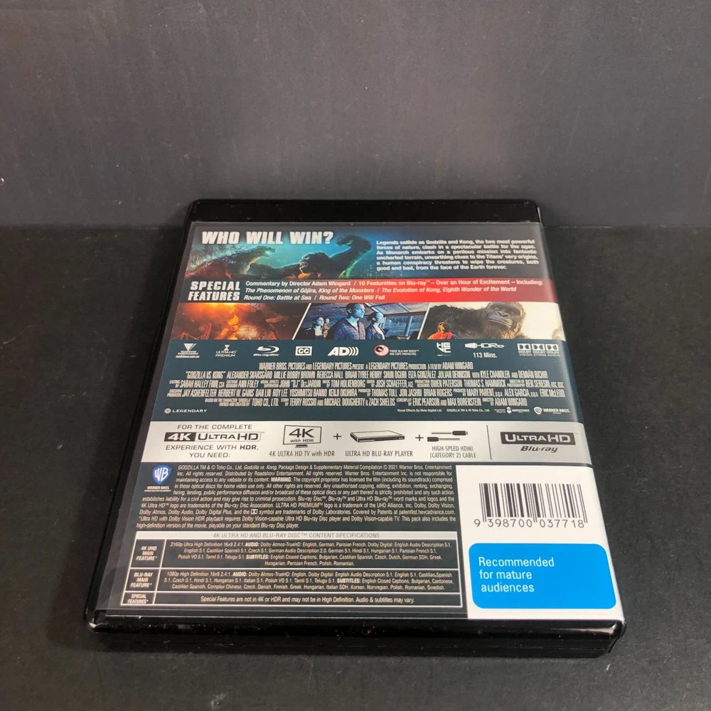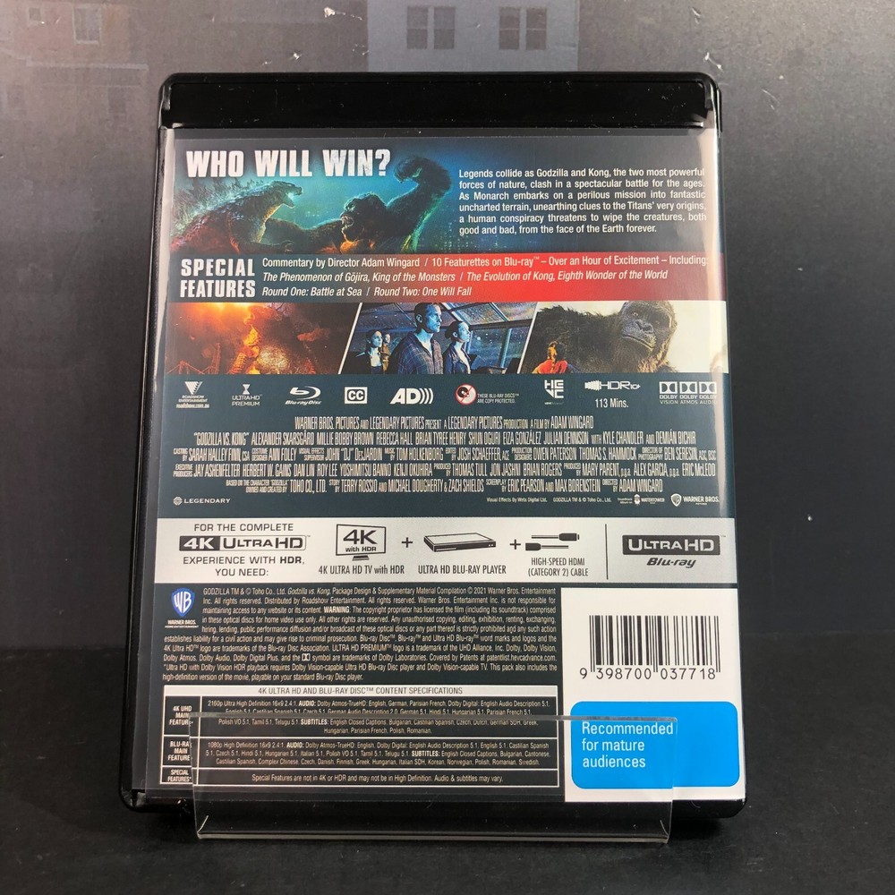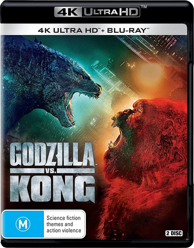 Presenting GODZILLA VS. KONG (ROADSHOW ENTERTAINMENT) 4K ULTRA HD + BLU-RAY - Journey to the center of the Earth with this thunderous, earth-shaking blockbuster that delivers exactly what its title promises—a no-holds-barred battle between two of cinema’s most legendary titans. This two-disc set is housed in a dual-hub, eco-friendly keepcase featuring poster-style cover art. As the fourth entry in Legendary Pictures’ MonsterVerse and distributed by Warner Bros. Pictures, Godzilla vs. Kong stands tall as one of the most thrilling and satisfying films in either franchise's modern history. Director Adam Wingard unleashes a visually spectacular showdown, complete with jaw-dropping effects, colossal-scale action, and even a surprise third combatant for good measure. This premium release boasts a native 4K Dolby Vision transfer that stuns with razor-sharp detail, natural colors, inky blacks, and radiant highlights. The Dolby Atmos audio track is equally impressive—fully immersive, richly layered, and packed with room-shaking bass that puts you right in the middle of the action. Whether you're team Godzilla or team Kong, this film is a must-own cinematic spectacle. Includes both 4K Ultra HD and Blu-ray discs. Runtime: 114 minutes. Rated M (ACB). Release date: June 23, 2021. A visual and sonic powerhouse, Godzilla vs. Kong arrives on 4K Ultra HD with a native Dolby Vision transfer that is nothing short of reference-quality. The 3840 x 2160p image, presented in a widescreen 2.39:1 aspect ratio and encoded with 10-bit video depth, HDR10, and Dolby Vision via the HEVC (H.265) codec, offers a stunning level of clarity and depth. Captured digitally using Arri Alexa 65 and Arri Alexa Mini cameras in resolutions up to 6.5K and completed with a true 4K digital intermediate, this transfer is pristine from start to finish. Detail is consistently pin-sharp—whether it’s human skin textures, the intricate fur and scales of the titans, the lush foliage of Skull Island, or the glowing cityscapes of neon-lit Hong Kong. From scrolling news tickers and control room interfaces to breathtaking shots over refugee camps and sweeping vistas of Hollow Earth, the image delivers absolute precision. The use of Wide Colour Gamut and HDR amplifies every frame with rich, vivid tones, from earthy jungle hues to dazzling city lights. Skin tones remain natural, sunsets look painterly, and the vivid, psychedelic visuals during the descent into Hollow Earth are mesmerizing. The heat of explosions radiates from the screen, almost tangible. Black levels are deep and inky, creating exceptional depth and dimensionality, while bright highlights—particularly from neon signage—are brilliantly intense. The digital source is impeccably clean, free from compression artifacts or digital noise, making for an outstanding visual presentation. Matching the video quality is a Dolby Atmos audio track that truly lives up to the film’s titan-sized spectacle. Bass performance is exceptional—layered, powerful, and deeply resonant. From the opening credits onward, the track delivers room-shaking, subsonic effects that add serious weight to every roar, crash, explosion, and building collapse. The low-end presence rivals even the most intense sci-fi blockbusters, reminiscent of Edge of Tomorrow in sheer force. Surround channels and overhead speakers are used to full effect, offering a 360-degree immersion that pulls the listener into every environment—from the windswept forests of Skull Island to the high-tech corridors of the Apex command centers. The sound design is precise and cinematic, with alarms and overhead systems rendered with pinpoint directionality. During battle sequences, the soundscape envelops the room, putting the viewer squarely in the middle of the chaos, while quieter moments maintain rich ambient detail and atmosphere. Dialogue remains clean, centered, and intelligible throughout, never lost amid the chaos. The score is well balanced within the mix, enhancing emotion and tension without overpowering. Even the use of silence, such as the first moments within Hollow Earth, is executed with dramatic impact. Beyond its technical merits, Godzilla vs. Kong fulfills its promise: a colossal, no-holds-barred brawl between two of cinema’s most legendary monsters. While the film is peppered with implausible science, minimal human depth, and predictably over-the-top plot devices, none of that detracts from the sheer entertainment value. The emotional weight given to Kong's character adds heart to the spectacle, creating real investment in the battle. At its core, this is a celebration of monster movie magic—loud, bold, and unapologetically grand. Director: Adam Wingard Writers: Eric Pearson, Max Borenstein, Terry Rossio, Michael Dougherty, Zach Shields Starring: Alexander Skarsgård, Millie Bobby Brown, Rebecca Hall, Brian Tyree Henry, Shun Oguri, Eiza González Producer: Thomas Tull SPECIAL FEATURES All extras listed below are found on the Blu-ray, while the audio commentary appears on both discs. Audio Commentary - Director Adam Wingard serves up a pretty engaging feature-length track here; most of it leans toward trivia tidbits and production stories rather than deep technical stuff, which is probably for the best. Highlights include the Kong introduction and using him as more of a main character, Godzilla's role in the film, a couple of interesting budgetary limitations, location scouting, CGI and practical effects, casting, plot exposition, continuity errors, editing and post-production work, balancing screen time, and much more. The God - A series of like-minded featurettes about everyone's favorite scaly force of nature. Godzilla Attacks - This short featurette includes brief words from key members of the cast and crew, including director Adam Wingard, producer Alex Garcia, and actor Kyle Chandler, who speak about Godzilla's role in the film and his place is history from classic fare to the Legendary Pictures fi