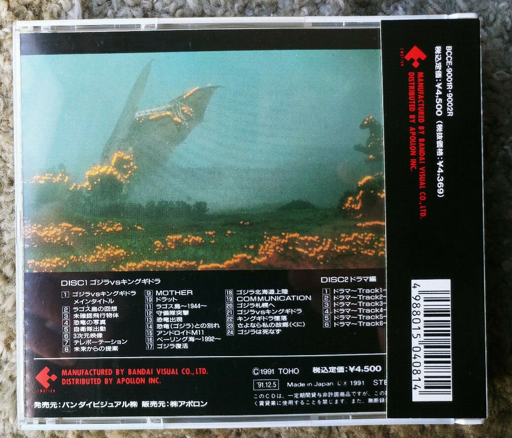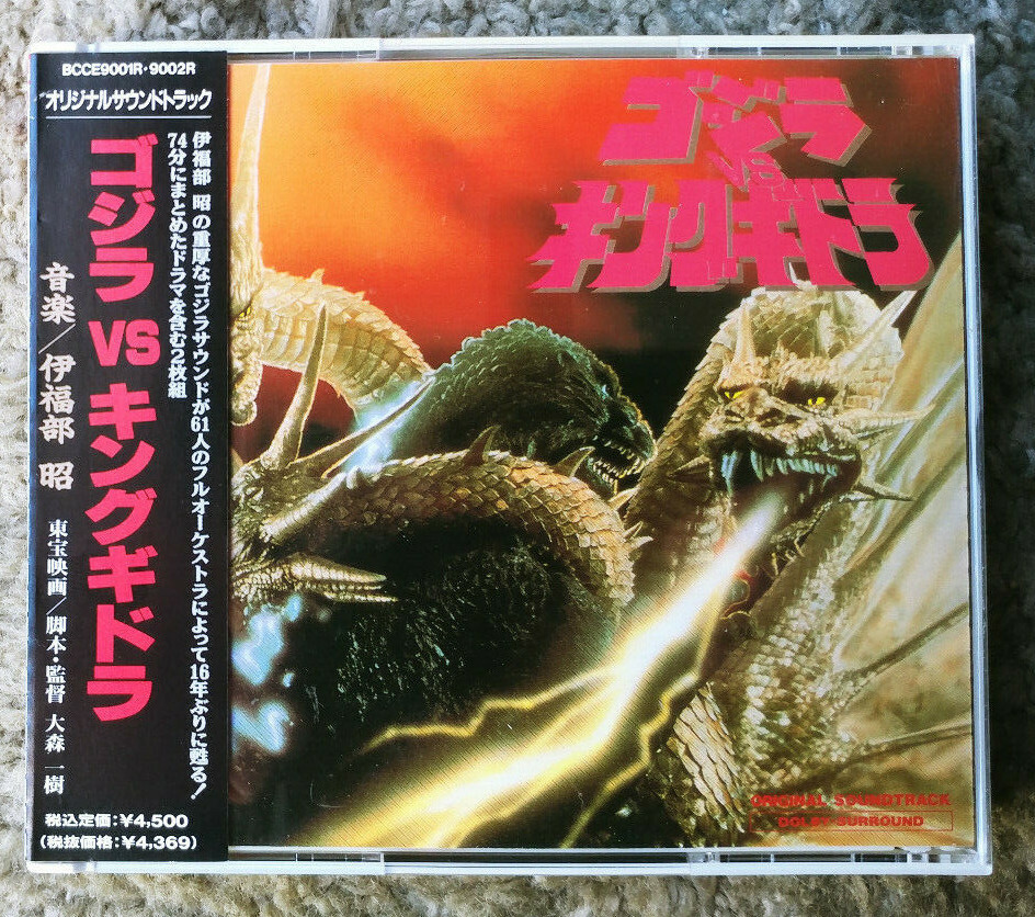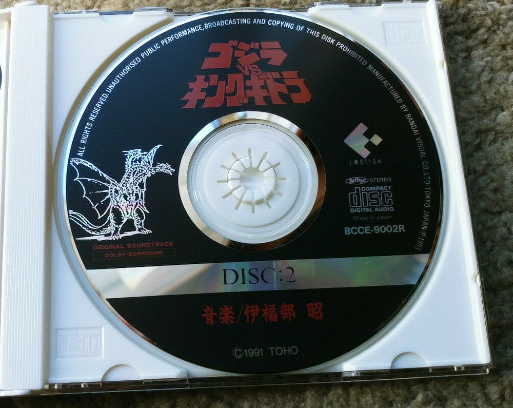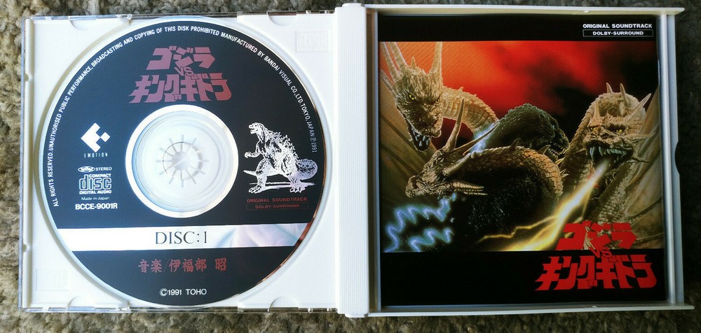 Another Great, Scarce, Out of Print Original Japanese Soundtrack! Godzilla vs King Ghidorah Double CD Set Music by Akira Ifukube Original Japanese Issue! Excellent Condition. Has Original Booklet and OBI. Godzilla vs King Ghidorah 2 CD Set Catalog # BCCE-9001R-9002R. Original 1991 Japanese issue. Now out of print. Disc 1 has 24 tracks, run time: 37:05. Disc 2 has 6 tracks, run time: 74:21 . Case, CD and paperwork are in like new condition. Includes OBI. This is an ORIGINAL soundtrack CD, NOT a CDR for a more detailed review of this classic Japanese SF CD soundtrack ~ Courtesy of my friend Larry T's all encompassing Godzilla music on CD web page ~
