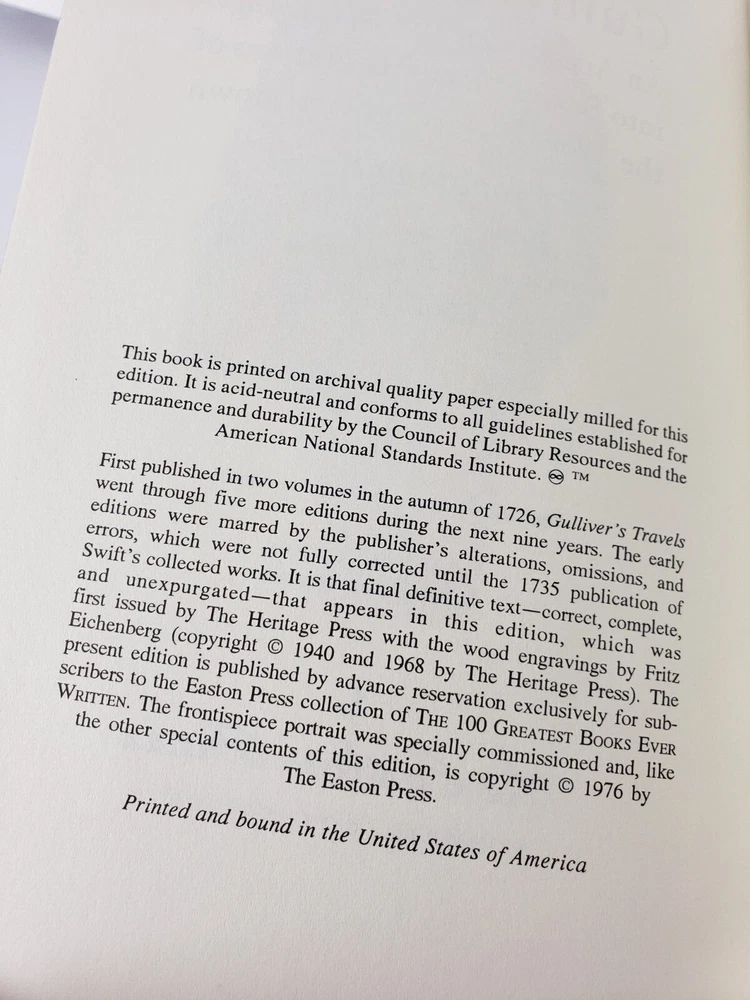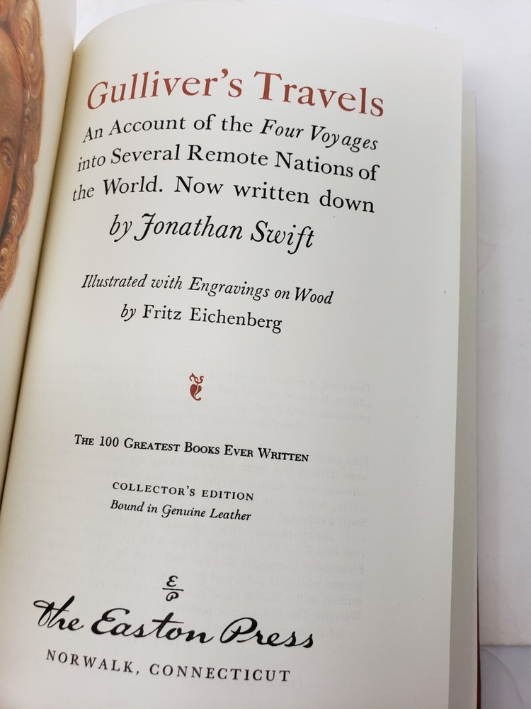 GULLIVER'S TRAVELS An Account of the Four Voyages into Several Remote Nations of the World Easton Press Leather Jonathan Swift Collector's Edition Illustrated with Engravings on Wood by Fritz Eichenberg In Like New, Unread, Near Mint Condition The 100 Greatest Books Ever Written Books Measure 9 3/8" x 6 1/4" Cover is Light Brown with Gold Lettering Ribbon is Bronze Always check out photos for more info on details I AM NOT A PHOTOGRAPHER! Please check out my other sales. Most items I get came from yard sales, Goodwill/Thrift stores and Auctions. I try to list any flaws I see. I definitely am not perfect. If I miss anything of MAJOR proportions, I will definitely make it right. Please note, all of these items are used unless noted. I like to say · I know a lot about a little · I know a little about a lot · I know Everything about NOTHING!