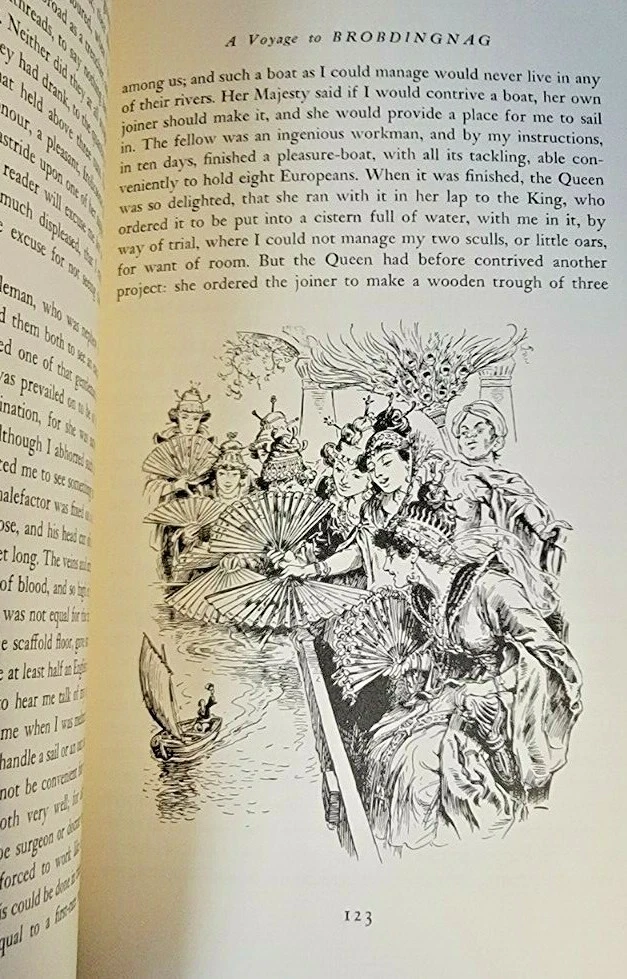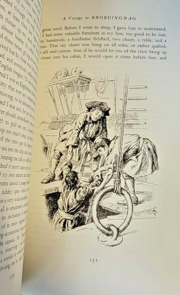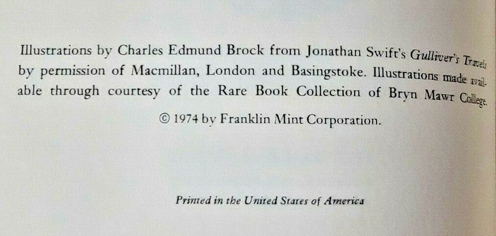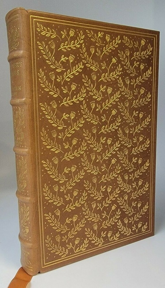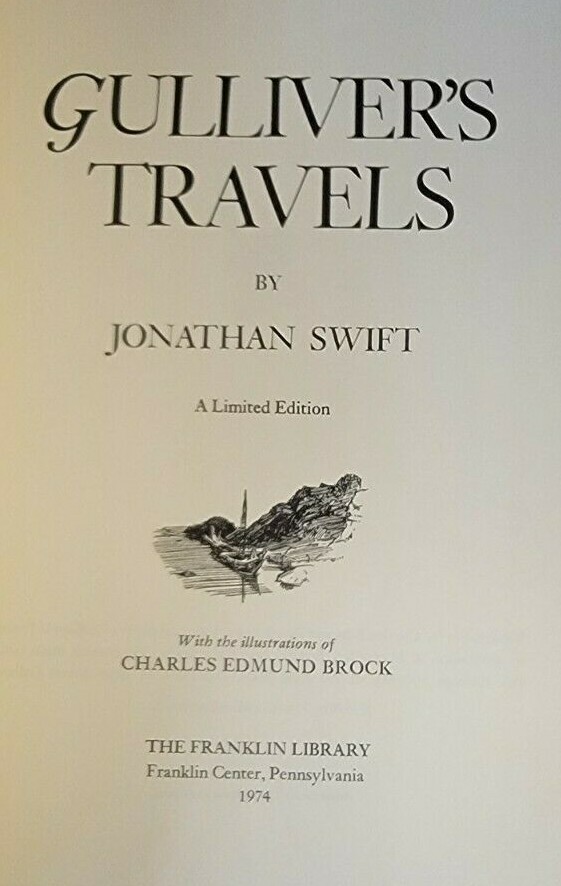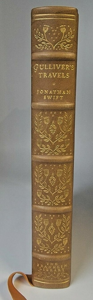 Gulliver's Travels by Jonathan Swift Franklin Library Limited Edition 1st Edition Illustrated Franklin, 1974. VG+. Raised bands, A Limited edition”; full leather with gold lettering and designs ; all edges gilt ; silk moire endpapers ; Illustrated. Light edge wear, surface flaws. Clean, no writing or marks on interior. A solid collectible copy.