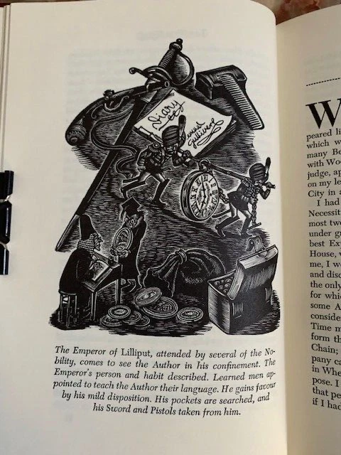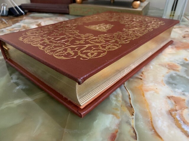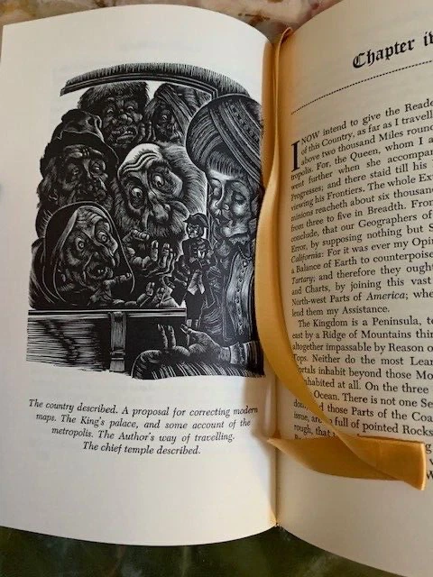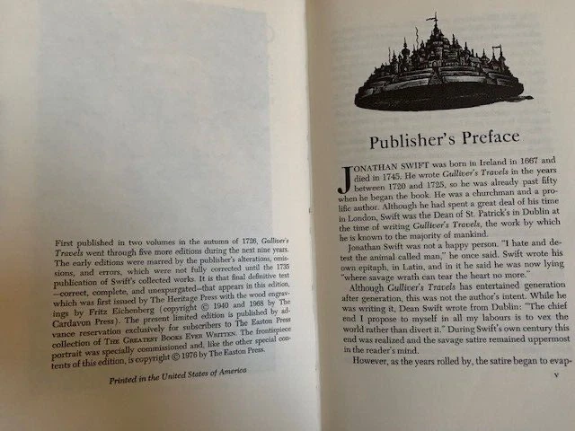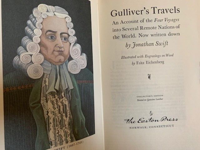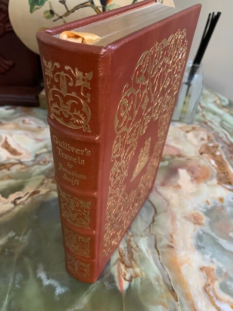 Gulliver's Travels , An Account of the four voyages into several Remote Nations of the World. Now written down by Jonathan Swift. Published by The Easton Press, Norwalk, Connecticut. 1976. Collector's Edition. The Present limited edition is published by advance reservation exclusively for subscribers to The Easton Press collection of THE GREATEST BOOKS EVER WRITTEN. Bound in fine genuine leather with 22 karat gold decorations. All pages edges are gilded with 22K gold. Title of gold is in raised spine hubs. Sewn-in satin ribbon bookmarks. Archival quality acid-free paper specially made for this book. Silk moire fabric for front and back endpapers. Thread-sewn pages for strength and durability. Like New condition. Pages clean and tight, unread. Size of the book: 9.5X6.5X1.5 inch; 2lb.4oz.; Pages:343 pp. Will be shipped via USPS Media Mail with tracking number.