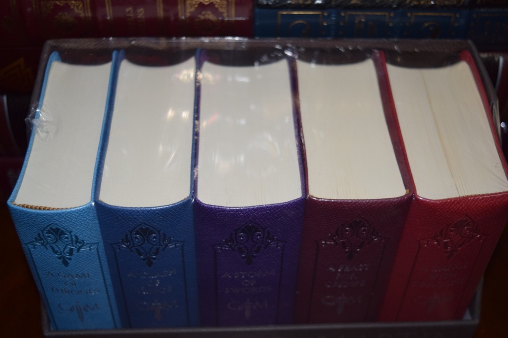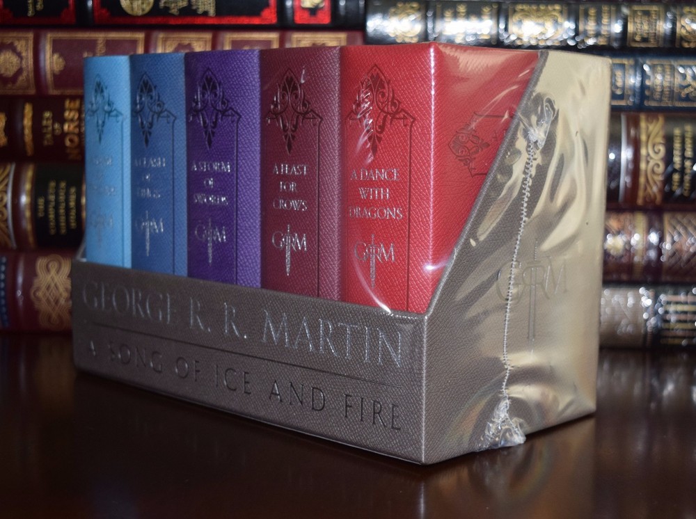 " You must write for children in the same way as you do for adults, only better" -Maxim Gorky. This is a brand new in original shrink wrap leather bound George R. Martin's A Game of Thrones Leather-Cloth Boxed Set: Song of Ice and Fire Series The ultimate collector’s item for fans of the epic fantasy series that inspired HBO’s Game of Thrones—a gorgeous boxed set featuring conveniently sized, hand-holdable leather cloth bound editions of the first five novels! An immersive entertainment experience unlike any other, A Song of Ice and Fire has earned George R. R. Martin—dubbed “the American Tolkien” by Time magazine—international acclaim and millions of loyal readers. Now the monumental saga gets the royal treatment it deserves, with each book wrapped in bound leather-cloth covers and packaged together in an elegant display case. This one-of-a-kind boxed set includes: A GAME OF THRONES A CLASH OF KINGS A STORM OF SWORDS A FEAST FOR CROW A DANCE WITH DRAGONS “One of the best series in the history of fantasy.”—Los Angeles Times Winter is coming. Such is the stern motto of House Stark, the northernmost of the fiefdoms that owe allegiance to King Robert Baratheon in far-off King’s Landing. There Eddard Stark of Winterfell rules in Robert’s name. There his family dwells in peace and comfort: his proud wife, Catelyn; his sons Robb, Brandon, and Rickon; his daughters Sansa and Arya; and his bastard son, Jon Snow. Far to the north, behind the towering Wall, lie savage Wildings and worse—unnatural things relegated to myth during the centuries-long summer, but proving all too real and all too deadly in the turning of the season. Yet a more immediate threat lurks to the south, where Jon Arryn, the Hand of the King, has died under mysterious circumstances. Now Robert is riding north to Winterfell, bringing his queen, the lovely but cold Cersei, his son, the cruel, vainglorious Prince Joffrey, and the queen’s brothers Jaime and Tyrion of the powerful and wealthy House Lannister—the first a swordsman without equal, the second a dwarf whose stunted stature belies a brilliant mind. All are heading for Winterfell and a fateful encounter that will change the course of kingdoms. Meanwhile, across the Narrow Sea, Prince Viserys, heir of the fallen House Targaryen, which once ruled all of Westeros, schemes to reclaim the throne with an army of barbarian Dothraki—whose loyalty he will purchase in the only coin left to him: his beautiful yet innocent sister, Daenerys. ` Shipping I offer a free shipping within USA. Your book may be shipped with USPS/UPS/Laser Ship. If you ordered couple books they may arrive in couple shipmenst. I usually start working on the orders as soon as i receive the order, exept weekends and Holidays. If you need to cancel your order you need to do it as soon as possible. BUT if you have received a msg from me that it is processing I cannot cancel the order because the label has been paid and the book is in transit. Thank you for understanding. I will update the customer with tracking number within 48 Hours. International Shipping No additional import charges at delivery will be imposed if the item is shipped through the eBay's Global Shipping Program which includes international tracking. If the item is shipped through other than the eBay's Global Shipping Program buyers in certain countries are responsible for the import charges at delivery. These are not included in the shipping cost. Returns I offer 14 days return policy. Buyer need to contact me pririor. All items must be in original condition and buyer pays return shipping and 15% restocking fee. If there is something wrong with the item or it was damaged in shipping process buyer needs to send me pictures of the damage and we will start return/ exchange process from there. Thank you Contact us If there any questions or concerns please let us know. Please contact me throught Ebay msg, i do not reply to the personal emails. Froo www.froo.com | Froo Cross Sell, Free Cross Sell, Cross promote, eBay Marketing, eBay listing Apps, eBay Apps, eBay Application Track Page Views With Auctiva's FREE Counter