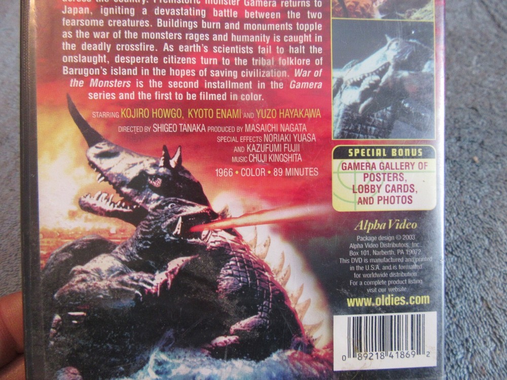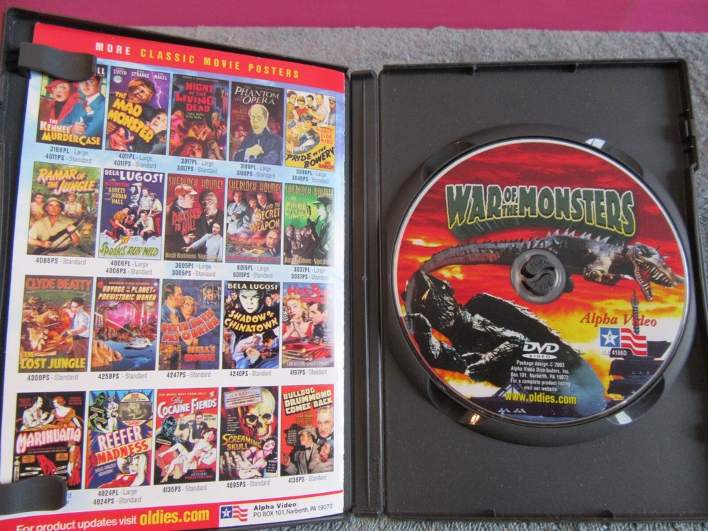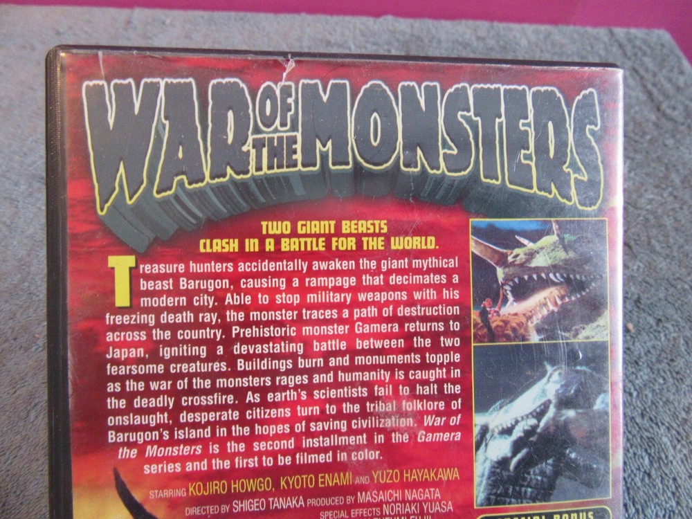 This is a rare hard to find War of the Monsters 1966 in color movie. It has ben reissued in 2003, the disc looks like it has never been played. This will make a great addition to anyone's collection. I do combine shipping on all orders. If you need more photo's or have any questions please email me asap. I'm listing this as used, Please view the pictures to get a look at the quality and condition of each item. Ask questions prior to bidding!! We will be happy to combine shipping whenever possible. Please acknowledge invoice within 3 days. I will email you the USPS tracking #'s and insurance information if needed for your order the same day I ship it out. SHIPPING & REFUNDS: We take every precaution to minimize breakage during shipment through careful packaging. We mark glass and fragile items with brightly colored fragile stickers; however, sometimes they do not receive the handling required for safe arrival. Shipping Confirmation will trace an item, but not replace it. Powered by eBay Turbo Lister The free listing tool. List your items fast and easy and manage your active items. Posted with the eBay Android app