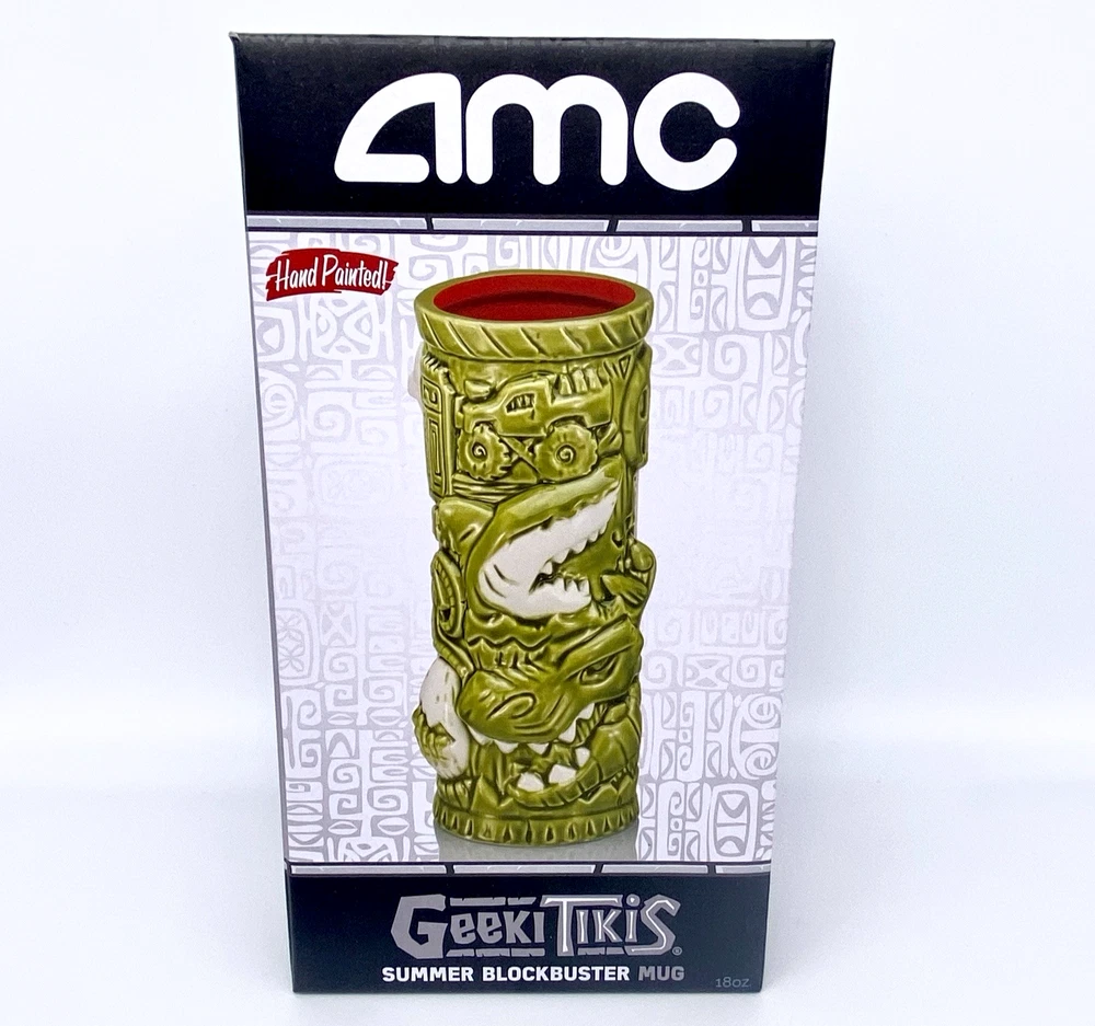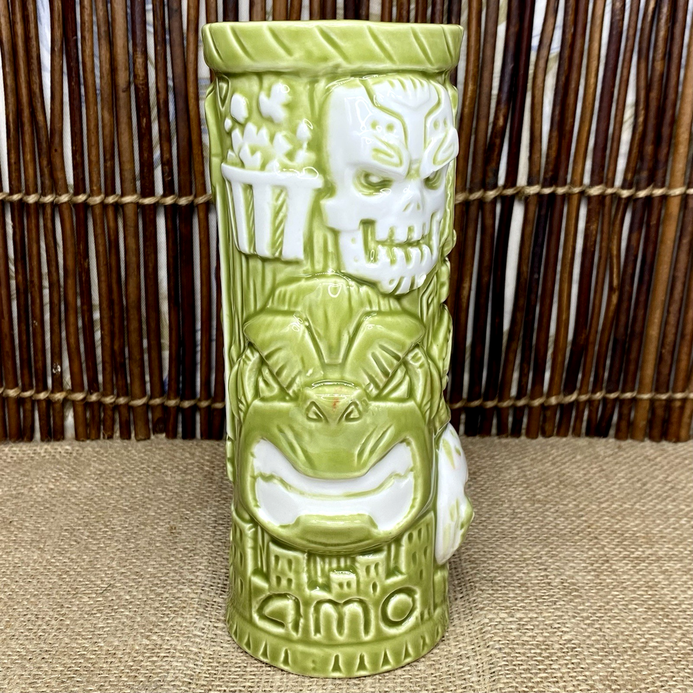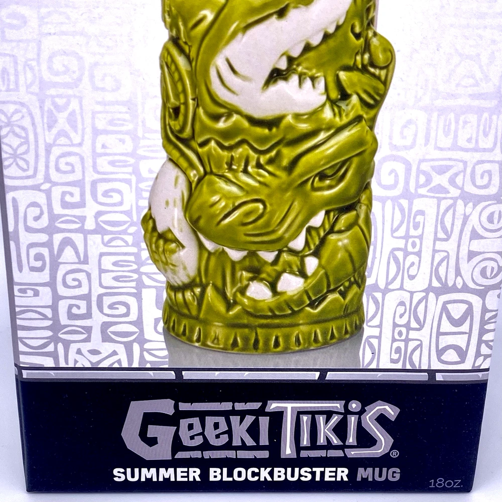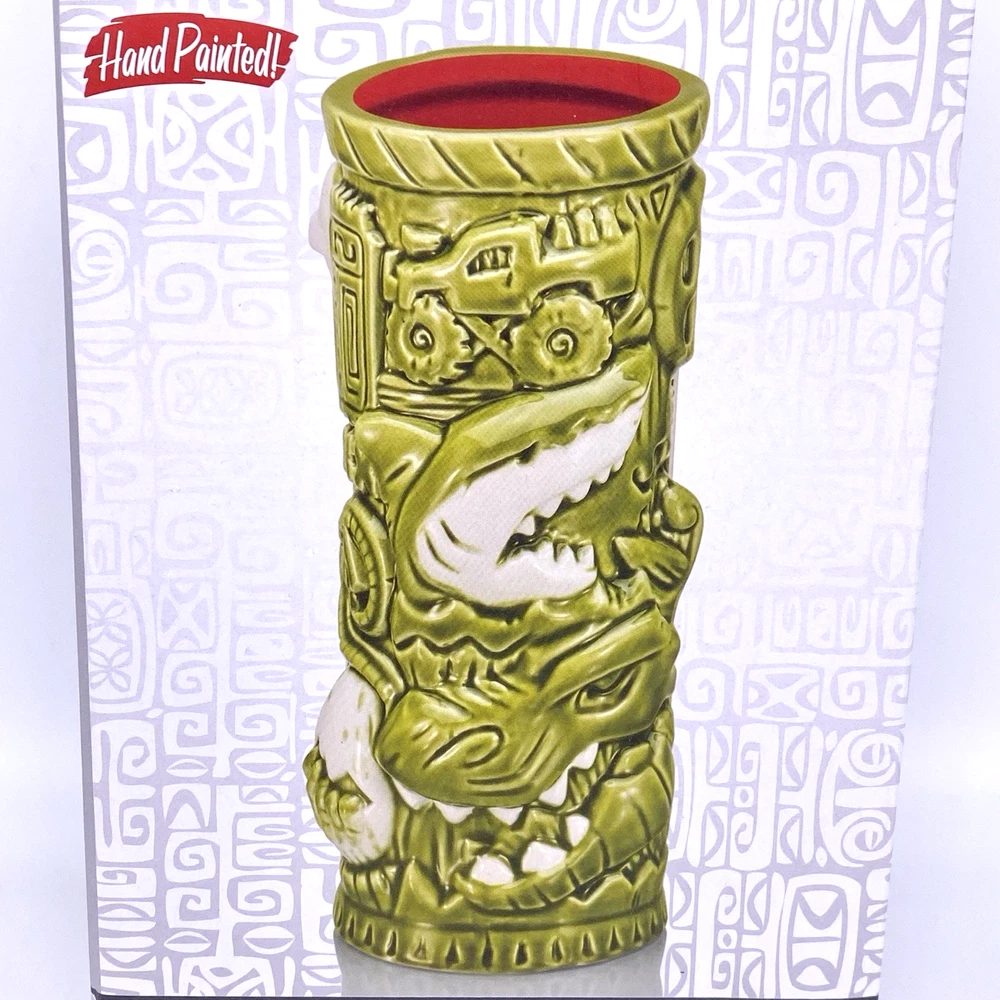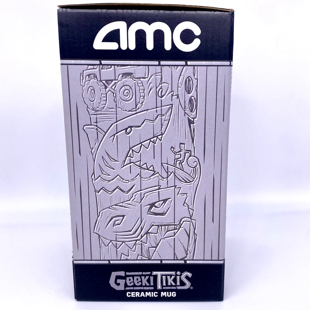 Geeki Tikis Godzilla Jaws Summer Blockbuster SDCC 2024 AMC Exclusive Hand Painted Tiki Mug Approximate measurements 7 1/7 inches tall x 3 inches wide Images features on mug include Godzilla King Kong Monster Truck Jaws Dinosaur Egg Amc Popcorn bucket City Buildings Skull Movie Reel