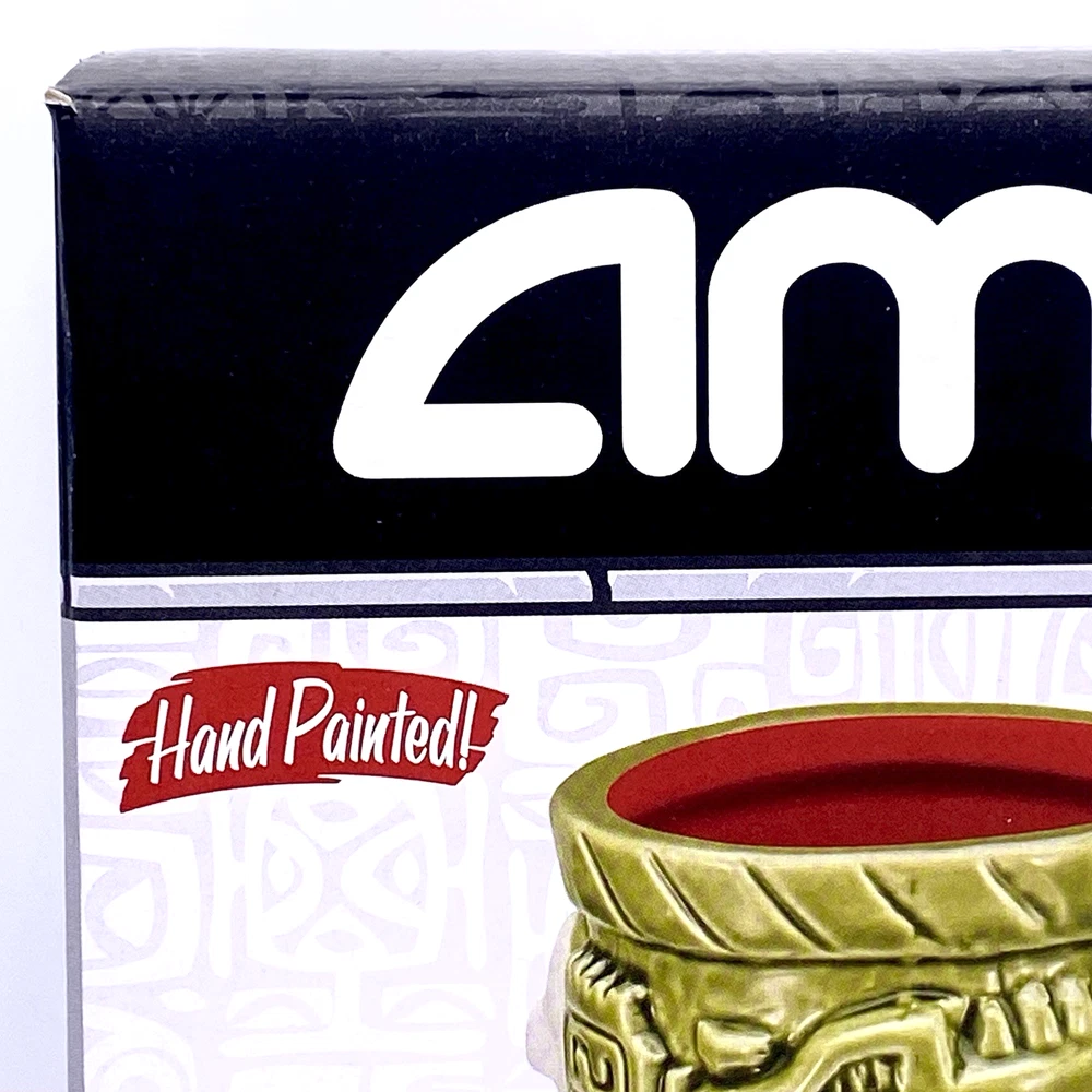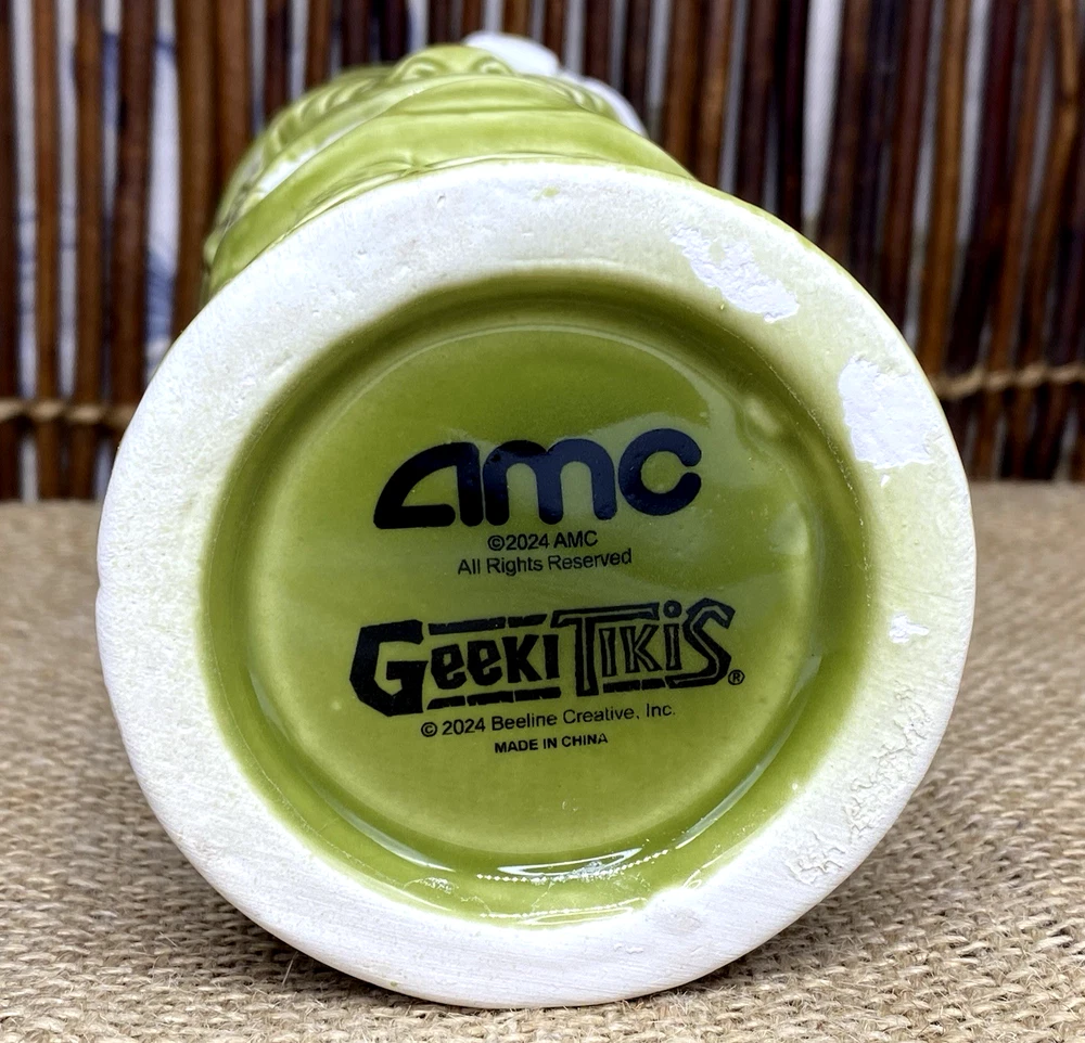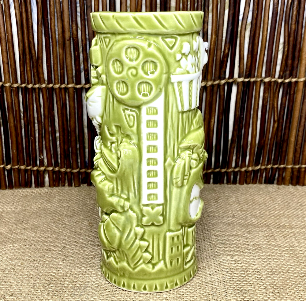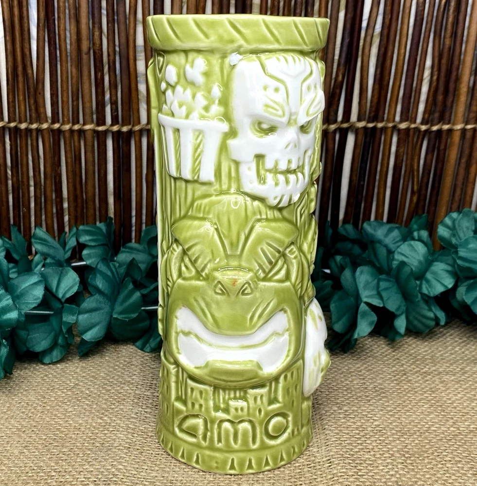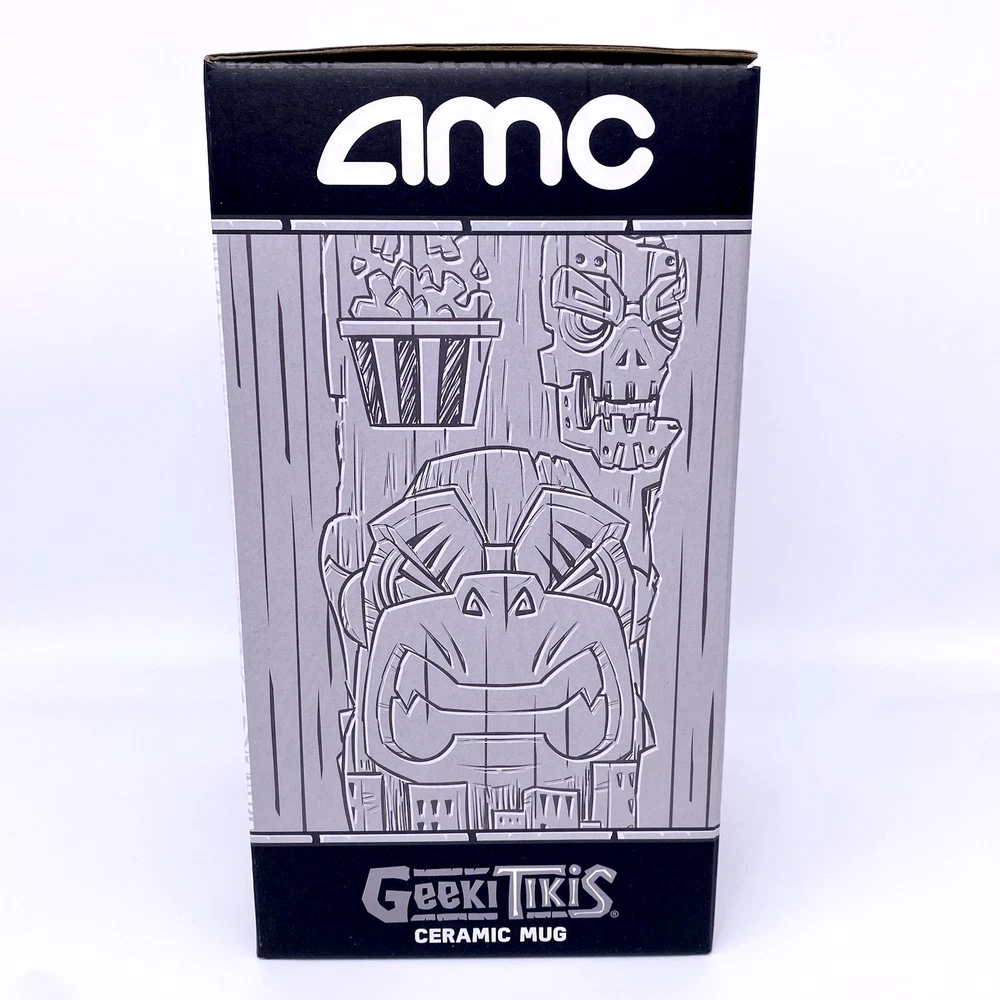 Geeki Tikis Godzilla Jaws Summer Blockbuster SDCC 2024 AMC Exclusive Hand Painted Tiki Mug Approximate measurements 7 1/7 inches tall x 3 inches wide Images features on mug include Godzilla King Kong Monster Truck Jaws Dinosaur Egg Amc Popcorn bucket City Buildings Skull Movie Reel