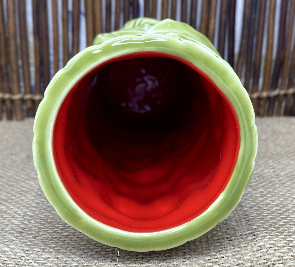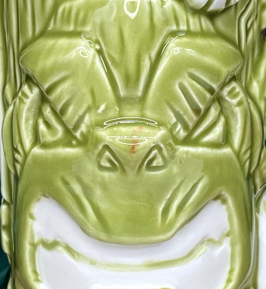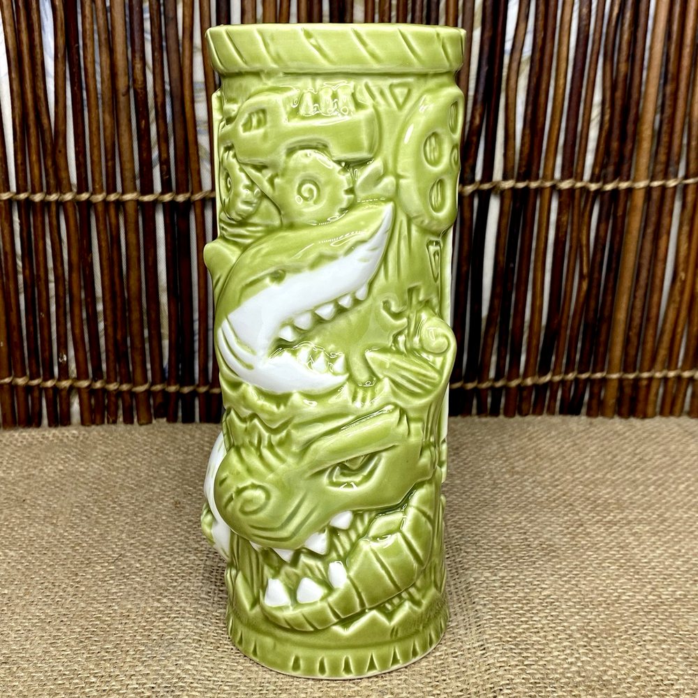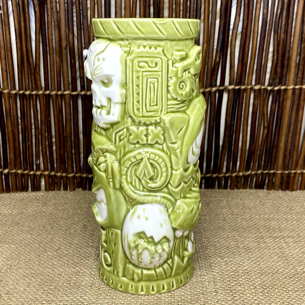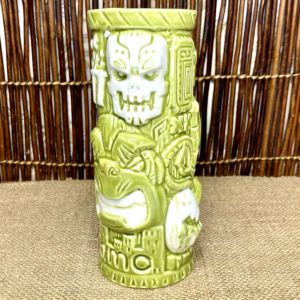 Geeki Tikis Godzilla Jaws Summer Blockbuster SDCC 2024 AMC Exclusive Hand Painted Tiki Mug Approximate measurements 7 1/7 inches tall x 3 inches wide Images features on mug include Godzilla King Kong Monster Truck Jaws Dinosaur Egg Amc Popcorn bucket City Buildings Skull Movie Reel