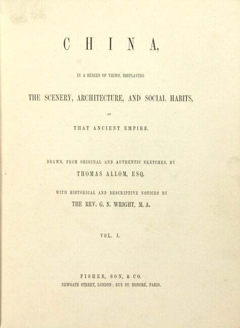 With 128 engraved plates China in a series of views, displaying the scenery, architecture and social habits, of that ancient empire. Drawn, from original and authentic sketches by Thomas Allom, Esq. With historical and descriptive notices by the Rev. G. N. Wright Author: Wright, George N., Rev., & Thomas Allom Title: China in a series of views, displaying the scenery, architecture and social habits, of that ancient empire. Drawn, from original and authentic sketches by Thomas Allom, Esq. With historical and descriptive notices by the Rev. G. N. Wright Publication: London: Fisher, Son, & Co., n.d., [1843] Description: First edition, 2 volumes, 4to, pp. [4], 96; [5], 6-72; [5], 6-68; [5], 6-56; 128 engraved plates including engraved vignette title pages; contemporary diced russia, gilt-paneled spine in 5 compartments, labels wanting in 2, a.e.g.; extremities rubbed, some minor peeling of the leather, vignette title and frontispiece in volume I a little spotted, and very occasional light spotting throughout; in all, a good, sound, and clean copy. Allom's engravings, after drawings from Staunton's collection, show many places in the interior of China which were new to Western eyes, and it was considered "the best-known nineteenth-century work on the subject" (ODNB). Cordier, Sinica, 80-81; Lowendhal 986; Lust 363. Seller ID: 68131 Subject: Asia, China, Illustrated Books, Travel Rulon-Miller Books buys and sells rare, fine and unusual books in many fields, with an emphasis on language, early and unusual printing, voyages and travel, archives, and appraisal services. Catalogs issued regularly. We are members of the Antiquarian Booksellers' Association of America (ABAA). Guarantee All books are guaranteed genuine as described, and are returnable for any reason during the two weeks after receipt. Please notify us as soon as possible if an item is being returned, so that we might make it available to another customer. Shipping We are happy to ship to buyers outside of the United States. Ebay will return an error if international customers attempt to purchase, but please contact us if you are interested in the book and we can correct this. All books shipped to US destinations are sent US Post Office Media Mail. We are happy to send via Priority Mail upon request for the cost of shipping. Priority delivery typically takes 3 to 5 days, but may be longer, especially during the holidays. Faster shipping is available, please contact us for a price quote. For international purchases please contact us directly. We will combine shipping on items purchased at the same time. Feedback We leave feedback for buyers once they have posted feedback for us. If you are unhappy with any aspect of a transaction with us, please contact us immediately. We work hard to keep buyers happy and to resolve the rare problem promptly. This listing was created by Bibliopolis.
