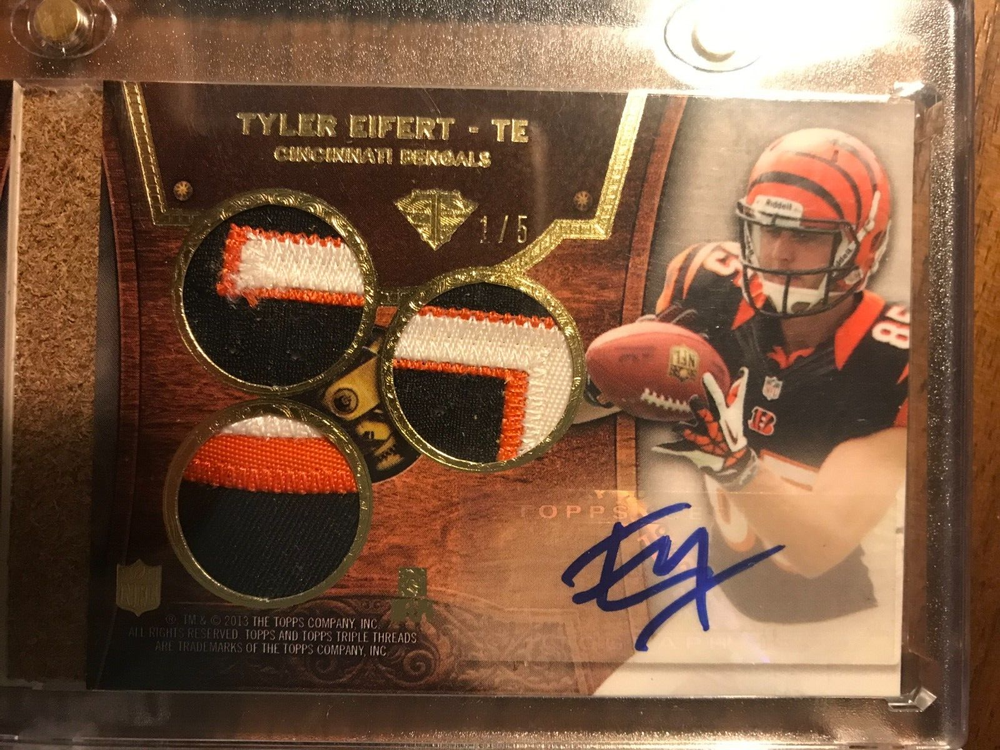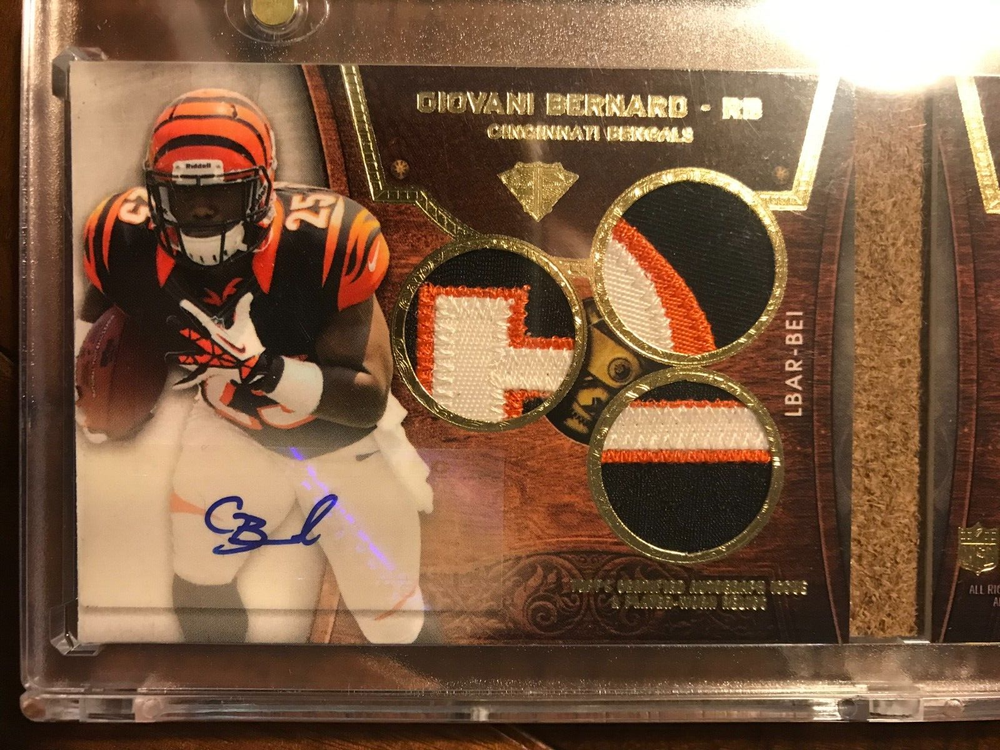 Giovani Bernard & Tyler Eifert 2013 Topps Triple Threads Leather Bound Relic Autograph Booklet rookie card featuing three player worn 3 color jersey patch pieces and rookie autographs in a booklet card bound in actual football leather numbered 1/5. This is a super rare rookie booklet and very cool. This is your opportunity to add this incredible card to your collection. Please look at my other auctions for other great items. Any questions please ask. Due to ebay and paypal policies the charges to ship to Canada are as follows: $12.00 if items total less than $50 to be shiped first class package, $30 if items total less that $150 shipped Priority Mail, $50 if items total over $150 shipped Express Mail. The default total prior to me sending an invoice will be $12, please wait for an invoice reflectiong actual shipping total before paying. Due to increasing costs of postage and shipping supplies Shipping in the USA is $4.00 for the first and $0.25 for each additional item. I Ship Everything in a Padded Envelope and Toploader or Card Protector. All items go straight from packs to sleeves and toploaders or better. All Payments are Due within 8 Days of the End of Auction to Avoid Re-listing of Item or Items. After 4 days a nonpaying bidder case will be opened and after 8 days case will be closed item will be relisted and nonpaying strike will be left. I reserve the right to cancel any bid if you have less than 10 feedback, or an excessive number of negative feedbacks. Please contact me before bidding if this applies to you. Paypal is the only accepted method of payment. I will leave feedback after I ship your item(s). Damaged items accepted as returns only in original packaging so I can file the insurance claim, no original shipping package no refund I'm sorry. I am not responsible for any damage incurred during international shipping, any taxes or fees or delays in delivery due to customs.