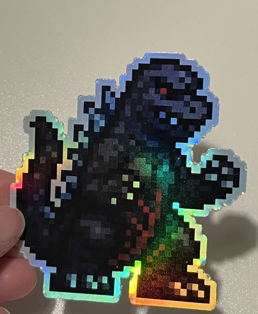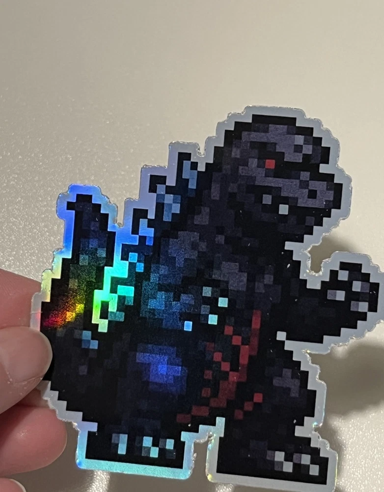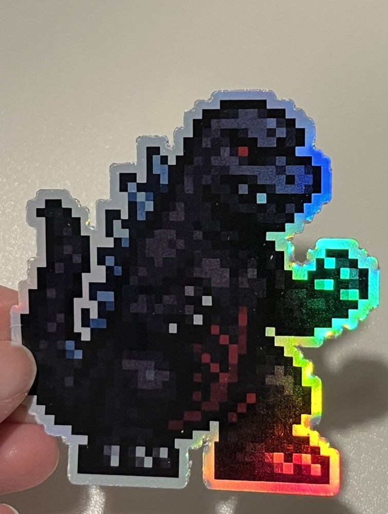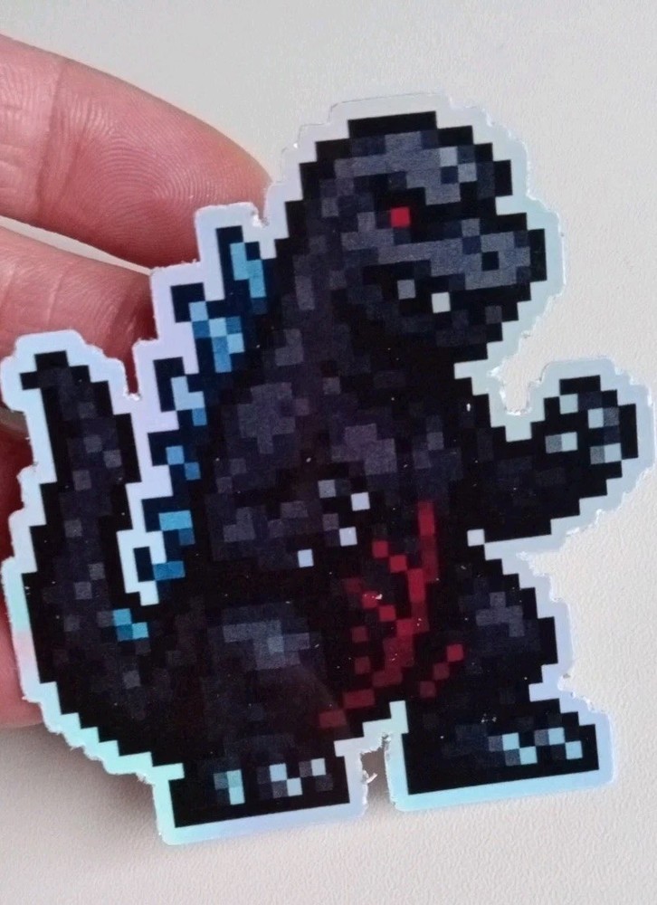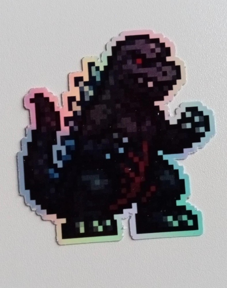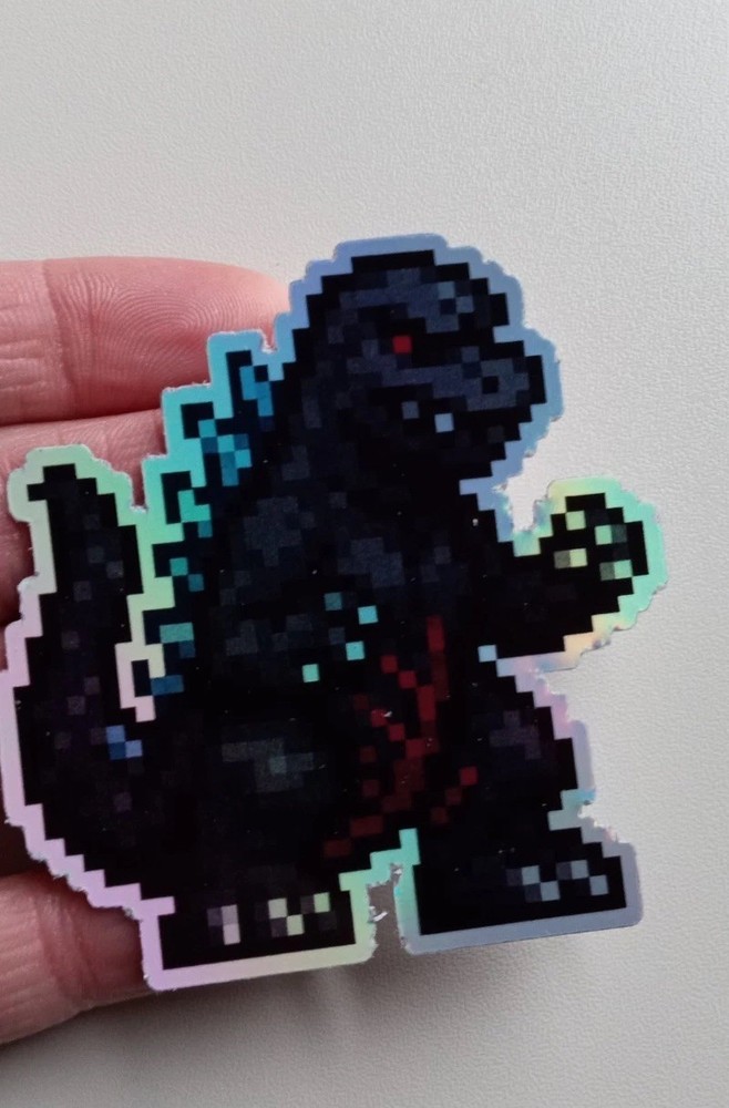 This 3-inch holographic sticker featuring the iconic 16-bit Godzilla character is perfect for any fan. The sticker is made of high-quality materials and is perfect for adding a touch of nostalgia to your home decor. The holographic design adds a unique touch to the sticker, making it stand out from other similar items. Whether you're a collector or just looking for a fun way to decorate your space, this Godzilla sticker is a must-have. It is perfect for use on laptops, phones, and other electronic devices, or even on traditional paper.