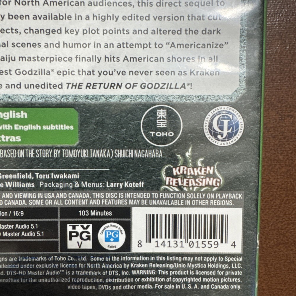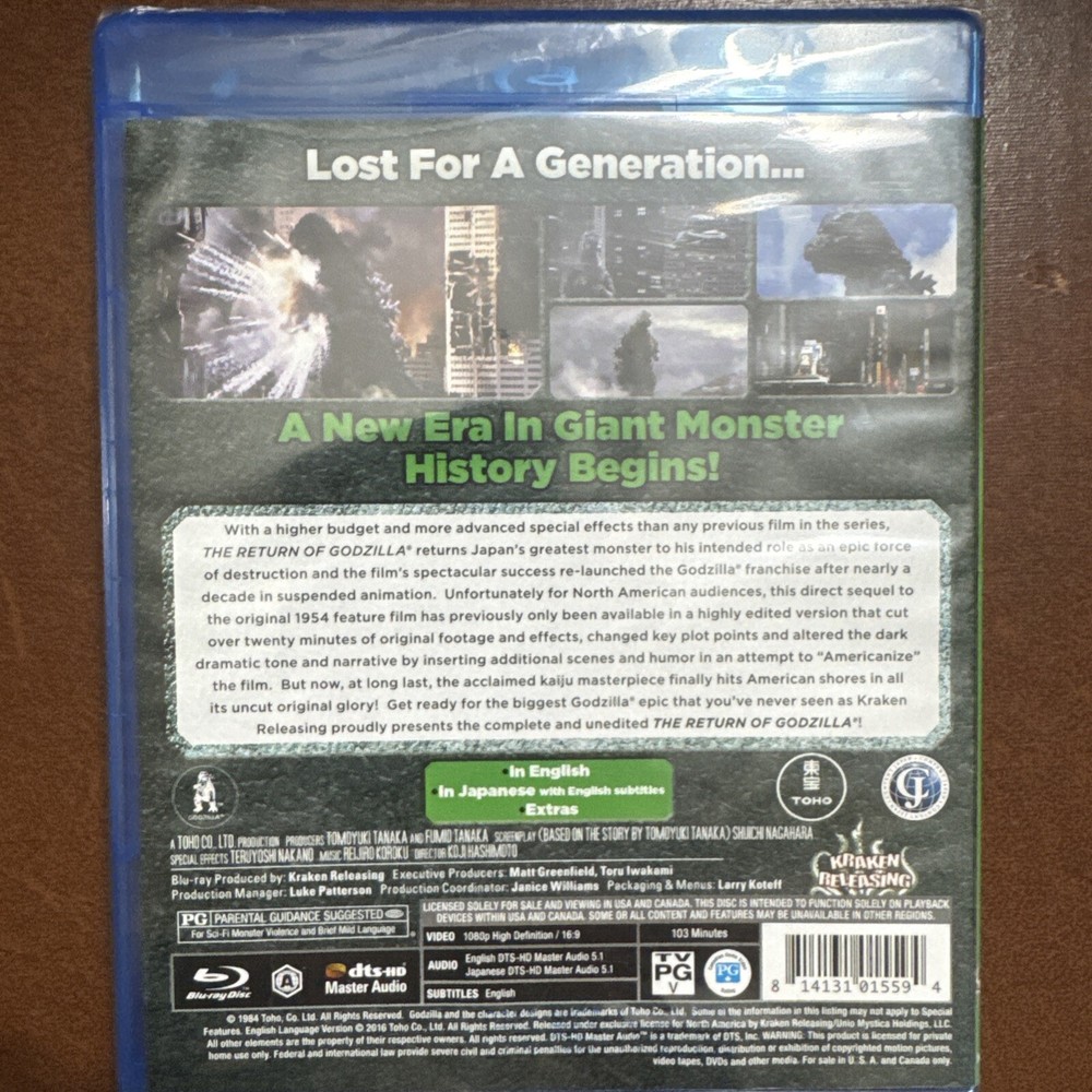 This is a Blu-ray edition of "Godzilla 1984: The Return of Godzilla" by TOHO, released in 2016. The movie is classified as PG and belongs to the genres of Military/War, Sci-Fi & Fantasy, and Horror. It features subtitles in English, with spoken languages in English and Japanese. The Blu-ray is in a Blu-ray case and is uncensored and uncut, with a widescreen format and Region Code A.