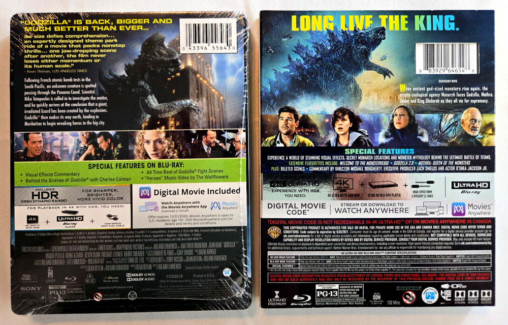 This is an awesome set for any Godzilla fan! The 1998 Steelbook looks amazing in 4K with no damage, and the King of the Monsters slipcover edition is factory-sealed. Both arrived safely in perfect condition—great packaging and fast shipping. Highly recommended for collectors!