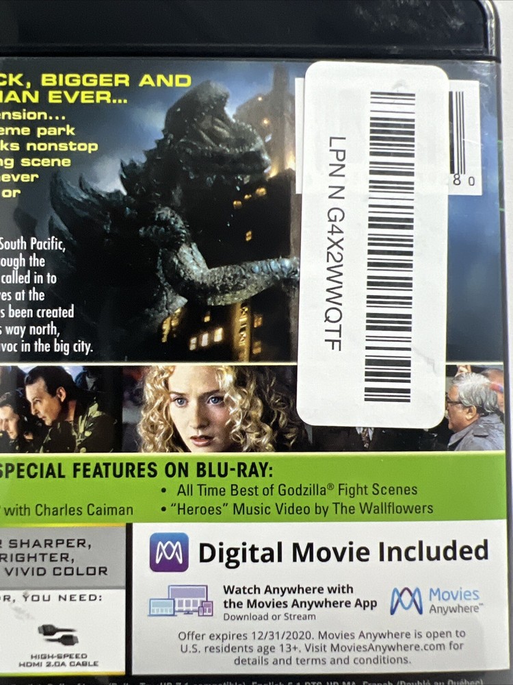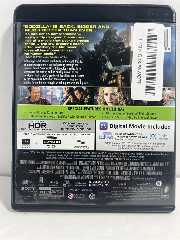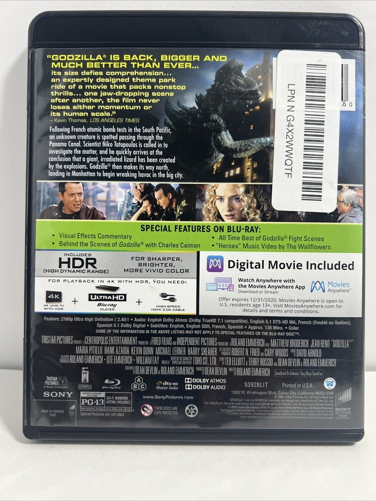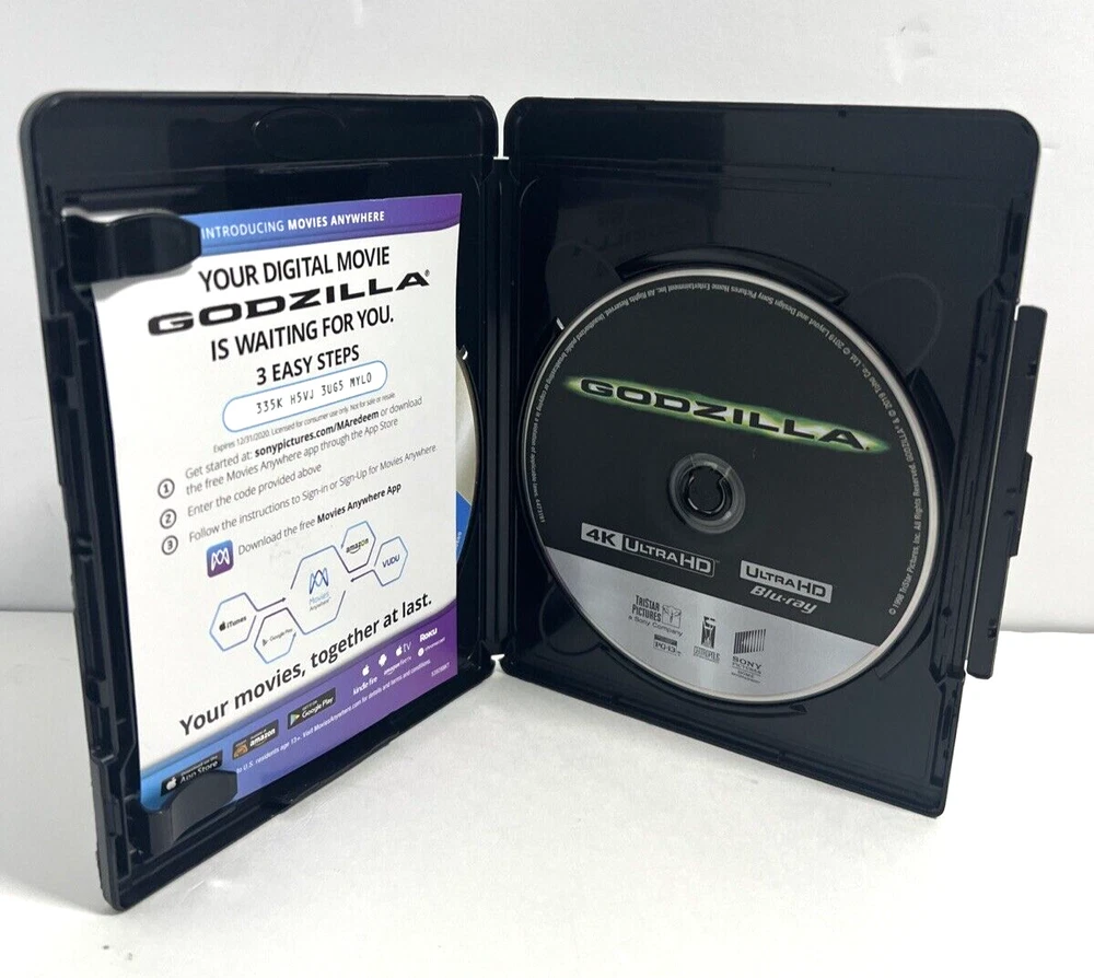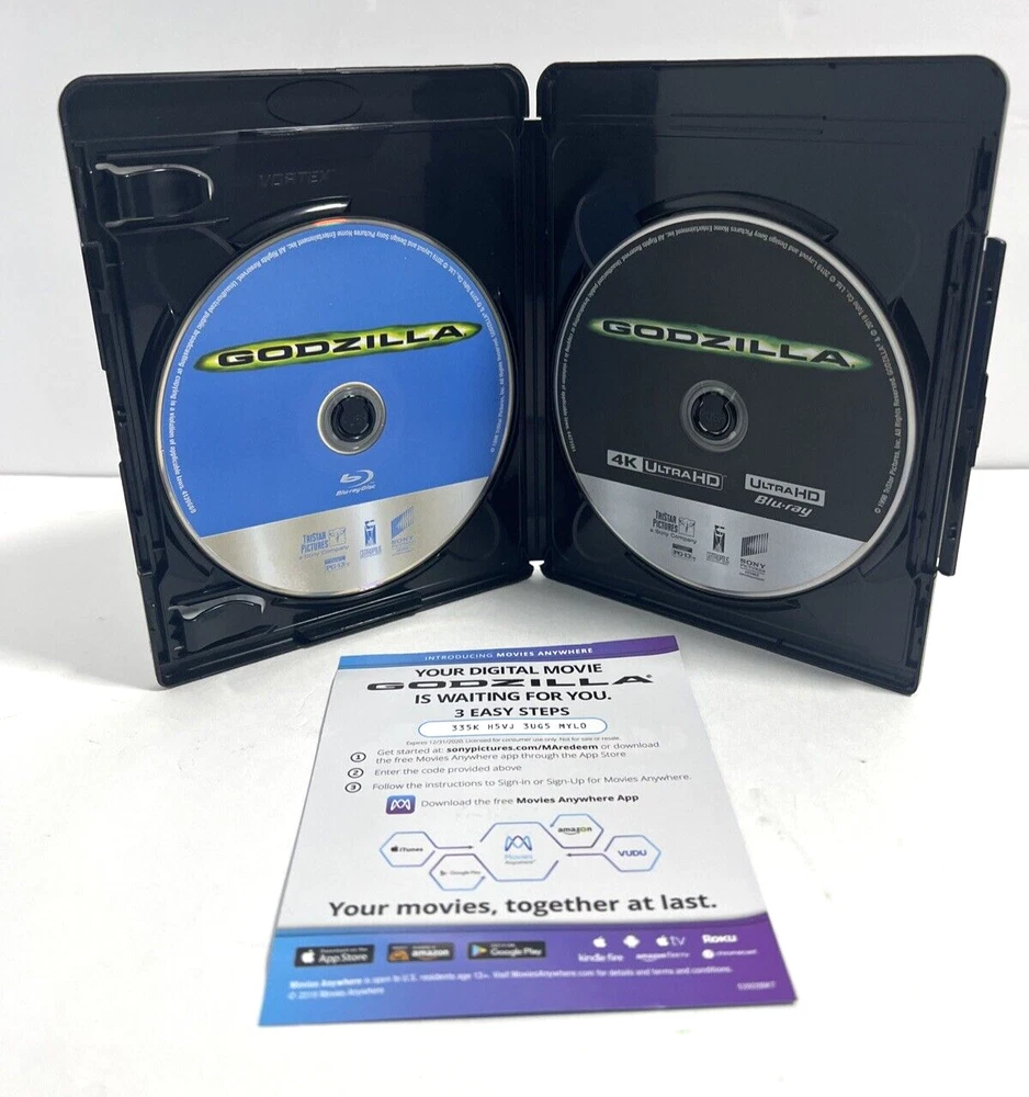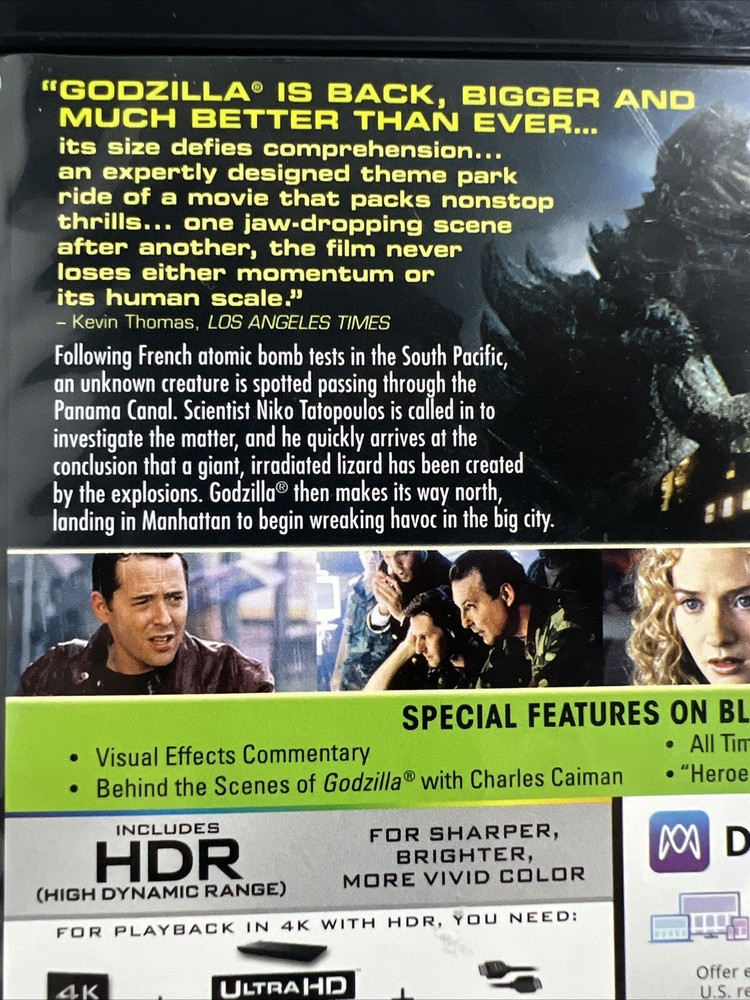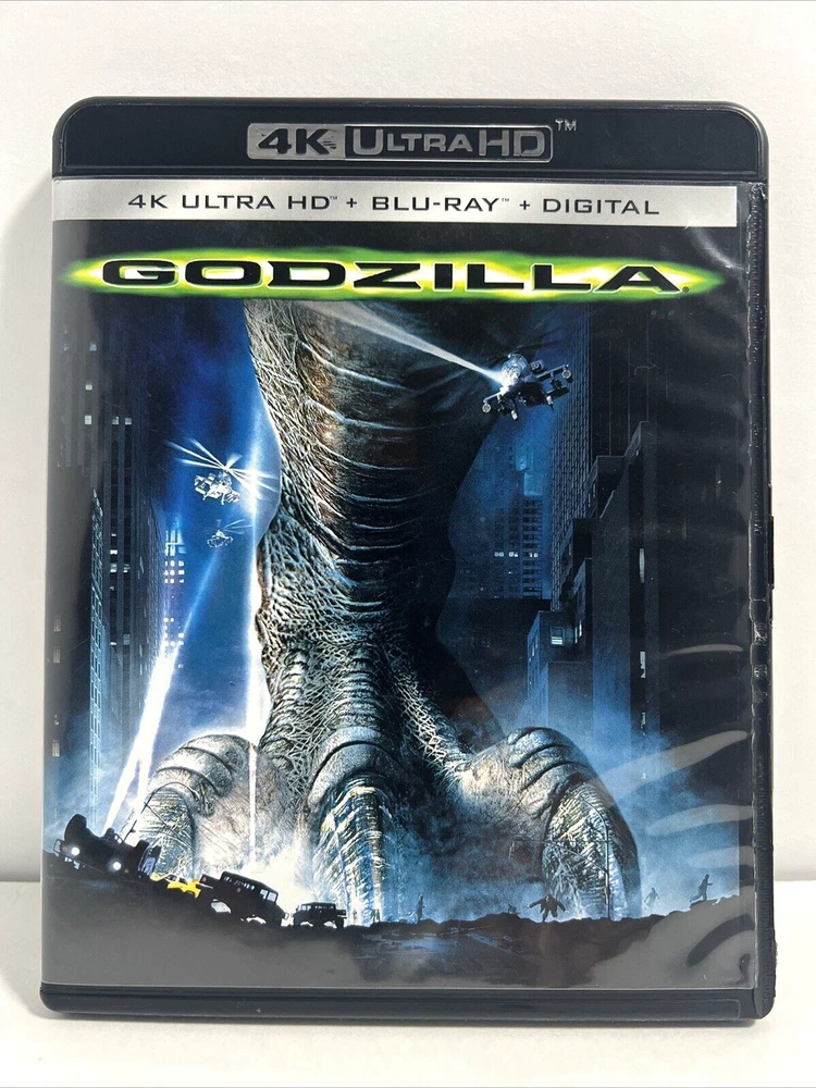Godzilla 1998 4K Ultra HD + Blu-ray, Matthew Broderick, Jean Reno. Very good used condition. FREE SHIPPING. Some items we sell are Pre-Owned but in very good condition. Any flaws or issues we see will be in a photo. ZOOM Into photos ARE part of the description. Shipping is via USPS, FedEx, or UPS. We have a 1-day handling time on all orders unless you order before 9 am EST we can ship the same day.