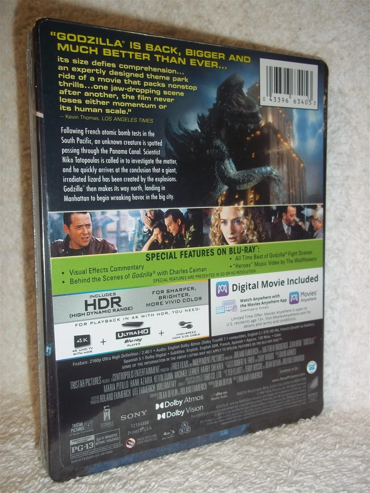 PLEASE READ BELOW BEFORE BIDDING AND ASKING ANY QUESTIONS ITEM DESCRIPTION This 4K/BLURAY is BRAND NEW!! FACTORY SEALED!! NEVER OPENED!! It includes all the original cases, covers, inserts and, of course, the disc(s) itself. he enormous monster descends upon New York, and it's up to the Army and an odd team of investigators to unravel the mystery behind the incredible creature before it's too late. Feature presented in Dolby Vision and Atmos Presented in a limited edition SteelBook Starring: Matthew Broderick Jean Reno Maria Pitillo Hank Azaria Doug Savant Harry Shearer Product Description Leaving a trail of captsized ships and demolished cities, a monstrous reptile known as Godzilla makes his way towards New York City. Seemingly imprevious to traditional weaponry, Godzilla will destroy Manhattan unless scientist Dr. Nick Tatopolous and mysterious French insurance investigator Philippe Roache discover how to stop the monster's rampage. GODZILLA is directed by Roland Emerich and written by Dean Devlin, the team behind INDEPENDENCE DAY. OUR TERMS AND GUARANTEES We will contact the auction winner(s) via email within 24 hours of auction close with any specific instructions that may be necessary to complete the transaction. We will also notify the auction winner(s) when their order has been shipped by sending an email to their ebay email address. WE DO NOT SELL illegal bootleg tapes, copies, screeners, or any type of illegally burned CDs/DVDs! ALL ITEMS ARE FACTORY ORIGINALS and, unless otherwise noted, include their ORIGINAL US factory made cases, inserts/game book and, of course, the items themselves. All DVDs are GUARANTEED. If you receive a damaged, defective or otherwise unusable item from us, please inform us within 15 days of shipment and we will replace the defective product. In the event that the defective item is no longer available, we will substitute for another item, credit your account or issue a refund minus the Shipping. Buyer must make contact within 3 days of the end of auction and payment must be made within 10 days of the end of auction. Please have funds ready to send when you are bidding. Your personal information will never be shared or sold to anyone. Your transaction is strictly confidential, and you will receive your product in discreet packaging . Finally, there should NEVER be a reason to leave us negative feedback. That is NOT the proper way to get our help with a problem, just contact us and give us a chance to provide an appropriate solution. Permanently hurting our reputation by leaving us negative feedback or threatening negative feedback will NOT get you the service you are looking for, again, just email us if you have a problem with your purchase. PAYMENT TERMS Payment is expected within 10 days after the auction closes. Please include the following with your payment: Username Auction number(s) Item name Shipping Address We accept the following forms of payment: . PAYPAL Credit Cards (Contact us for details) SHIPPING TERMS Your DVD(s) will be shipped within 48 hours of receipt of payment. All DVDs will be shipped discreetly . The flat rate shipping fee using USPS FIRST CLASS MAIL is $ 3.00 for the 1st DVD, $2.00 for each additional within the USA . International orders, INCLUDING CANADA, using USPS AIRMAIL are $20.00 for the first DVD, $5 for each additional. Rush and Expedited shipping options are available to most areas; please feel free to contact us for pricing and other details regarding the auction. I COMBINE SHIPPING Please View Our Other Auctions And Save On Shipping Powered by SixBit's eCommerce Solution