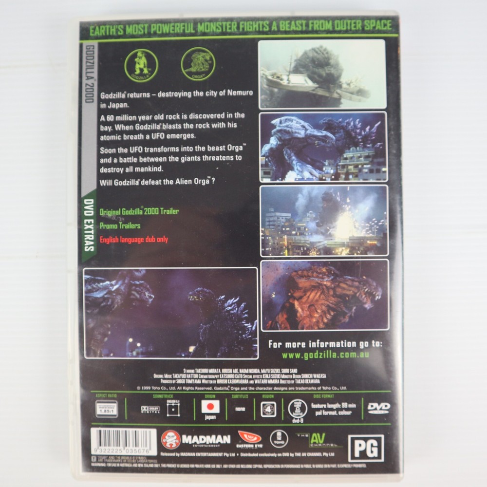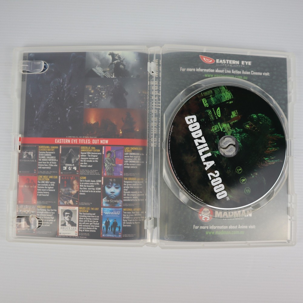 Godzilla 2000 |DVD R4 1999 | Madman Eastern Eye Japanese Sci-Fi Fantasy Embark on a thrilling journey with "Godzilla 2000" on DVD, a captivating blend of action and science fiction fantasy that will keep you at the edge of your seat. Released in 1999 and directed by Takao Okawara, this Japanese cinematic masterpiece comes to you in PAL video format, ensuring a high-quality viewing experience. This DVD is coded for Region 4 compatibility, making it perfect for audiences in Australia, New Zealand, and Latin America. Rated PG and presented in English with subtitles available, it's suitable for a wide audience. The tall DVD case ensures safe storage and longevity of this cult classic, which is a must-have for any avid collector or fan of the genre. DVD is in great condition. Disc is pretty much like new, barely a mark on it. Cover is also in excellent condition. See pics for more details and if there are any questions feel free to contact me and I'll get back to you as soon as I can. Regular postage is free Australia wide via Aus Post.