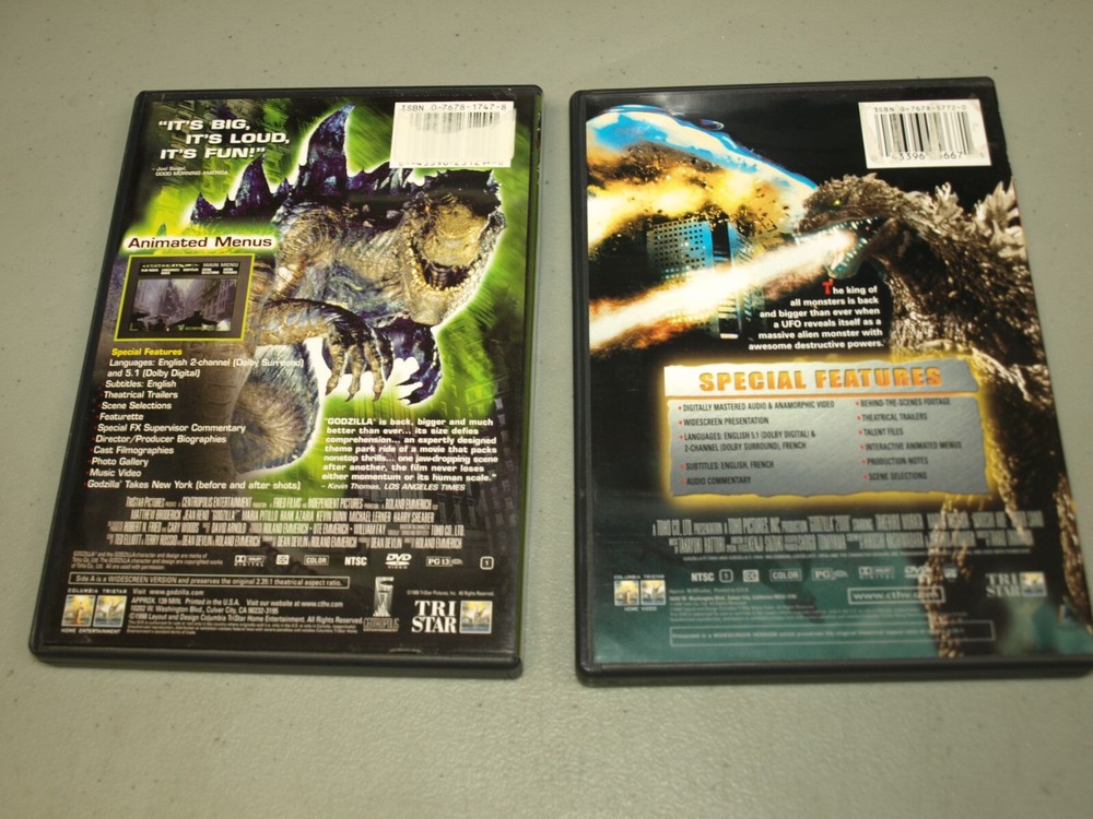 All used disc's are tested that they work before listed. I will give a description on the condition of the disc. Most used cases usually have some scuffs and minor wear on them. See photos for condition of cases. If the disc comes with a insert I will list it. If the description does not say "with insert" than it does not have one. I ship out super fast. Sometimes the same day I receive payment.. Check my feedback. All my customers are very happy. If you ever have a question or a problem with your order just contact me and I'll do my best to solve it. Please make sure your shipping address is correct before buying. I will only ship to the address that is listed with your account. ***FREE SHIPPING**** Godzilla 2000/Godzilla 1998 Version (DVD, 2000) 2 DVD LOT Mathew Broderick