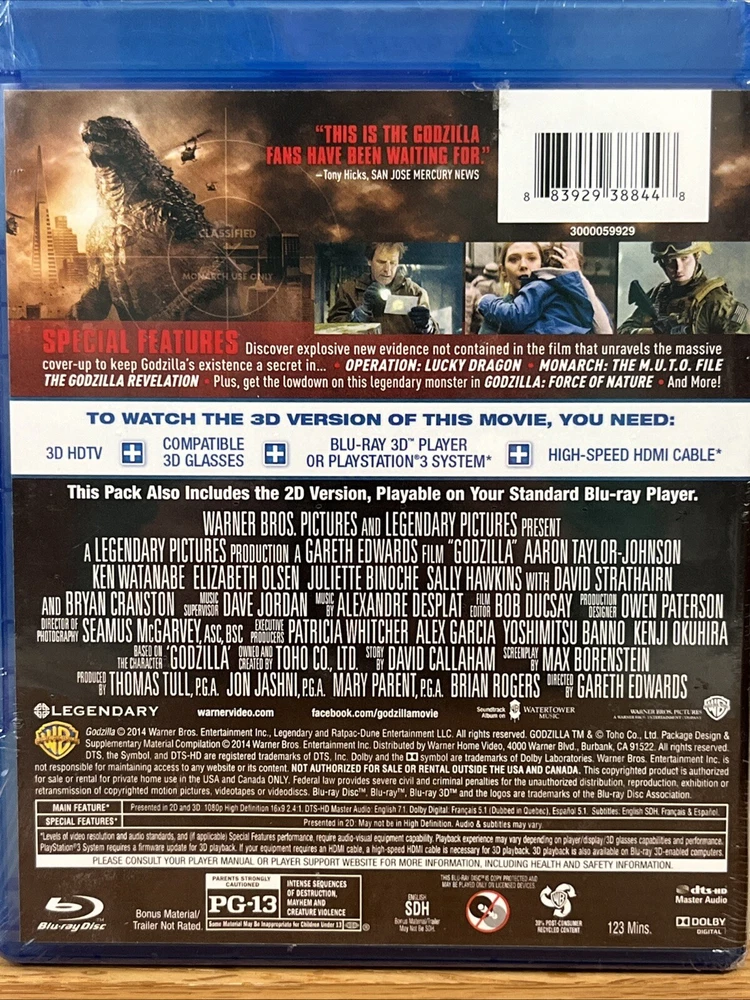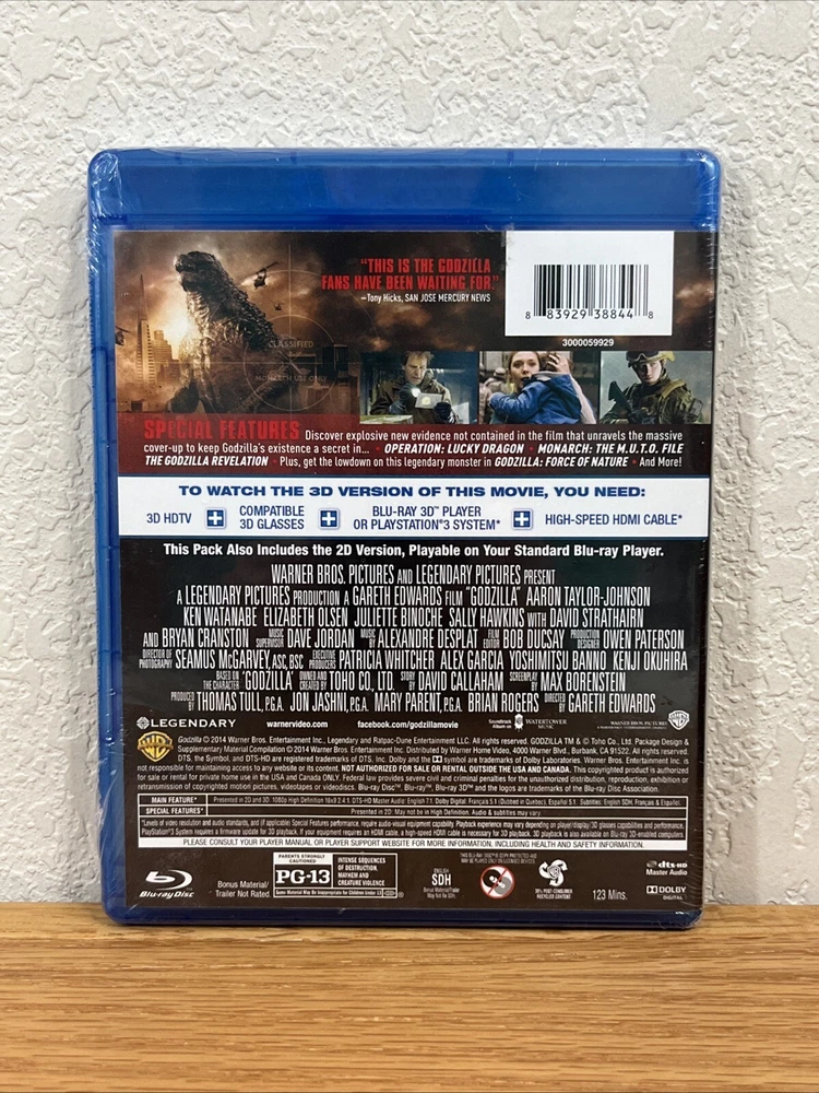 Godzilla (Blu-ray 3D + Blu-ray, 2014) Ken Watanabe / Elizabeth Olsen Widescreen Region A **DIGITAL CODE IS SUBJECT TO EXPIRATION** (if included) Sealed. Cellophane Shows Minor Wear. See Pics! To prevent damage during shipment, items are SAFELY and SECURELY packaged using bubble wrap AND recycled cardboard! PLEASE NOTE: Domestic Shipping is free, via Media Mail, which can take 2 to 12 business days to arrive. USPS Priority shipping is available, at buyer’s expense, if you prefer faster delivery. Please see shipping details within listing, for options and pricing. Please read description and view pics thoroughly. Contact me if you have any questions. I am usually very quick to reply! Thanks for looking!