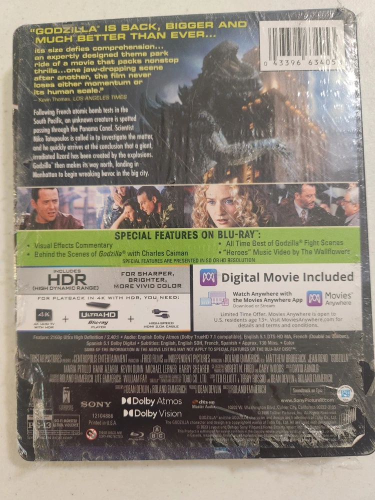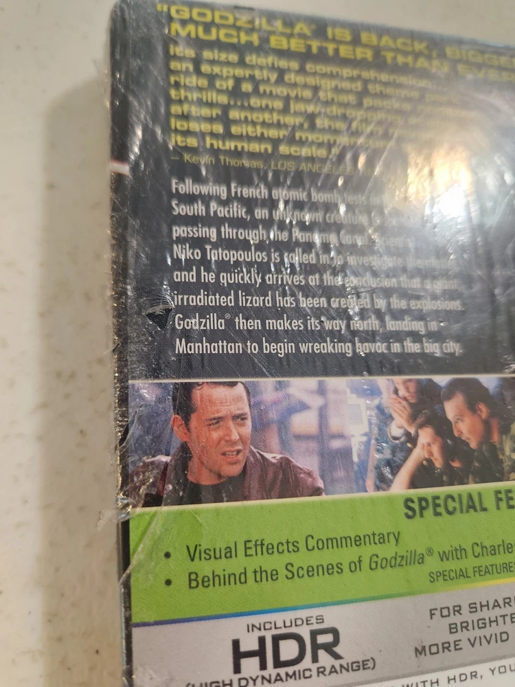 Item Description Up for sale is a Godzilla (4K Ultra HD + Blu-ray, 1998) STEELBOOK . Shrink wrap has several tears and steelbook may have cosmetic issues (dents/dings, etc.). SEE ALL PICS. New. Shipping We gladly combine shipping. We ship according to total weight and not per item. We will send an invoice for combined shipping after purchases are complete. Returns We work really hard to provide excellent customer service and making sure you are satisfied with your purchase. If you are not 100% satisfied with your item please contact us immediately prior to leaving any neutral or negative feedback. Returns are accepted within 30 days of item being received by customer. Please contact us directly before leaving feedback and we will resolve any issues. If the item is damaged or defective please communicate via Ebay messaging and we will be happy to exchange (if applicable) or provide a full refund. Buyers will pay for return shipping on non-defective or non-damaged items and only the purchase price of the item will be refunded. Feedback and Seller Ratings We are working hard to earn positive feedback and 5 stars. This helps us to keep prices and shipping low for our customers. If for any reason you are unhappy with your item and cannot leave positive feedback and 5 stars, please contact us before leaving feedback or comments . We will work with you to resolve any issues. Thank you for looking!!!!