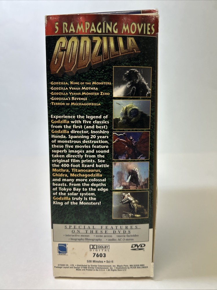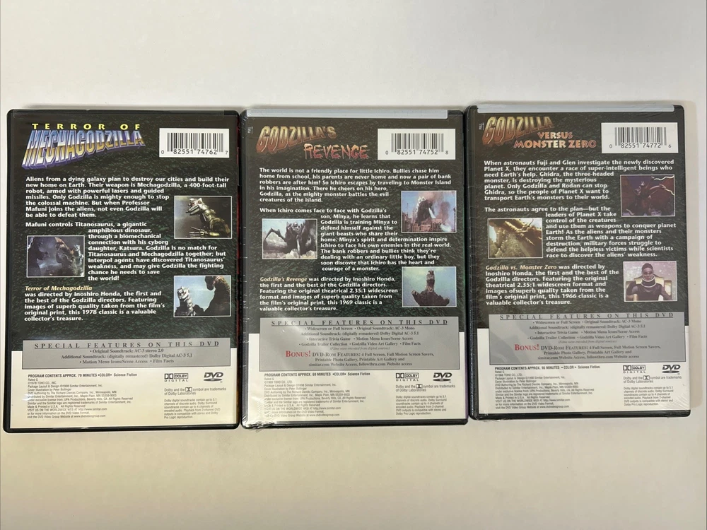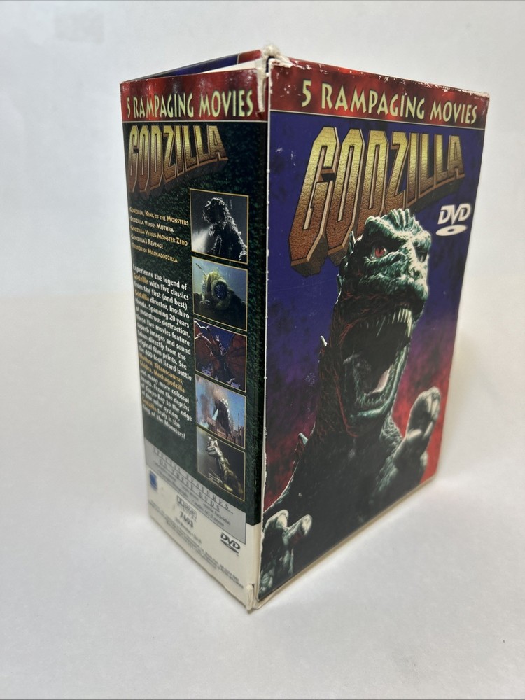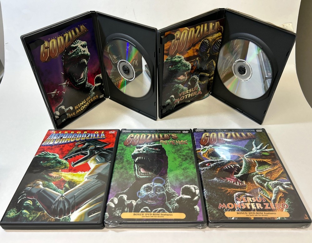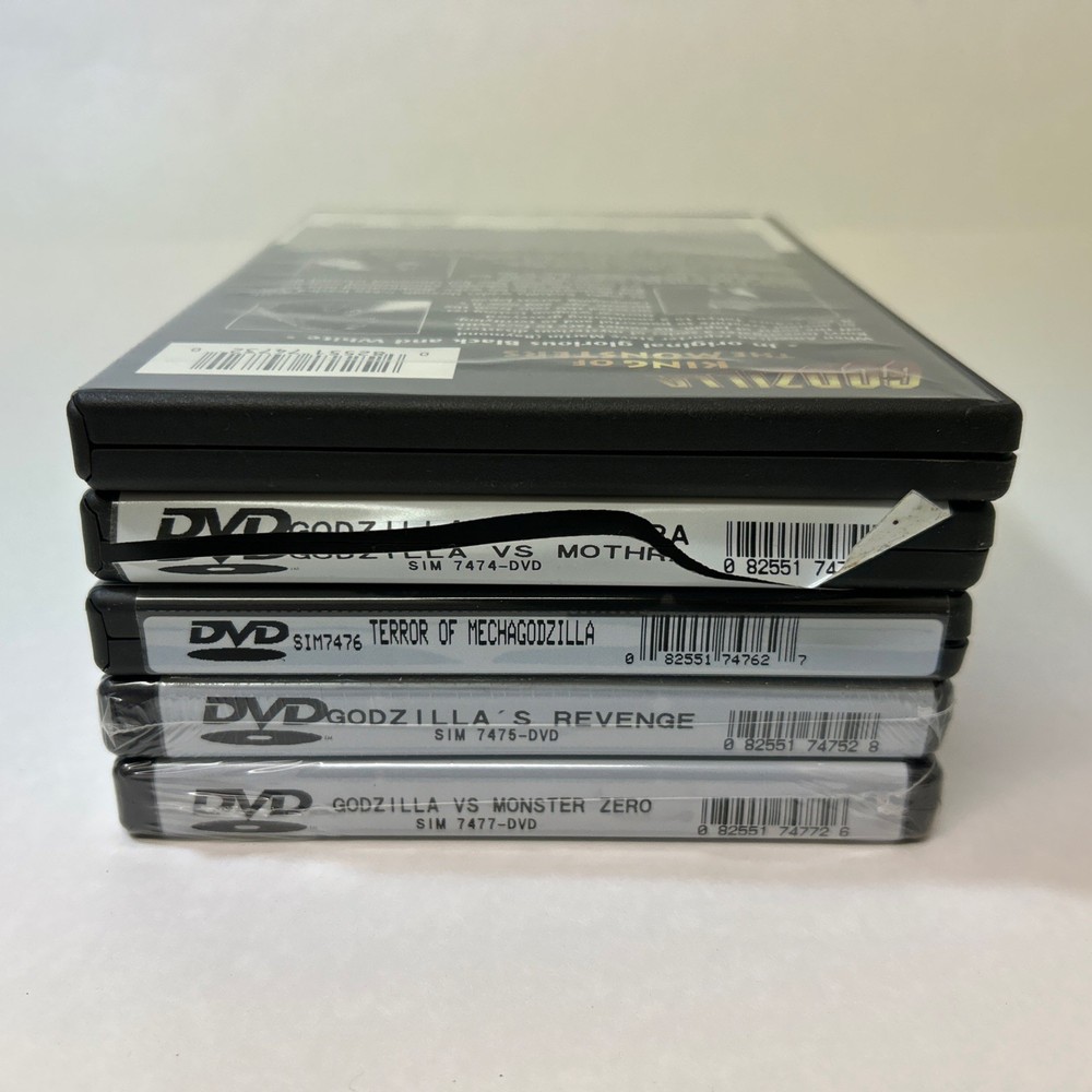 Two of the DVDs cases have been opened and the DVDs used. The remaining three are still sealed. Godzilla King of Monsters - used Godzilla versus Mothra - used Godzilla versus Monster Zero - New with shrink wrap Godzilla’s Revenge - New with shrink wrap Terror of Mechagodzilla - New with no shrink wrap Cases and labels are in great condition, no cuts or tears. Comes complete with inserts, which is in very good condition. Discs are in good condition with only minor scuffs, the two opened discs have both been tested and work great, the remaining three DVDs are new and still sealed. 5996