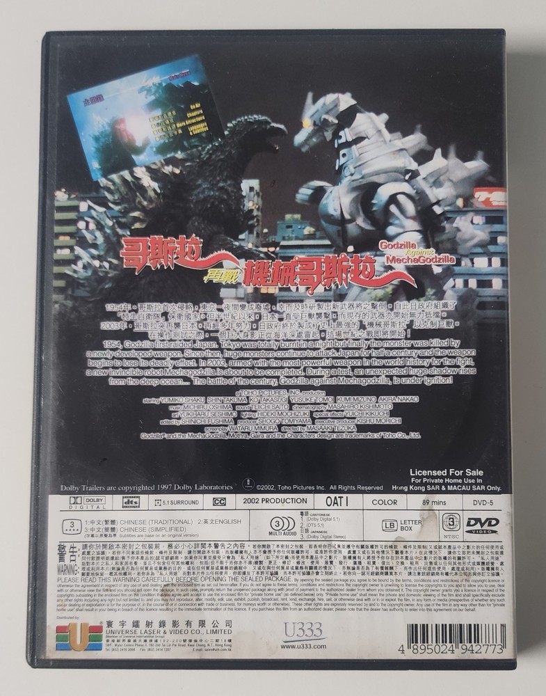 Cover art has smudges as seen in the photos. Ships that day or next and if you have any questions or concerns please feel free to contact me. This DVD features the epic battle between Godzilla and MechaGodzilla in Japanese with English subtitles. The classic sci-fi and fantasy film from Warner Bros is a must-have for fans of kaiju, monsters, and disaster movies. The DVD is formatted in NTSC with a 16:9 aspect ratio and has a run time of 90 minutes. The film is part of the Godzilla franchise and features the iconic creatures, Kaiju and Monsters, in a thrilling and action-packed storyline. The DVD is a tall case edition and is suitable for all ages with a NR (Not Rated) classification. The disc is in excellent working order and is region 3 coded for Southeast Asia, Taiwan, and HK. This is a great addition to any movie collection and a fantastic way to experience the excitement of Godzilla Against MechaGodzilla.