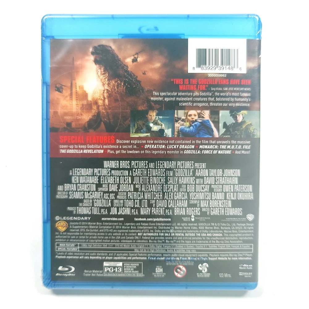Experience the thrill of the latest Godzilla adventure with this Blu-ray edition. Directed by Gareth Edwards, the film features Elizabeth Olson and Bryan Cranston in the lead roles. The movie is rated PG-13 and comes with subtitles in English, French, and Spanish. This standard edition Blu-ray disc is factory sealed and features a run time of 123 minutes. The format is widescreen and the region code is Blu-ray: A (Americas, Southeast Asia...). The Godzilla franchise is known for its monstrous creatures and this film is no exception. Add it to your collection today!