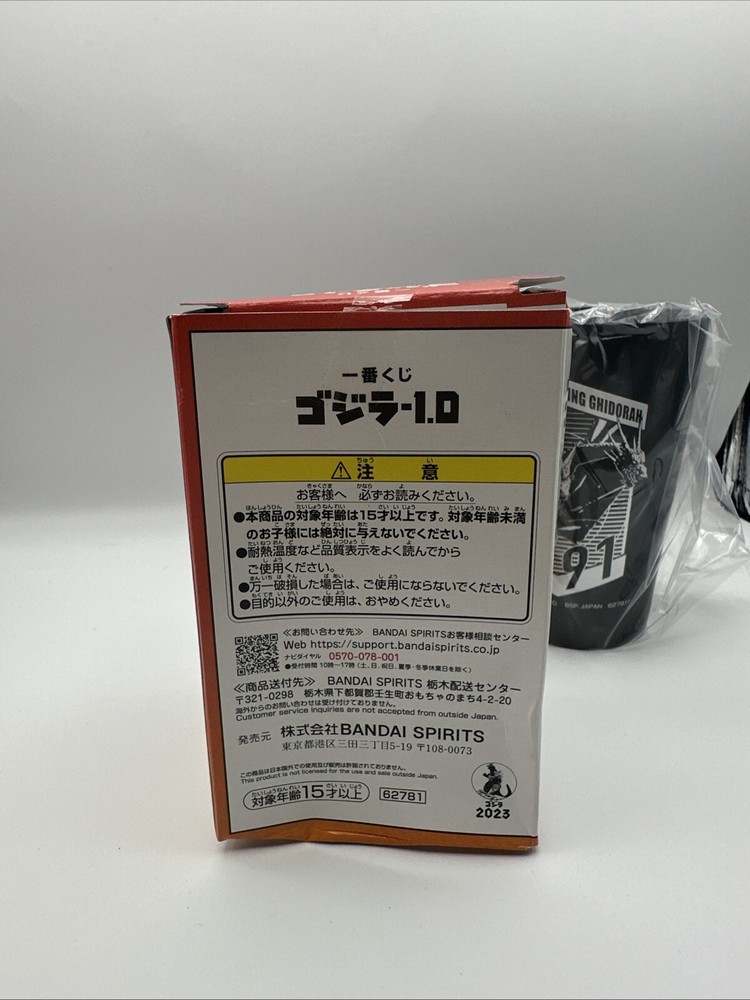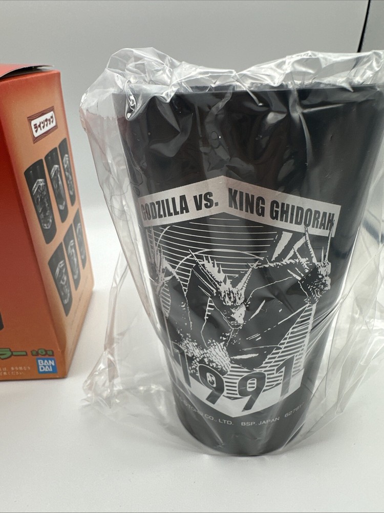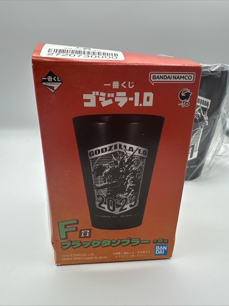 This is a Bandai Godzilla Black Tumbler featuring King Ghidorah, part of the Ichibankuji F series from Japan in 2023. The tumbler is made of plastic and showcases a multicolor design, likely depicting iconic scenes or characters from the Godzilla franchise. This collectible item is a unique piece of animation merchandise that would appeal to fans and collectors of Godzilla memorabilia.