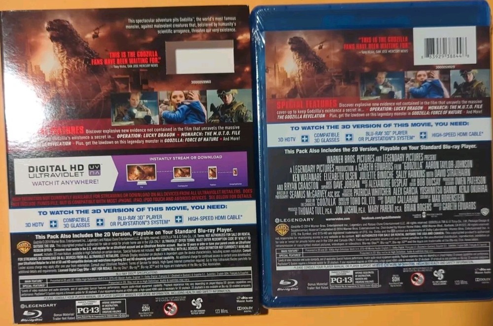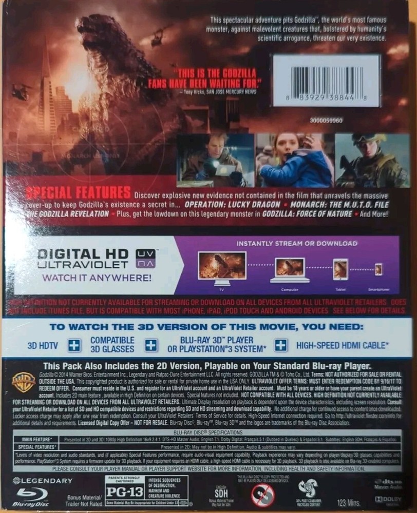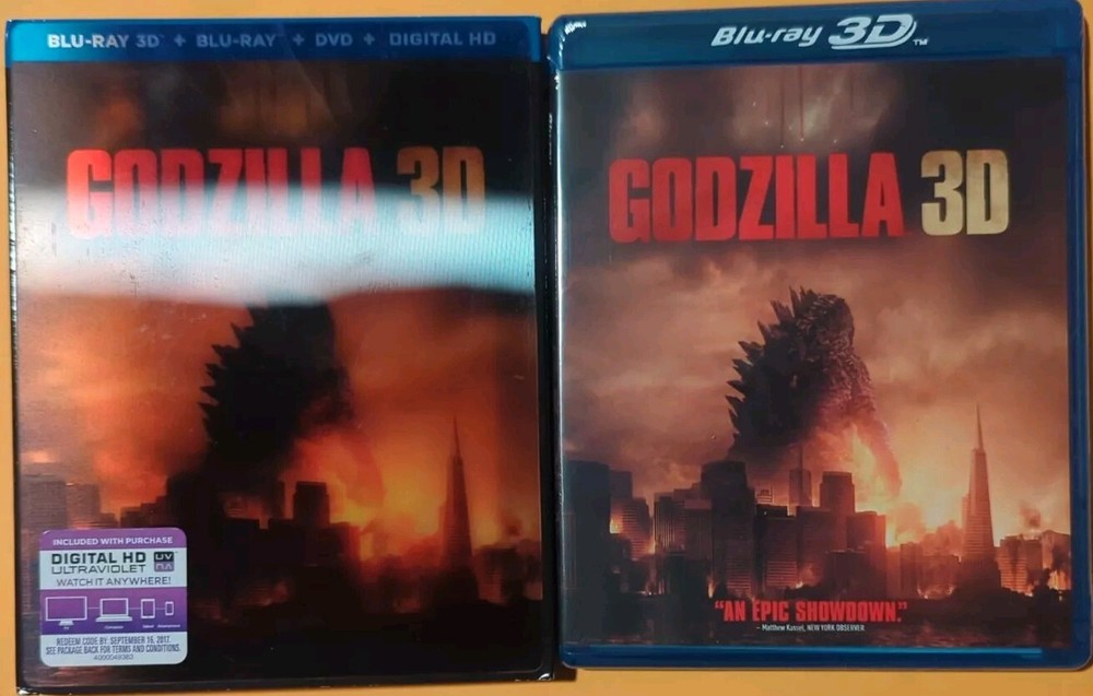Godzilla (Blu-ray 3D +Blu-ray +DVD +Lenticular Slip Cover Factory SEALED free shpg Experience the ultimate disaster movie with Godzilla in Blu-ray 3D. This edition includes a Blu-ray case and a lenticular slip cover, making it a must-have for fans of the iconic monster. The film, directed by Gareth Edwards, is a thrilling adventure that will keep you on the edge of your seat for 123 minutes. The Godzilla Blu-ray 3D edition is a great addition to any movie collection. With its stunning visuals and heart-pounding action, this movie is sure to become a favorite among fans of the genre. Don't miss out on the chance to own this limited edition Blu-ray set, order now and add Godzilla to your movie collection today.