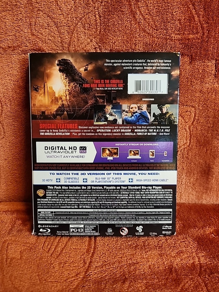 This is a fantastic edition of the 2014 film Godzilla on Blu-ray 3D, including Blu-ray and DVD formats, along with a digital HD copy. The case is a standard Blu-ray case and the run time is 123 minutes. This edition was released by Warner Bros and is perfect for fans of the franchise or film enthusiasts in general. Enjoy the stunning visuals and thrilling action of this epic monster movie!